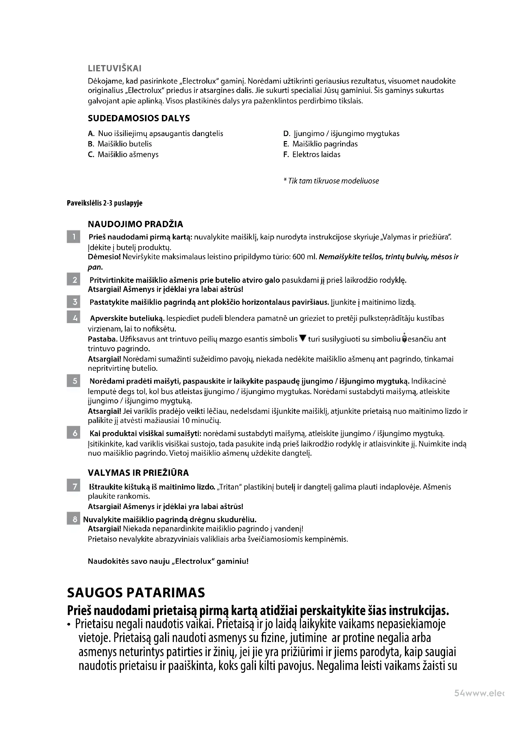 7 Ištraukite kištuką iš maitinimo lizdo. „Tritan“ plastikinį butelį ir dangtelį galima plauti indaplovėje. Ašmenis plaukite rankomis. Atsargiai! Ašmenys ir įdėklai yra labai aštrūs! 8 Nuvalykite maišiklio pagrindą drėgnu skudurėliu. Atsargiai! Niekada nepanardinkite maišiklio pagrindo į vandenį! Prietaiso nevalykite abrazyviniais valikliais arba šveičiamosiomis kempinėmis. Naudokitės savo nauju „Electrolux“ gaminiu! SAUGOS PATARIMAS Prieš naudodami prietaisą pirmą kartą atidžiai perskaitykite šias instrukcijas.
