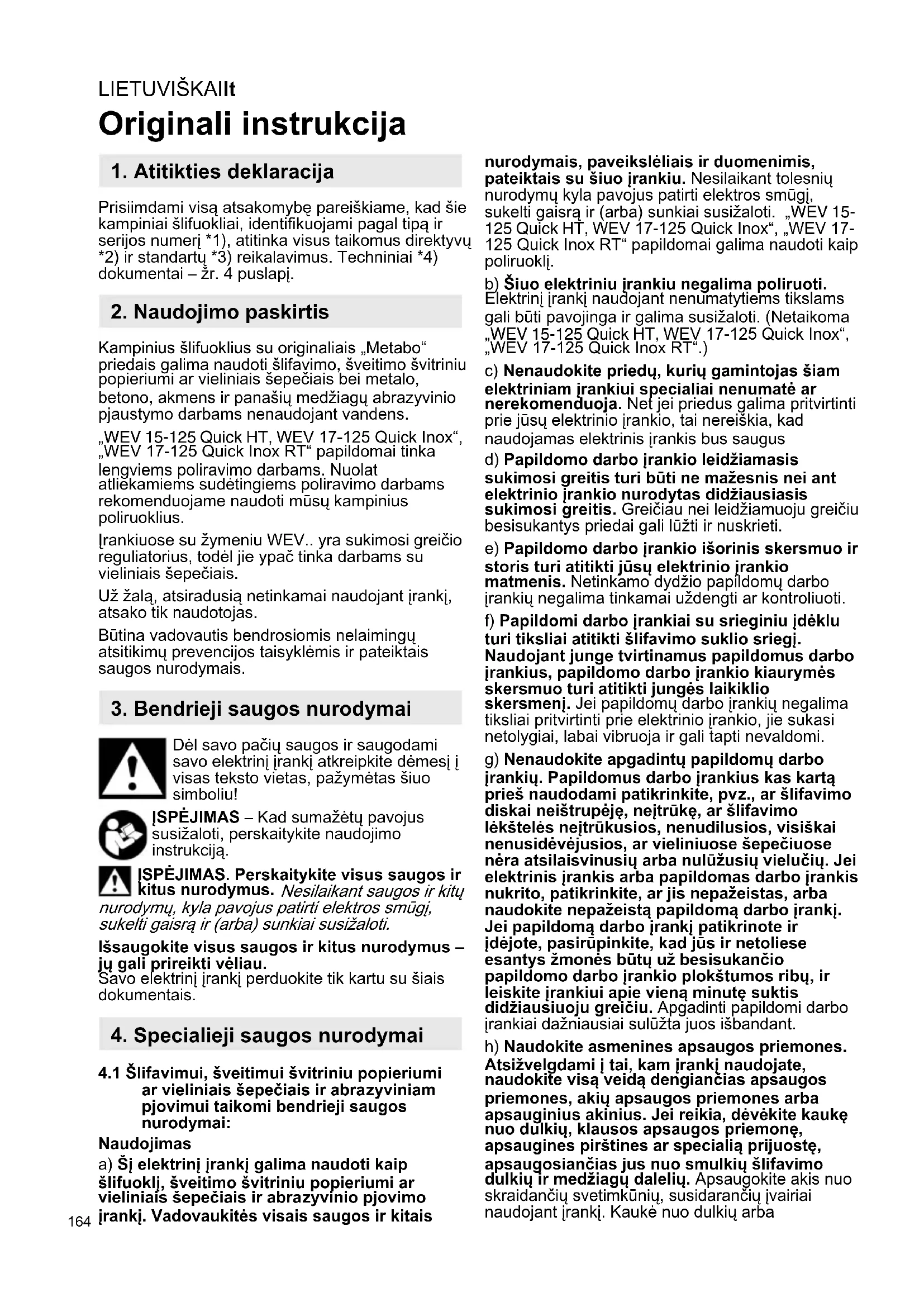 Originali instrukcija Prisiimdami visą atsakomybę pareiškiame, kad šie kampiniai šlifuokliai, identifikuojami pagal tipą ir serijos numerį *1), atitinka visus taikomus direktyvų *2) ir standartų *3) reikalavimus. Techniniai *4) dokumentai – žr. 4 puslapį. Kampinius šlifuoklius su originaliais „Metabo“ priedais galima naudoti šlifavimo, šveitimo švitriniu popieriumi ar vieliniais šepečiais bei metalo, betono, akmens ir panašių medžiagų abrazyvinio pjaustymo darbams nenaudojant vandens. „WEV 15-125 Quick HT, WEV 17-125 Quick Inox“, „WEV 17-125 Quick Inox RT“ papildomai tinka lengviems poliravimo darbams. Nuolat atliekamiems sudėtingiems poliravimo darbams rekomenduojame naudoti mūsų kampinius poliruoklius. Įrankiuose su žymeniu WEV.. yra sukimosi greičio reguliatorius, todėl jie ypač tinka darbams su vieliniais šepečiais. Už žalą, atsiradusią netinkamai naudojant įrankį, atsako tik naudotojas. Būtina vadovautis bendrosiomis nelaimingų atsitikimų prevencijos taisyklėmis ir pateiktais saugos nurodymais. Dėl savo pačių saugos ir saugodami savo elektrinį įrankį atkreipkite dėmesį į visas teksto vietas, pažymėtas šiuo simboliu! ĮSPĖJIMAS – Kad sumažėtų pavojus susižaloti, perskaitykite naudojimo instrukciją. ĮSPĖJIMAS. Perskaitykite visus saugos ir kitus nurodymus. Nesilaikant saugos ir kitų nurodymų, kyla pavojus patirti elektros smūgį, sukelti gaisrą ir (arba) sunkiai susižaloti. Išsaugokite visus saugos ir kitus nurodymus – jų gali prireikti vėliau. Savo elektrinį įrankį perduokite tik kartu su šiais dokumentais.