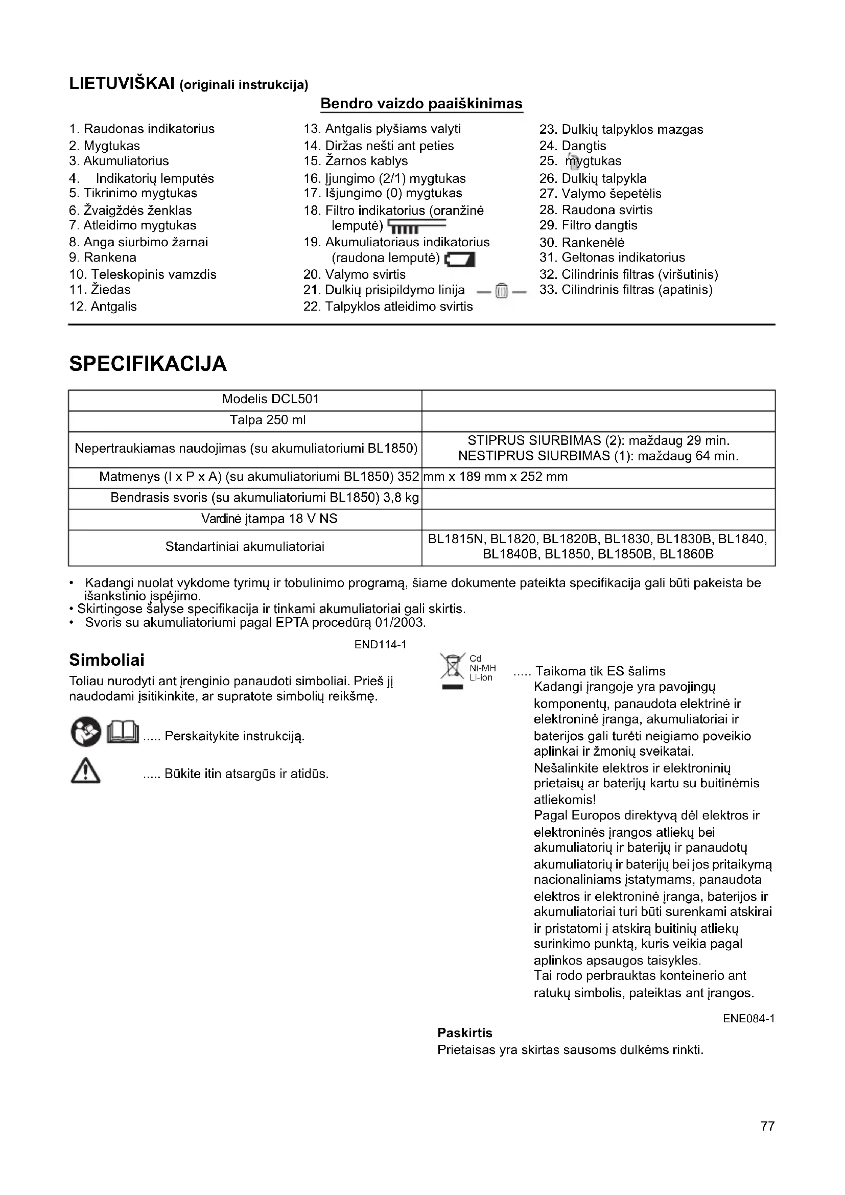 - Svoris su akumuliatoriumi pagal EPTA procedūrą 01/2003. END114-1 Simboliai Toliau nurodyti ant įrenginio panaudoti simboliai. Prieš jį naudodami įsitikinkite, ar supratote simbolių reikšmę. ..... Perskaitykite instrukciją. ..... Būkite itin atsargūs ir atidūs. ..... Taikoma tik ES šalims Kadangi įrangoje yra pavojingų komponentų, panaudota elektrinė ir elektroninė įranga, akumuliatoriai ir baterijos gali turėti neigiamo poveikio aplinkai ir žmonių sveikatai. Nešalinkite elektros ir elektroninių prietaisų ar baterijų kartu su buitinėmis atliekomis! Pagal Europos direktyvą dėl elektros ir elektroninės įrangos atliekų bei akumuliatorių ir baterijų ir panaudotų akumuliatorių ir baterijų bei jos pritaikymą nacionaliniams įstatymams, panaudota elektros ir elektroninė įranga, baterijos ir akumuliatoriai turi būti surenkami atskirai ir pristatomi į atskirą buitinių atliekų surinkimo punktą, kuris veikia pagal aplinkos apsaugos taisykles. Tai rodo perbrauktas konteinerio ant ratukų simbolis, pateiktas ant įrangos. ENE084-1 Paskirtis Prietaisas yra skirtas sausoms dulkėms rinkti.