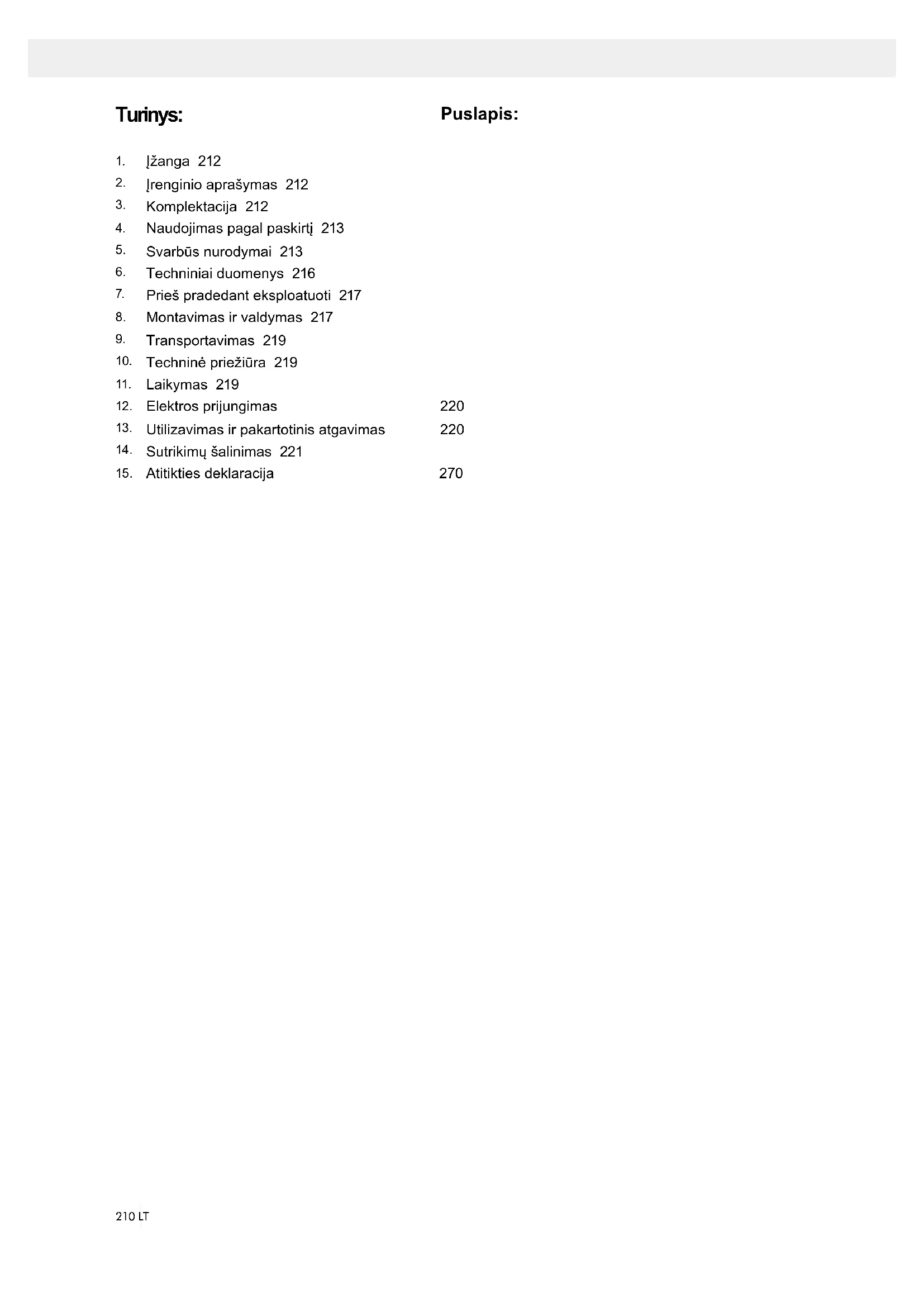 atgavimas Siekiant išvengti transportavimo pažeisimų, įrenginys yra pakuotėje. Ši pakuotė yra žaliava, taigi, ją galima naudoti pakartotinai arba grąžinti į medžiagų cirkuliaci- jos ciklą. Įrenginys ir jo priedai sudaryti iš įvairių medžiagų, pvz., metalo ir plastikų. Nemeskite baterijų į buitines atlie- kas, ugnį arba vandenį. Baterijas reikia rinkti, perdirbti arba ekologiškai utilizuoti. Pristatykite sugedusias kons- trukcines dalis į specialių atliekų utilizavimo punktą. Teiraukitės specializuotoje parduotuvėje arba bendrijos administracijos skyriuje!221LT