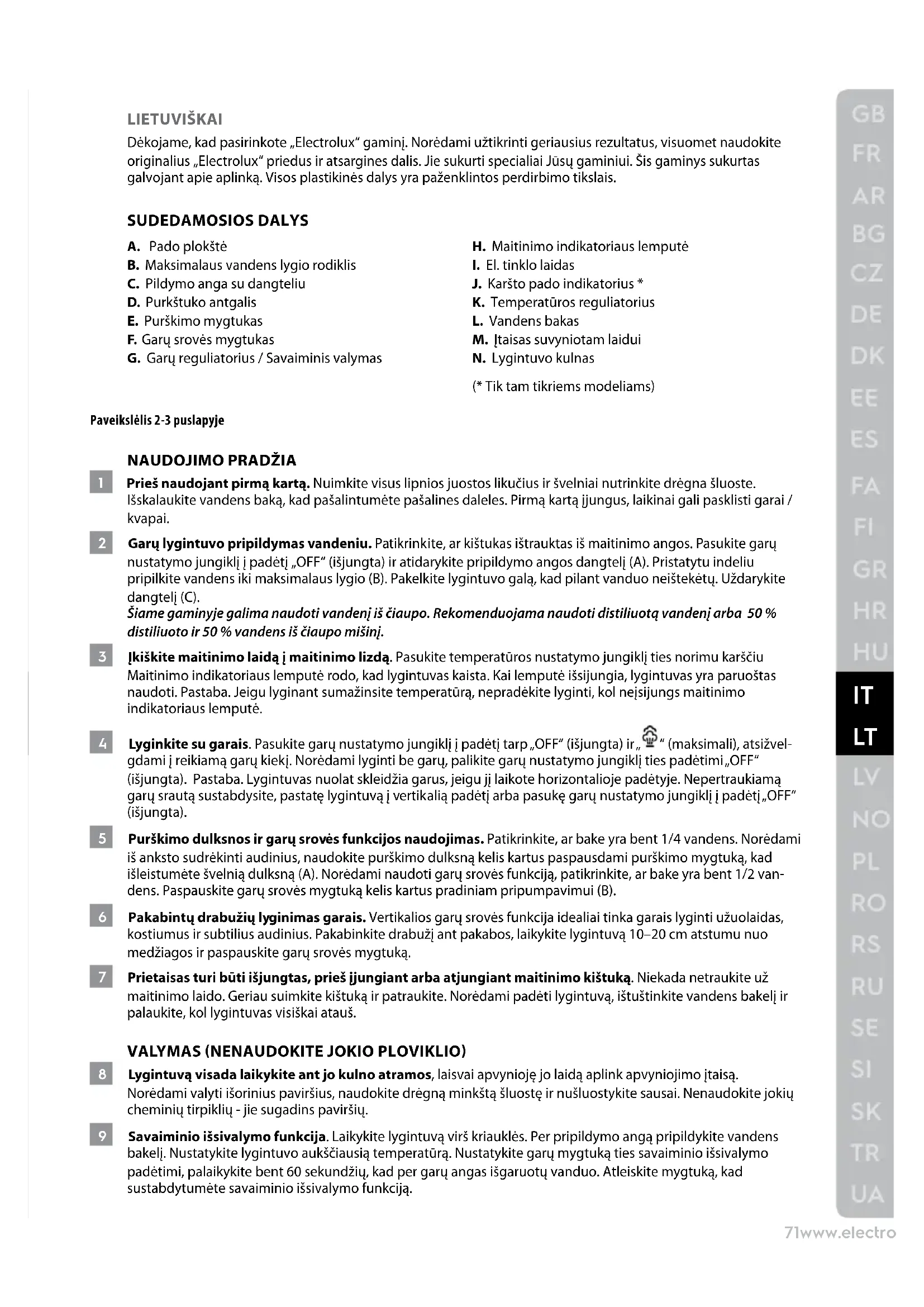 LIETUVIŠKAI Dėkojame, kad pasirinkote „Electrolux“ gaminį. Norėdami užtikrinti geriausius rezultatus, visuomet naudokite originalius „Electrolux“ priedus ir atsargines dalis. Jie sukurti specialiai Jūsų gaminiui. Šis gaminys sukurtas galvojant apie aplinką. Visos plastikinės dalys yra paženklintos perdirbimo tikslais. SUDEDAMOSIOS DALYS A. Pado plokštė B. Maksimalaus vandens lygio rodiklis C. Pildymo anga su dangteliu D. Purkštuko antgalis E. Purškimo mygtukas F. Garų srovės mygtukas G. Garų reguliatorius / Savaiminis valymas H. Maitinimo indikatoriaus lemputė