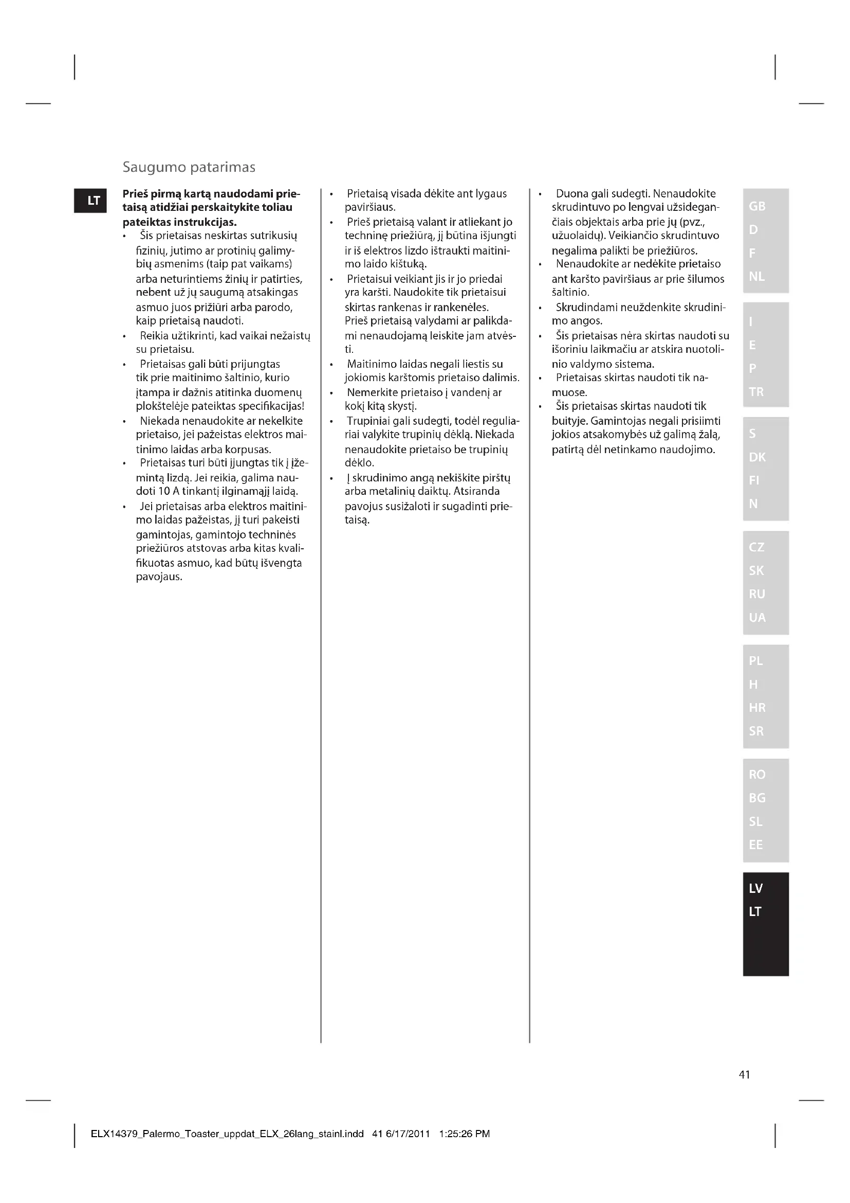 - Šisprietaisasskirtasnaudotitik buityje. Gamintojas negali prisiimti jokiosatsakomybėsužgalimąžalą, patirtą dėl netinkamo naudojimo. ELX14379_Palermo_Toaster_uppdat_ELX_26lang_stainl.indd 41 6/17/2011 1:25:26 PM42 Darba uzsākšana / Naudojimopradžia