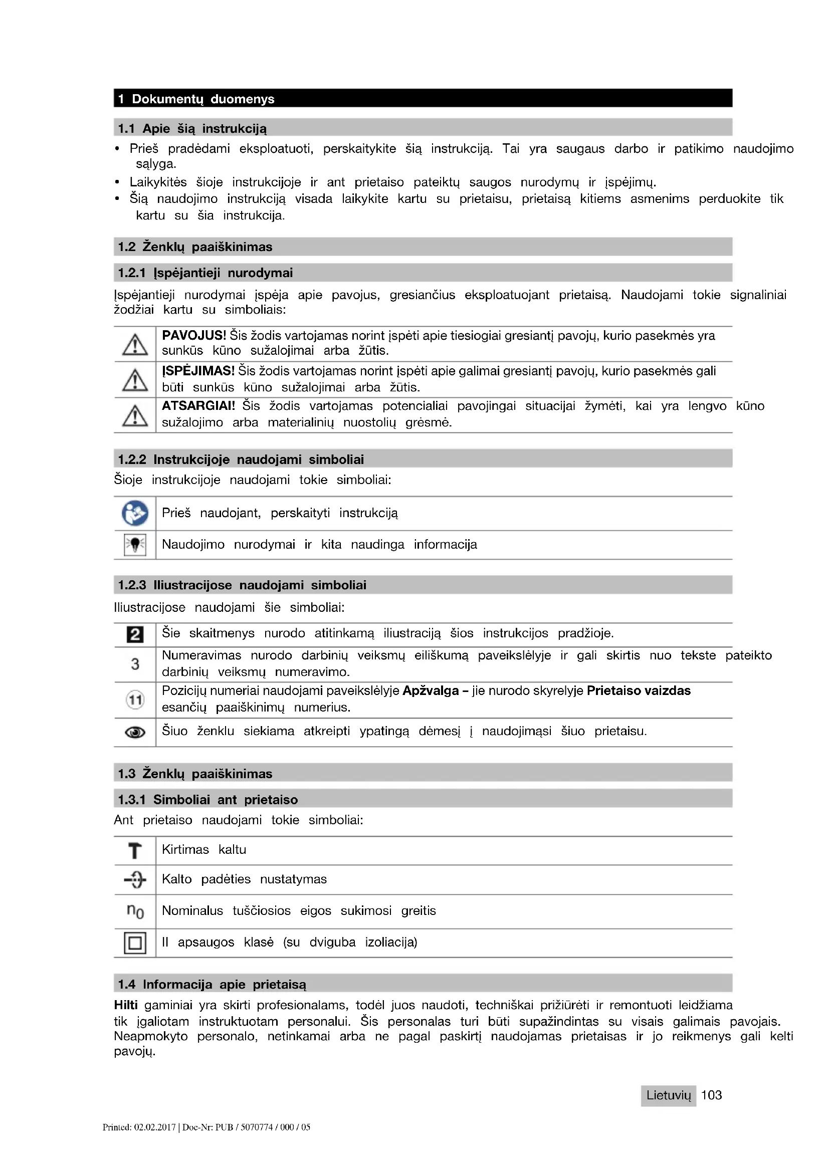 - Elektros tinkle yra per didelė įtampa. Printed: 02.02.2017 | Doc-Nr: PUB / 5070774 / 000 / 05Lietuvių 107 Nurodymas Prietaisą laiku pristatykite į Hilti techninės priežiūros centrą. Taip jis bus visada parengtas naudoti.