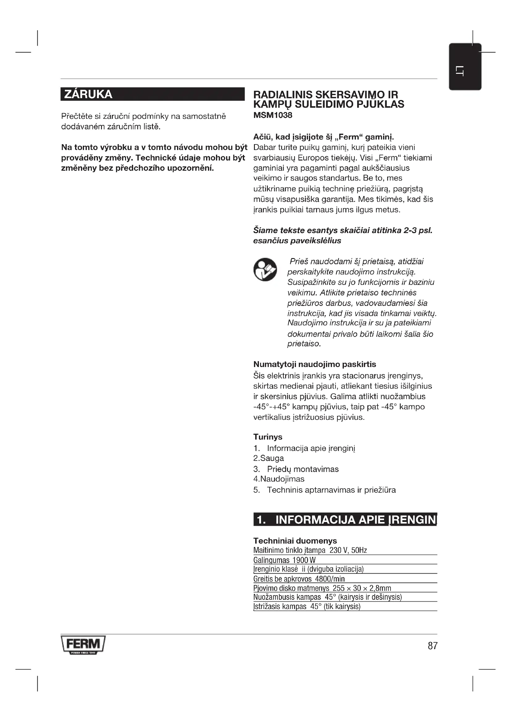 MSM1038 Ačiū, kad įsigijote šį „Ferm“ gaminį. Dabar turite puikų gaminį, kurį pateikia vieni svarbiausių Europos tiekėjų. Visi „Ferm“ tiekiami gaminiai yra pagaminti pagal aukščiausius veikimo ir saugos standartus. Be to, mes užtikriname puikią techninę priežiūrą, pagrįstą mūsų visapusiška garantija. Mes tikimės, kad šis įrankis puikiai tarnaus jums ilgus metus. Šiame tekste esantys skaičiai atitinka 2-3 psl. esančius paveikslėlius Priešnaudodamišįprietaisą,atidžiai perskaitykitenaudojimoinstrukciją. Susipažinkitesujofunkcijomisirbaziniu veikimu.Atlikiteprietaisotechninės priežiūrosdarbus,vadovaudamiesišia instrukcija,kadjisvisadatinkamaiveiktų. Naudojimo instrukcija ir su ja pateikiami dokumentaiprivalobūtilaikomišaliašio prietaiso. Numatytoji naudojimo paskirtis Šis elektrinis įrankis yra stacionarus įrenginys, skirtas medienai pjauti, atliekant tiesius išilginius ir skersinius pjūvius. Galima atlikti nuožambius -45°-+45° kampų pjūvius, taip pat -45° kampo vertikalius įstrižuosius pjūvius. Turinys