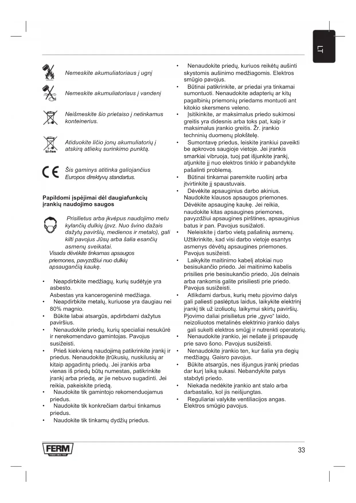 LTNemeskite akumuliatoriaus į ugnį Nemeskite akumuliatoriaus į vandenį Neišmeskite šio prietaiso į netinkamus konteinerius. Atiduokite ličio jonų akumuliatorių į atskirą atliekų surinkimo punktą. Šis gaminys atitinka galiojančius Europos direktyvų standartus. Papildomi įspėjimai dėl daugiafunkcių įrankių naudojimo saugos Prisilietus arba įkvėpus naudojimo metu kylančių dulkių (pvz. Nuo švino dažais dažytų paviršių, medienos ir metalo), gali kilti pavojus Jūsų arba šalia esančių asmenų sveikatai. Visada dėvėkite tinkamas apsaugos priemones, pavyzdžiui nuo dulkių apsaugančią kaukę.