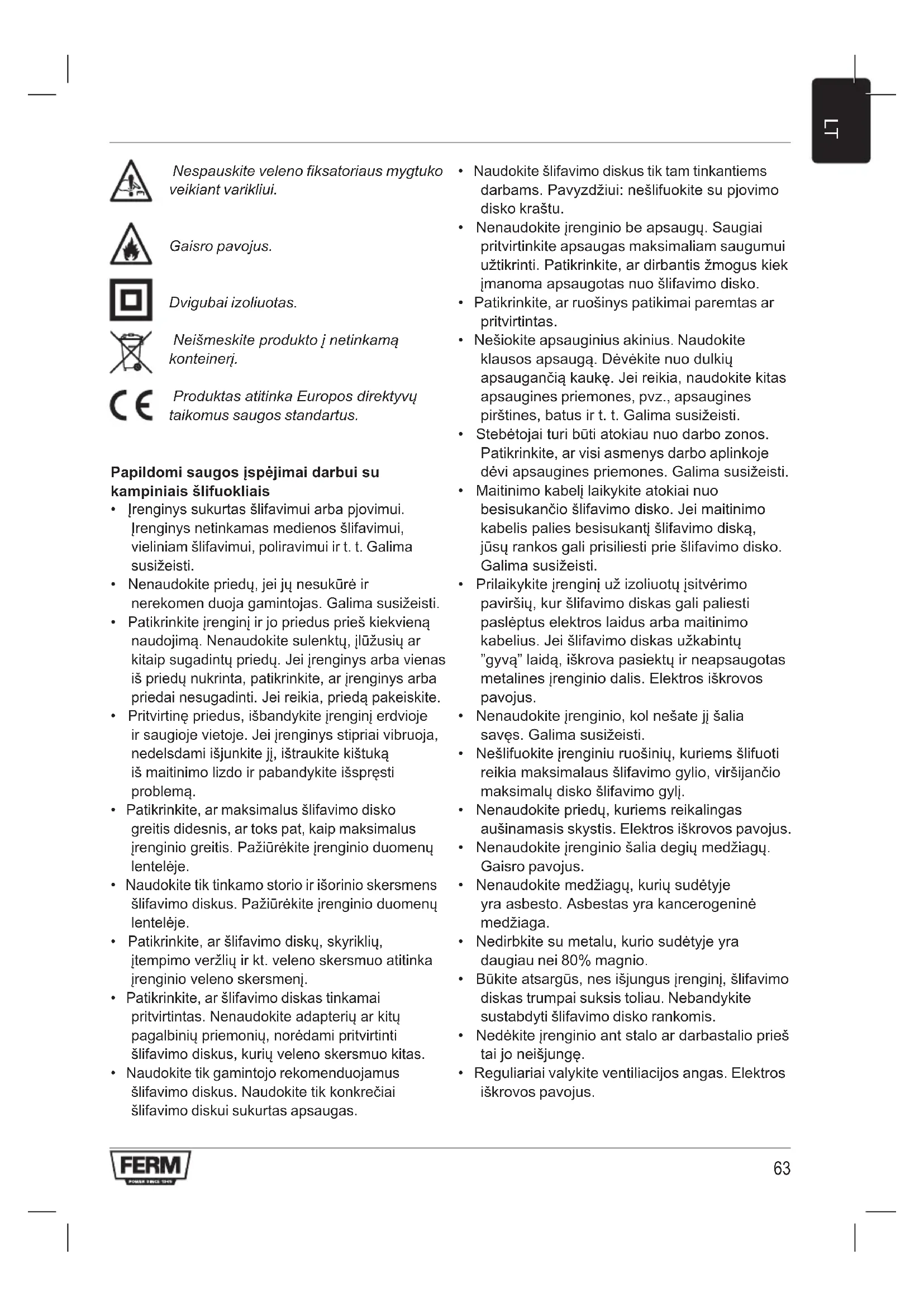 Nespauskite veleno fiksatoriaus mygtuko veikiant varikliui. Gaisro pavojus. Dvigubai izoliuotas. Neišmeskiteproduktoįnetinkamą konteinerį. ProduktasatitinkaEuroposdirektyvų taikomus saugos standartus. Papildomi saugos įspėjimai darbui su kampiniais šlifuokliais
