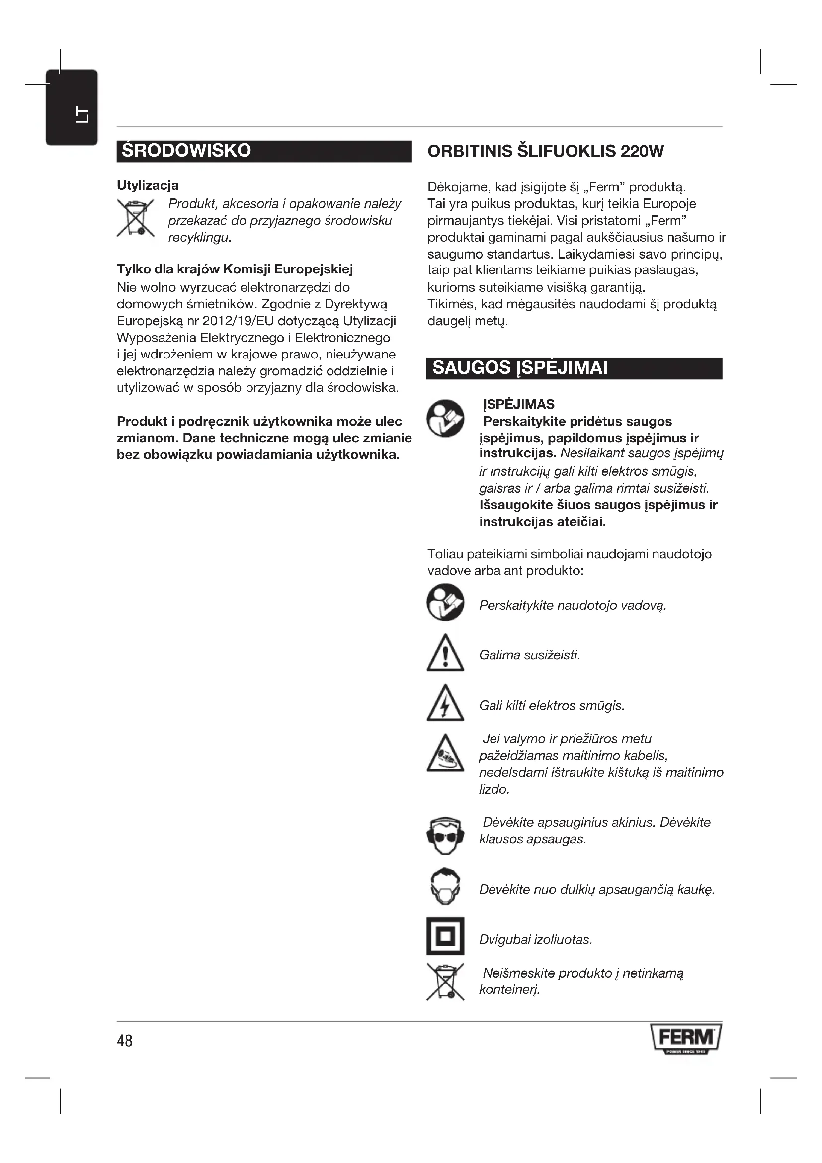 ĮSPĖJIMAS Perskaitykite pridėtus saugos įspėjimus, papildomus įspėjimus ir instrukcijas. Nesilaikant saugos įspėjimų ir instrukcijų gali kilti elektros smūgis, gaisras ir / arba galima rimtai susižeisti. Išsaugokite šiuos saugos įspėjimus ir instrukcijas ateičiai. Toliau pateikiami simboliai naudojami naudotojo vadove arba ant produkto: Perskaitykite naudotojo vadovą. Galima susižeisti. Gali kilti elektros smūgis. Jei valymo ir priežiūros metu pažeidžiamas maitinimo kabelis, nedelsdami ištraukite kištuką iš maitinimo lizdo. Dėvėkite apsauginius akinius. Dėvėkite klausos apsaugas. Dėvėkite nuo dulkių apsaugančią kaukę. Dvigubai izoliuotas. Neišmeskite produkto į netinkamą konteinerį.49
