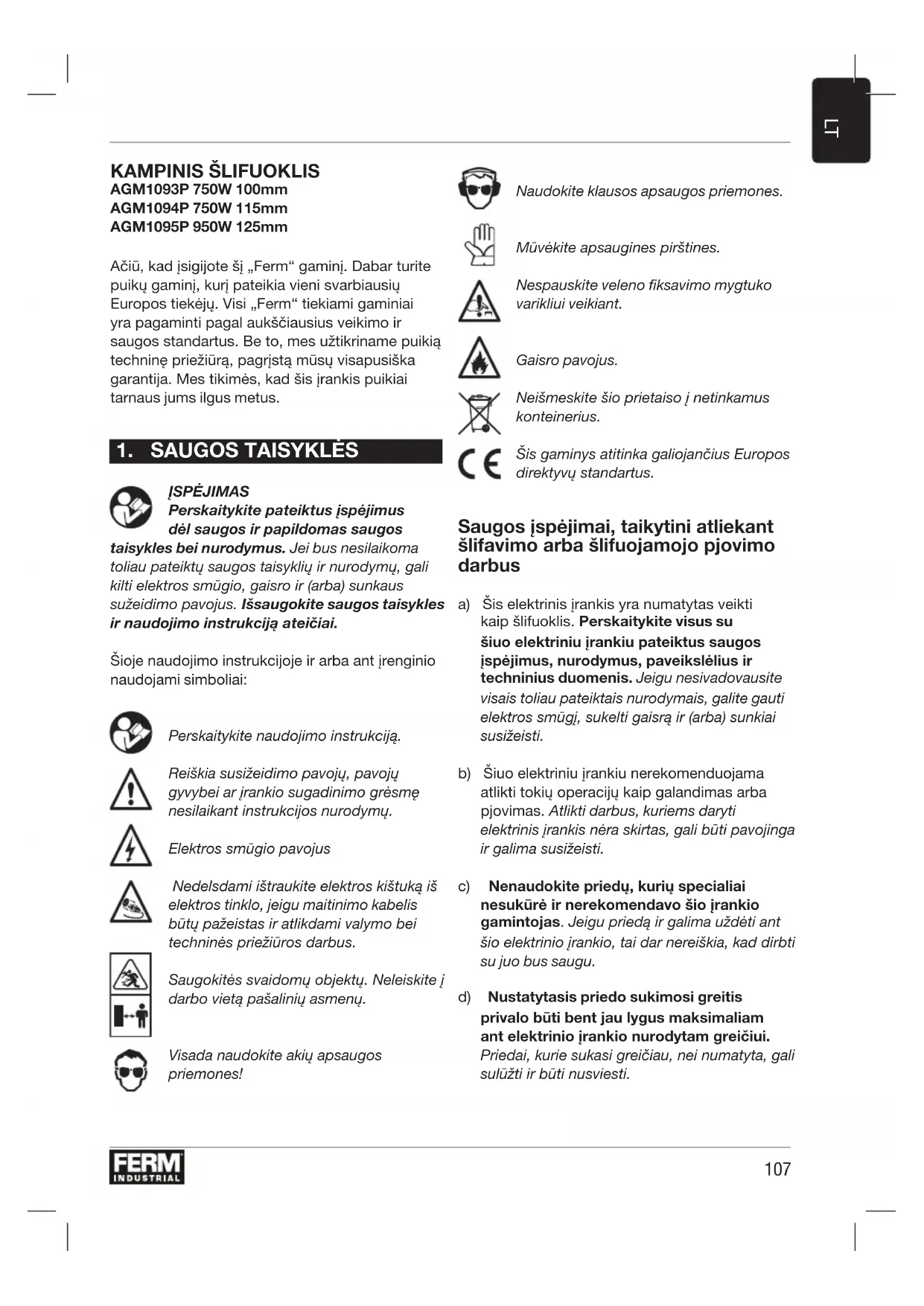 KAMPINIS ŠLIFUOKLIS AGM1093P 750W 100mm AGM1094P 750W 115mm AGM1095P 950W 125mm Ačiū, kad įsigijote šį „Ferm“ gaminį. Dabar turite puikų gaminį, kurį pateikia vieni svarbiausių Europos tiekėjų. Visi „Ferm“ tiekiami gaminiai yra pagaminti pagal aukščiausius veikimo ir saugos standartus. Be to, mes užtikriname puikią techninę priežiūrą, pagrįstą mūsų visapusiška garantija. Mes tikimės, kad šis įrankis puikiai tarnaus jums ilgus metus.