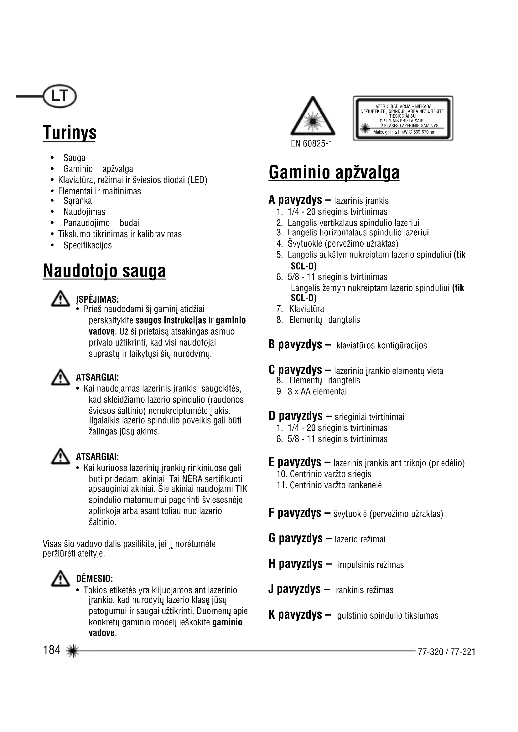 - Tokios etiketės yra klijuojamos ant lazerinio įrankio, kad nurodytų lazerio klasę jūsų patogumui ir saugai užtikrinti. Duomenų apie konkretų gaminio modelį ieškokite gaminio vadove. LT185 77-320 / 77-321 K pavyzdys – horizontalaus spindulio tikslumas M pavyzdys – vertikalaus spindulio tikslumas N pavyzdys – aukštyn ir žemyn nukreipto spindulio tikslumas Klaviatūra, režimai ir šviesios diodai (LED) Klaviatūra (žr.