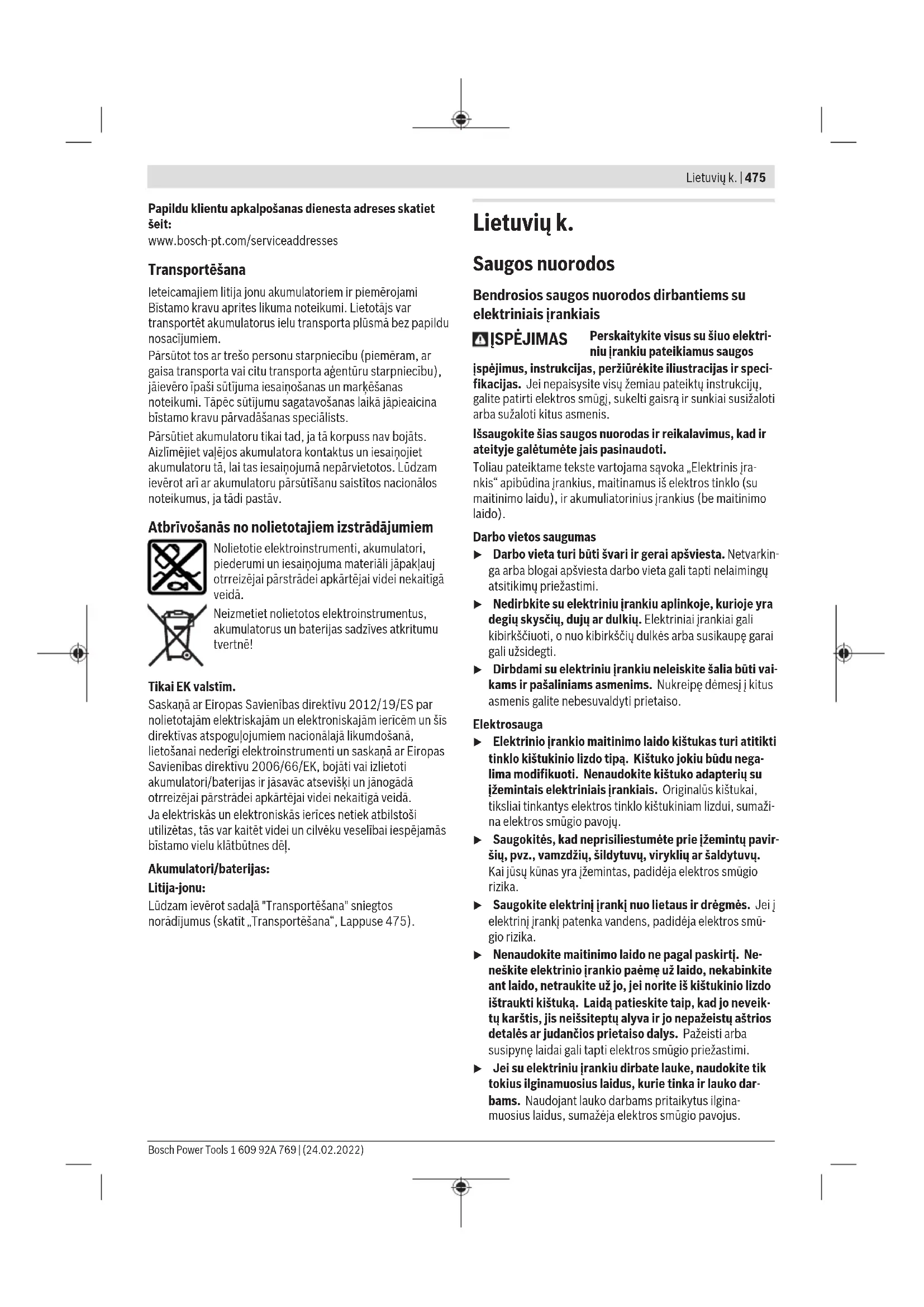 Savienojamības funkcijas (GWS 18V-10 SC / GWS 18V-10 PC/ GWS18V-10PSC) Lietojot elektroinstrumentu kopā ar Bluetooth® Low Energy moduli GCY42, tam tiek nodrošinātas šādas savienojamības funkcijas: – Reģistrācija un personalizēšana, – Statusa pārbaude, brīdinājuma ziņojumu saņemšana, – Vispārējas informācijas saņemšana un iestatījumi, – Pārvaldība Informācija par Bluetooth® Low Energy moduli GCY42 ir sniegta attiecīgajā lietošanas pamācībā. Apkalpošana un apkope Apkalpošana un tīrīšana u Veicot jebkurus darbus ar elektroinstrumentu (piemēram, apkalpošanu, darbinstrumentu nomaiņu utt.), kā arī pirms tā transportēšanas vai uzglabāšanas vienmēr izņemiet no elektroinstrumenta akumulatoru. Ieslēdzēja nejauša nospiešana var izraisīt savainojumu. u Lai elektroinstruments darbotos droši un bez atteikumiem, regulāri tīriet tā korpusu un ventilācijas atveres. Rūpīgi glabājiet un uzmanīgi lietojiet elektroinstrumenta piederumus. Klientu apkalpošanas dienests un konsultācijas par lietošanu Klientu apkalpošanas dienests atbildēs uz Jūsu jautājumiem par izstrādājumu remontu un apkalpošanu, kā arī par to rezerves daļām. Kopsalikuma attēlus un informāciju par rezerves daļām Jūs varat atrast interneta vietnē: www.bosch-pt.com Bosch konsultantu grupa palīdzēs Jums vislabākajā veidā rast atbildes uz jautājumiem par mūsu izstrādājumiem un to piederumiem. Pieprasot konsultācijas un pasūtot rezerves daļas, noteikti paziņojiet 10zīmju izstrādājuma numuru, kas norādīts uz izstrādājuma marķējuma plāksnītes. Latvijas Republika Robert Bosch SIA Bosch elektroinstrumentu servisa centrs Mūkusalas ielā 97 LV-1004 Rīga Tālr.: 67146262 Telefakss: 67146263 E-pasts: service-pt@lv.bosch.com 1 609 92A 769 | (24.02.2022) Bosch Power ToolsLietuvių k. | 475 Papildu klientu apkalpošanas dienesta adreses skatiet šeit: www.bosch-pt.com/serviceaddresses Transportēšana Ieteicamajiem litija jonu akumulatoriem ir piemērojami Bīstamo kravu aprites likuma noteikumi. Lietotājs var transportēt akumulatorus ielu transporta plūsmā bez papildu nosacījumiem. Pārsūtot tos ar trešo personu starpniecību (piemēram, ar gaisa transporta vai citu transporta aģentūru starpniecību), jāievēro īpaši sūtījuma iesaiņošanas un marķēšanas noteikumi. Tāpēc sūtījumu sagatavošanas laikā jāpieaicina bīstamo kravu pārvadāšanas speciālists. Pārsūtiet akumulatoru tikai tad, ja tā korpuss nav bojāts. Aizlīmējiet vaļējos akumulatora kontaktus un iesaiņojiet akumulatoru tā, lai tas iesaiņojumā nepārvietotos. Lūdzam ievērot arī ar akumulatoru pārsūtīšanu saistītos nacionālos noteikumus, ja tādi pastāv. Atbrīvošanās no nolietotajiem izstrādājumiem Nolietotie elektroinstrumenti, akumulatori, piederumi un iesaiņojuma materiāli jāpakļauj otrreizējai pārstrādei apkārtējai videi nekaitīgā veidā. Neizmetiet nolietotos elektroinstrumentus, akumulatorus un baterijas sadzīves atkritumu tvertnē! Tikai EK valstīm. Saskaņā ar Eiropas Savienības direktīvu 2012/19/ES par nolietotajām elektriskajām un elektroniskajām ierīcēm un šīs direktīvas atspoguļojumiem nacionālajā likumdošanā, lietošanai nederīgi elektroinstrumenti un saskaņā ar Eiropas Savienības direktīvu 2006/66/EK, bojāti vai izlietoti akumulatori/baterijas ir jāsavāc atsevišķi un jānogādā otrreizējai pārstrādei apkārtējai videi nekaitīgā veidā. Ja elektriskās un elektroniskās ierīces netiek atbilstoši utilizētas, tās var kaitēt videi un cilvēku veselībai iespējamās bīstamo vielu klātbūtnes dēļ. Akumulatori/baterijas: Litija-jonu: Lūdzam ievērot sadaļā "Transportēšana" sniegtos norādījumus (skatīt „Transportēšana“, Lappuse475). Lietuvių k. Saugos nuorodos Bendrosios saugos nuorodos dirbantiems su elektriniais įrankiais ĮSPĖJIMAS Perskaitykite visus su šiuo elektri- niu įrankiu pateikiamus saugos įspėjimus, instrukcijas, peržiūrėkite iliustracijas ir speci- fikacijas. Jei nepaisysite visų žemiau pateiktų instrukcijų, galite patirti elektros smūgį, sukelti gaisrą ir sunkiai susižaloti arba sužaloti kitus asmenis. Išsaugokite šias saugos nuorodas ir reikalavimus, kad ir ateityje galėtumėte jais pasinaudoti. Toliau pateiktame tekste vartojama sąvoka „Elektrinis įra- nkis“ apibūdina įrankius, maitinamus iš elektros tinklo (su maitinimo laidu), ir akumuliatorinius įrankius (be maitinimo laido). Darbo vietos saugumas u Darbo vieta turi būti švari ir gerai apšviesta. Netvarkin- ga arba blogai apšviesta darbo vieta gali tapti nelaimingų atsitikimų priežastimi. u Nedirbkite su elektriniu įrankiu aplinkoje, kurioje yra degių skysčių, dujų ar dulkių. Elektriniai įrankiai gali kibirkščiuoti, o nuo kibirkščių dulkės arba susikaupę garai gali užsidegti. u Dirbdami su elektriniu įrankiu neleiskite šalia būti vai- kams ir pašaliniams asmenims. Nukreipę dėmesį į kitus asmenis galite nebesuvaldyti prietaiso. Elektrosauga u Elektrinio įrankio maitinimo laido kištukas turi atitikti tinklo kištukinio lizdo tipą. Kištuko jokiu būdu nega- lima modifikuoti. Nenaudokite kištuko adapterių su įžemintais elektriniais įrankiais. Originalūs kištukai, tiksliai tinkantys elektros tinklo kištukiniam lizdui, sumaži- na elektros smūgio pavojų. u Saugokitės, kad neprisiliestumėte prie įžemintų pavir- šių, pvz., vamzdžių, šildytuvų, viryklių ar šaldytuvų. Kai jūsų kūnas yra įžemintas, padidėja elektros smūgio rizika. u Saugokite elektrinį įrankį nuo lietaus ir drėgmės. Jei į elektrinį įrankį patenka vandens, padidėja elektros smū- gio rizika. u Nenaudokite maitinimo laido ne pagal paskirtį. Ne- neškite elektrinio įrankio paėmę už laido, nekabinkite ant laido, netraukite už jo, jei norite iš kištukinio lizdo ištraukti kištuką. Laidą patieskite taip, kadjo neveik- t