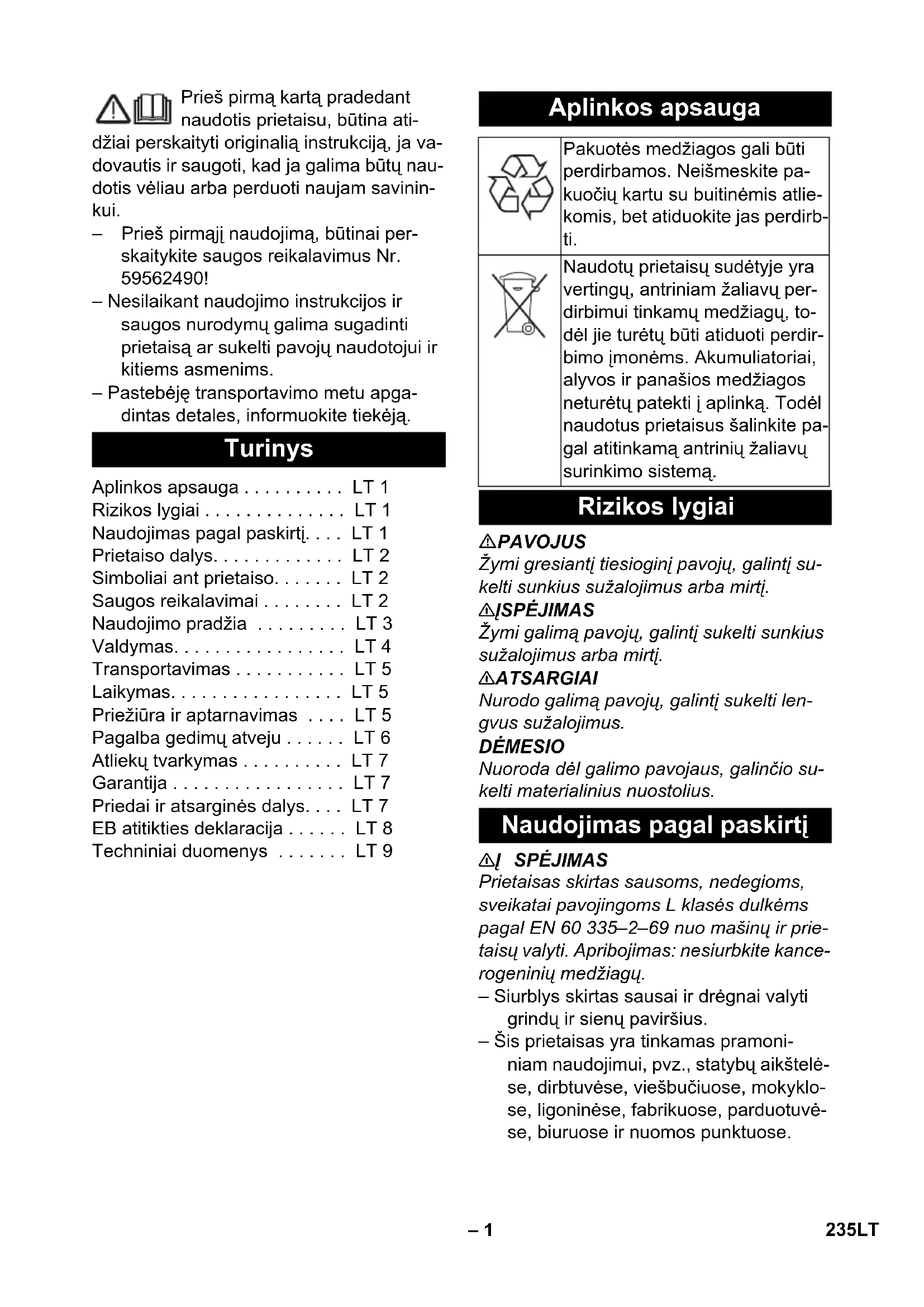 Daļas Nr. Kabeļa ga- rums EU 297.534 7,5 m 234 LV– 1 Prieš pirmą kartą pradedant naudotis prietaisu, būtina ati- džiai perskaityti originalią instrukciją, ja va- dovautis ir saugoti, kad ja galima būtų nau- dotis vėliau arba perduoti naujam savinin- kui. – Prieš pirmąjį naudojimą, būtinai per- skaitykite saugos reikalavimus Nr. 59562490! – Nesilaikant naudojimo instrukcijos ir saugos nurodymų galima sugadinti prietaisą ar sukelti pavojų naudotojui ir kitiems asmenims. – Pastebėję transportavimo metu apga- dintas detales, informuokite tiekėją. PAVOJUS Žymi gresiantį tiesioginį pavojų, galintį su- kelti sunkius sužalojimus arba mirtį. 몇 ĮSPĖJIMAS Žymi galimą pavojų, galintį sukelti sunkius sužalojimus arba mirtį. 몇 ATSARGIAI Nurodo galimą pavojų, galintį sukelti len- gvus sužalojimus. DĖMESIO Nuoroda dėl galimo pavojaus, galinčio su- kelti materialinius nuostolius. 몇 Į SPĖJIMAS Prietaisas skirtas sausoms, nedegioms, sveikatai pavojingoms L klasės dulkėms pagal EN 60 335–2–69 nuo mašinų ir prie- taisų valyti. Apribojimas: nesiurbkite kance- rogeninių medžiagų. – Siurblys skirtas sausai ir drėgnai valyti grindų ir sienų paviršius. – Šis prietaisas yra tinkamas pramoni- niam naudojimui, pvz., statybų aikštelė- se, dirbtuvėse, viešbučiuose, mokyklo- se, ligoninėse, fabrikuose, parduotuvė- se, biuruose ir nuomos punktuose. Turinys Aplinkos apsauga . . . . . . . . . . LT 1 Rizikos lygiai . . . . . . . . . . . . . . LT 1 Naudojimas pagal paskirtį. . . . LT 1 Prietaiso dalys. . . . . . . . . . . . . LT 2 Simboliai ant prietaiso. . . . . . . LT 2 Saugos reikalavimai . . . . . . . . LT 2 Naudojimo pradžia . . . . . . . . . LT 3 Valdymas. . . . . . . . . . . . . . . . . LT 4 Transportavimas . . . . . . . . . . . LT 5 Laikymas. . . . . . . . . . . . . . . . . LT 5 Priežiūra ir aptarnavimas . . . . LT 5 Pagalba gedimų atveju . . . . . . LT 6 Atliekų tvarkymas . . . . . . . . . . LT 7 Garantija . . . . . . . . . . . . . . . . . LT 7 Priedai ir atsarginės dalys. . . . LT 7 EB atitikties deklaracija . . . . . . LT 8 Techniniai duomenys . . . . . . . LT 9 Aplinkos apsauga Pakuotės medžiagos gali būti perdirbamos. Neišmeskite pa- kuočių kartu su buitinėmis atlie- komis, bet atiduokite jas perdirb- ti. Naudotų prietaisų sudėtyje yra vertingų, antriniam žaliavų per- dirbimui tinkamų medžiagų, to- dėl jie turėtų būti atiduoti perdir- bimo įmonėms. Akumuliatoriai, alyvos ir panašios medžiagos neturėtų patekti į aplinką. Todėl naudotus prietaisus šalinkite pa- gal atitinkamą antrinių žaliavų surinkimo sistemą. Rizikos lygiai Naudojimas pagal paskirtį 235LT– 2 1 Elektrodai 2 Siurbimo žarna 3 Kabelio kablys 4 Oro išėjimo anga, darbinis oras 5 Siurbimo galvutės fiksatorius 6 Universalus adapteris 7 Oro įėjimo anga, variklio aušinimo oras 8 Purvo rezervuaras 9 Siurblio viršutinė dalis 10 Vairuojamasis ratukas 11 Siurbimo antvamzdis 12 Antgalis grindims (neteikiamas kartu su prietaisu) 13 Siurbimo vamzdis (neteikiamas kartu su prietaisu) 14 Rankena 15 Filtro dangtelis 16 Atvamzdis (neteikiamas kartu su prie- taisu) 17 Siurbimo galios reguliatorius (be pako- pų) 18 Sukamasis siurbimo galios reguliato- rius („min“–„max“) 19 Kontrolinė lemputė 20 Lizdas 21 Automatinis filtro valymas 22 Pagrindinis jungiklis 23 Plokščiasis gofruotas filtras 24 Filtro valymas 25 Antgalio grindims laikiklis 26 Antgalio siūlėms laikiklis 27 Siurbimo vamzdžių laikiklis 28 Elektros laidas 29 Duomenų lentelė 몇 ĮSPĖJIMAS – Jei išmetamas oras grįžta į patalpą, joje turi būti pakankama oro apykaita. Nu- statytoms ribinėms vertėms išlaikyti grįžtančiosios srovės dydis gali sudaryti ne daugiau nei 50% šviežio oro srovės dydžio (patalpos oras V