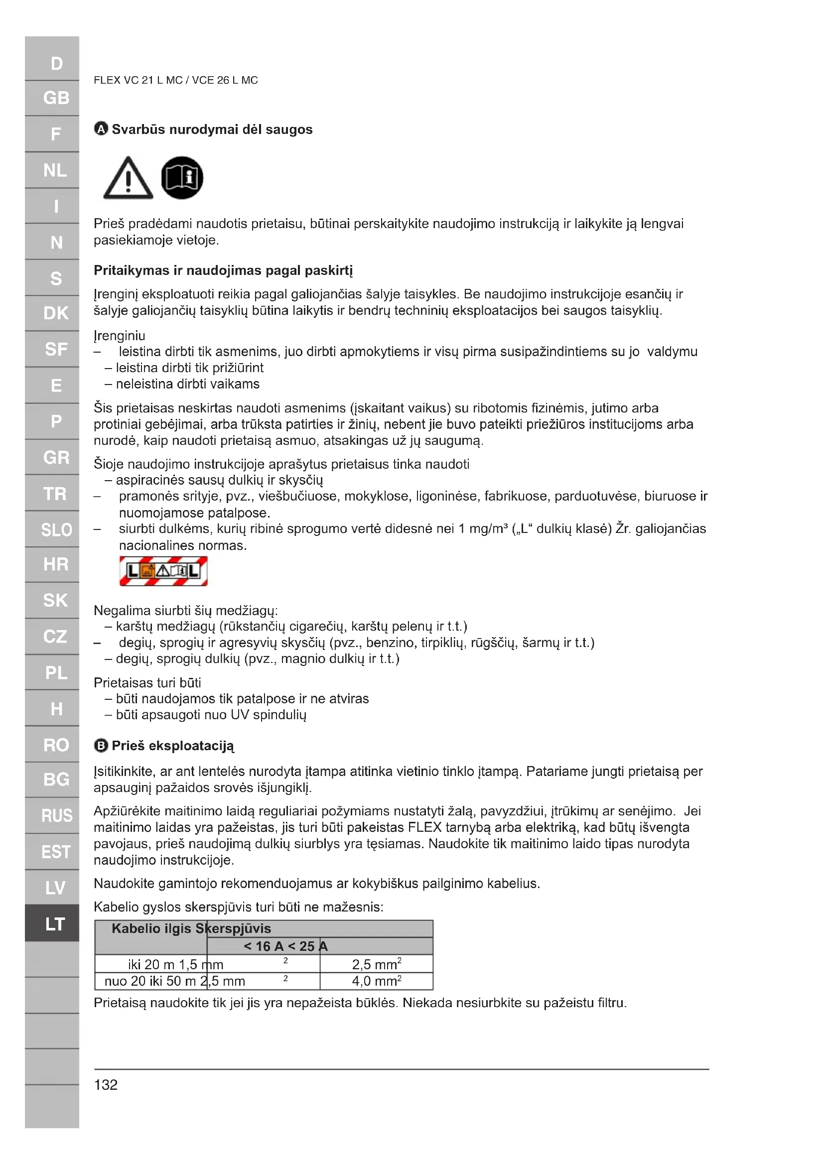 Prieš eksploataciją Įsitikinkite, ar ant lentelės nurodyta įtampa atitinka vietinio tinklo įtampą. Patariame jungti prietaisą per apsauginį pažaidos srovės išjungiklį. Apžiūrėkite maitinimo laidą reguliariai požymiams nustatyti žalą, pavyzdžiui, įtrūkimų ar senėjimo. Jei maitinimo laidas yra pažeistas, jis turi būti pakeistas FLEX tarnybą arba elektriką, kad būtų išvengta pavojaus, prieš naudojimą dulkių siurblys yra tęsiamas. Naudokite tik maitinimo laido tipas nurodyta naudojimo instrukcijoje. Naudokite gamintojo rekomenduojamus ar kokybiškus pailginimo kabelius. Kabelio gyslos skerspjūvis turi būti ne mažesnis: Kabelio ilgis Skerspjūvis < 16 A < 25 A iki 20 m 1,5 mm