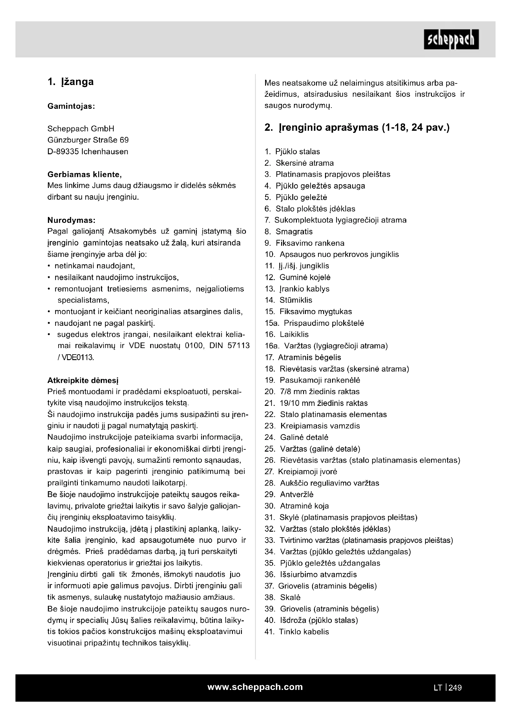 - sugedus elektros įrangai, nesilaikant elektrai kelia- mai reikalavimų ir VDE nuostatų 0100, DIN 57113 / VDE0113. Atkreipkite dėmesį Prieš montuodami ir pradėdami eksploatuoti, perskai- tykite visą naudojimo instrukcijos tekstą. Ši naudojimo instrukcija padės jums susipažinti su įren- giniu ir naudoti jį pagal numatytąją paskirtį. Naudojimo instrukcijoje pateikiama svarbi informacija, kaip saugiai, profesionaliai ir ekonomiškai dirbti įrengi- niu, kaip išvengti pavojų, sumažinti remonto sąnaudas, prastovas ir kaip pagerinti įrenginio patikimumą bei prailginti tinkamumo naudoti laikotarpį. Be šioje naudojimo instrukcijoje pateiktų saugos reika- lavimų, privalote griežtai laikytis ir savo šalyje galiojan- čių įrenginių eksploatavimo taisyklių. Naudojimo instrukciją, įdėtą į plastikinį aplanką, laiky- kite šalia įrenginio, kad apsaugotumėte nuo purvo ir drėgmės. Prieš pradėdamas darbą, ją turi perskaityti kiekvienas operatorius ir griežtai jos laikytis. Įrenginiu dirbti gali tik žmonės, išmokyti naudotis juo ir informuoti apie galimus pavojus. Dirbti įrenginiu gali tik asmenys, sulaukę nustatytojo mažiausio amžiaus. Be šioje naudojimo instrukcijoje pateiktų saugos nuro- dymų ir specialių Jūsų šalies reikalavimų, būtina laiky- tis tokios pačios konstrukcijos mašinų eksploatavimui visuotinai pripažintų technikos taisyklių.www.scheppach.com