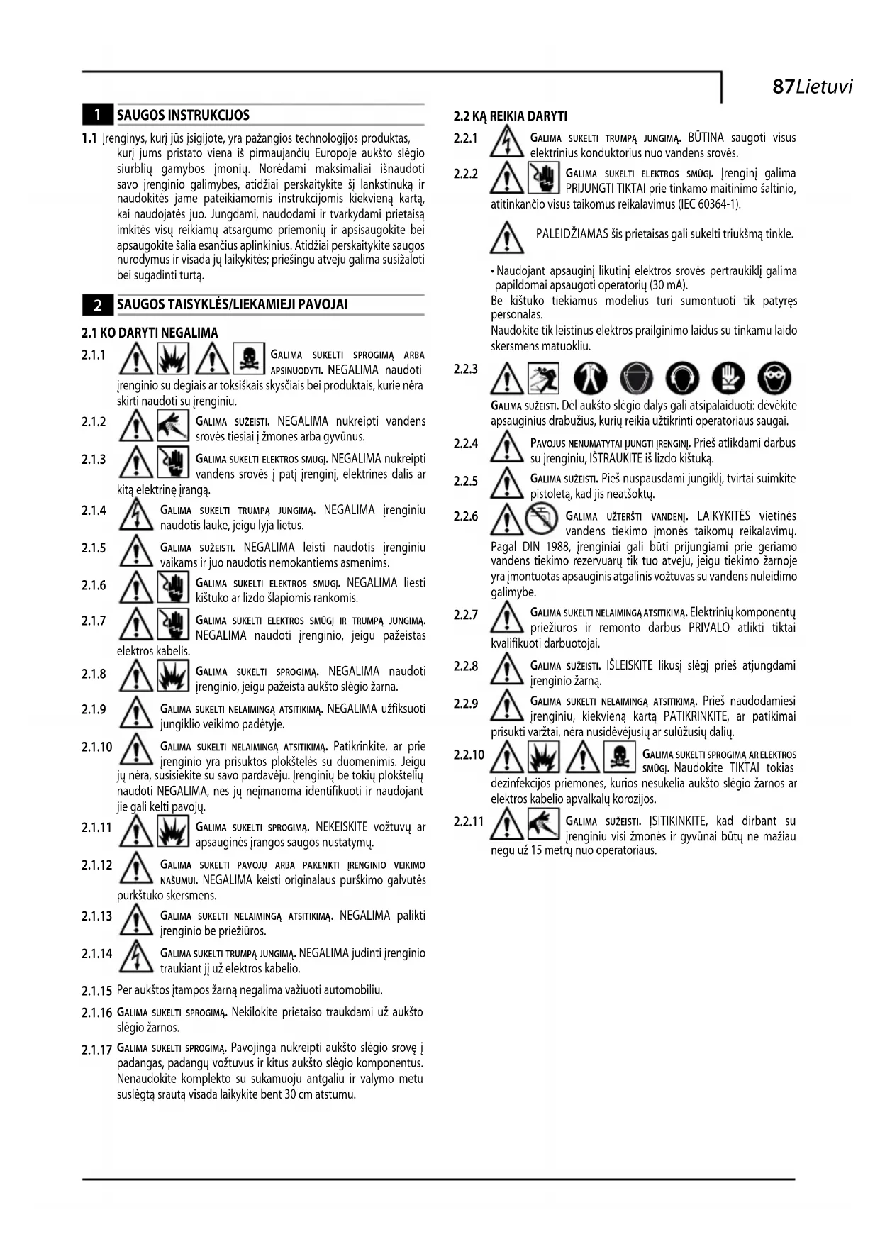 galima sukelti nelaimingą atsitikimą. Elektrinių komponentų priežiūros ir remonto darbus PRIVALO atlikti tiktai kvalifikuoti darbuotojai.