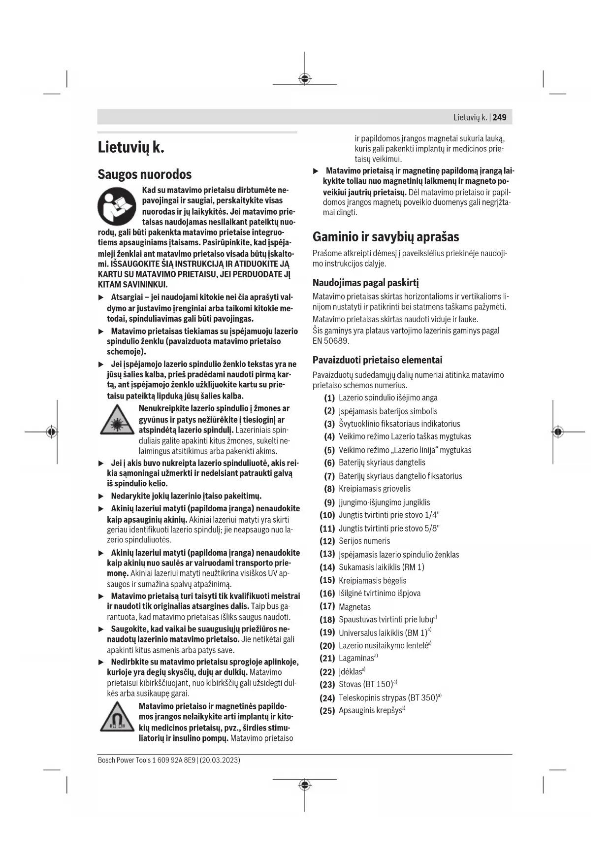 esant 20–25°C C) Nurodytos vertės galioja esant normalios ir palankioms aplinkos sąlygoms (pvz., nėra vibracijos, nėra rūko, nėra dūmų, nėra tiesioginio sau- lės spinduliavimo). Po didelių temperatūros svyravimų gali atsirasti tikslumo nuokrypių. D) Atsiranda tik nelaidžių nešvarumų, tačiau galima tikėtis aprasojimo sukelto laikino laidumo. Firminėje lentelėje esantis gaminio numeris (12) yra skirtas jūsų matavimo prietaisui vienareikšmiškai identifikuoti. Montavimas Baterijų įdėjimas/keitimas Matavimo prietaisą patariama naudoti su šarminėmis manga- no baterijomis. Norėdami atidaryti baterijų skyriaus dangtelį(6), paspaus- kite fiksatorių(7) ir atidenkite baterijų skyriaus dangtelį. Įdė- kite baterijas. Įdėdami baterijas atkreipkite dėmesį į baterijų skyriaus vidu- je nurodytus baterijų polius. Kai baterijos išsikrauna, įspėjamasis baterijų indikatorius mirksi(2) žaliai. Taip pat kas 10min maždaug 5-iass mirksi lazerio linijos. Po pirmojo mirksėjimo matavimo prietaisą dar galima naudoti apie 1h. Kai baterijos visiškai išsikrauna, prieš pat automatinį išjungimą lazerio linijos dar kartą su- mirksi. Visada kartu pakeiskite visas baterijas. Naudokite tik vieno gamintojo ir vienodos talpos baterijas. u Jei matavimo prietaiso ilgesnį laiką nenaudosite, išim- kite iš jo baterijas. Ilgesnį laiką laikant baterijas matavi- mo prietaise, dėl korozijos jos gali pradėti irti ir savaime išsikrauti. Darbas su sukamuoju laikikliuRM1 (žr.A1– A3pav.) Naudodamiesi sukamuoju laikikliu(14), matavimo prietaisą 360° galite pasukti apie centrinį, visada matomą statmens tašką. Tokiu būdu galima nustatyti lazerio linijas, nekeičiant matavimo prietaiso padėties. Matavimo prietaiso kreipiamąjį griovelį (8) įstatykite į krei- piamąjį bėgelį (15), esantį ant sukamojo laikiklio (14), ir stumkite matavimo prietaisą ant platformos iki atramos. Norėdami nuimti, matavimo prietaisą traukite nuo sukamojo laikiklio priešinga kryptimi. Galimos sukamojo laikiklio padėtys: – pastatyti ant lygaus paviršiaus, – prisukti prie nuožulnaus paviršiaus, – spaustuvu, skirtu tvirtinti prie lubų, (18) pritvirtinti prie lubų lentjuostės, – magnetu(17) pritvirtinti prie metalinių paviršių. u Kai papildomą įrangą tvirtinate prie paviršiaus, nelies- kite pirštais magnetinės papildomos įrangos užpakali- nės pusės. Dėl stiprios magneto traukiamosios jėgos gali būti prispausti pirštai. Naudojimas Paruošimas naudoti u Saugokite matavimo prietaisą nuo drėgmės ir tiesiogi- nio saulės spindulių poveikio. u Matavimo prietaisą saugokite nuo itin aukštos ir že- mos temperatūros bei temperatūros svyravimų. Pvz., nepalikite jo ilgesniam laikui automobilyje. Esant dides- niems temperatūros svyravimams, pirmiausia palaukite, kol stabilizuosis jo temperatūra, ir prieš tęsdami darbą vi- sada atlikite tikslumo patikrą (žr. „Matavimo prietaiso tikslumo patikra“, Puslapis253). Esant ypač aukštai ir žemai temperatūrai arba temperatū- ros svyravimams, gali būti pakenkiama matavimo prietaiso tikslumui. u Saugokite, kad matavimo prietaisas nebūtų smarkiai sutrenktas ir nenukristų. Po stipraus išorinio poveikio matavimo prietaisui, prieš tęsdami darbą, visada turėtu- mėte atlikti tikslumo patikrinimą (žr. „Matavimo prietaiso tikslumo patikra“, Puslapis253). u Jei matavimo prietaisą norite transportuoti, jį išjun- kite. Prietaisą išjungus švytavimo mazgas užblokuojamas, nes prietaisui labai judant neužblokuotas mazgas gali būti pažeidžiamas. Įjungimas ir išjungimas Norėdami matavimo prietaisą įjungti, įjungimo-išjungimo jungiklį(9) pastumkite į padėtį On (darbui su švytuokliniu fiksatoriumi) arba į padėtį On (darbui su automatiniu ni- veliavimo įtaisu). Matavimo prietaisą įjungus, per lazerio spindulių išėjimo angas(1) tuoj pat siunčiami lazerio spindu- liai. u Nenukreipkite lazerio spindulio į kitus asmenis ar gyvūnus ir nežiūrėkite į lazerio spindulį patys, net ir būdami atokiau nuo prietaiso. Norėdami matavimo prietaisą išjungti, įjungimo-išjungimo jungiklį(9) pastumkite į padėtįOff. Prietaisą išjungus švyta- vimo mazgas užblokuojamas. u Nepalikite įjungto matavimo prietaiso be priežiūros, o baigę su prietaisu dirbti, jį išjunkite. Lazerio spindulys gali apakinti kitus žmones. Jei viršijama aukščiausia leidžiamoji 50°C darbinė tempera- tūra, lazerio spindulys išsijungia automatiškai, kad apsaugo- tų lazerio diodą. Kai prietaisas atvėsta, jis vėl yra parengties būsenoje ir jį vėl galima įjungti. Bosch Power Tools 1 609 92A 8E9 | (20.03.2023)252 | Lietuvių k. Automatinis išjungimas Jei apytikriai per 120min. nepaspaudžiamas joks mygtukas, kad būtų taupomos baterijos, matavimo prietaisas automa- tiškai išsijungia. Norėdami po automatinio išjungimo matavimo prietaisą vėl įjungti, galite arba pastumti įjungimo-išjungimo jungiklį (9) į padėtį "Off", o tada matavimo prietaisą vėl įjungti, arba vieną kartą paspausti veikimo režimo „Lazerio taškas“ mygtuką (4) ar veikimo režimo „Lazerio linija“ mygtuką (5). Automatinio išjungimo įtaiso laikinas deaktyvinimas Norėdami deaktyvinti automatinio išjungimo įtaisą (esant įjungtam matavimo prietaisui), ne mažiau kaip 3 s spauskite veikimo režimo „Lazerio linija“ mygtuką (5). Kai automatinio išjungimo įtaisas deaktyvinamas, kaip patvirtinimas apie at- liktą operaciją, trumpai sumirksi lazerio spinduliai. Nuoroda: Jei darbinė temperatūra viršija 45°C, automatinio išjungimo įtaiso deaktyvinti nebegalima. Jei automatinio išjungimo įtaisą norite suaktyvinti, matavimo prietaisą išjunkite ir vėl įjunkite. Veikimo režimo pasirinkimas Šis matavimo prietaisas yra su keliais veikimo režimais, ku- riuos jūs bet kada galite perjungti: – Kryžminių linijų ir taškinis režimas: matavimo prietai- sas sukuria horizontali