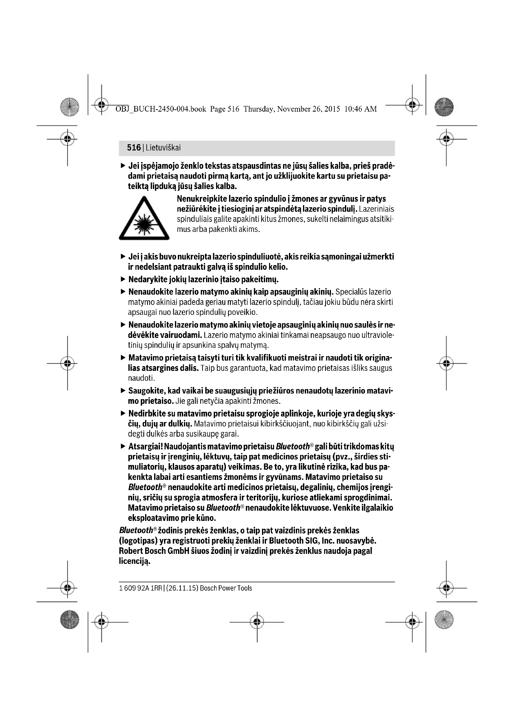 OBJ_BUCH-2450-004.book Page 528 Thursday, November 26, 2015 10:46 AMLietuviškai | 529 Bosch Power Tools 1 609 92A 1RR | (26.11.15) Bluetooth® sąsaja Duomenų perdavimas į kitus prietaisus Matavimo prietaisas yra su Bluetooth® moduliu, kuris radijo bangomis leidžia perduoti duomenis į tam tikrus mobiliuosius galinius prietaisus su Bluetooth® sąsaja (pvz., iš- maniuosius telefonus, planšetinius kompiuterius). Informaciją apie sistemai keliamas sąlygas Bluetooth® ryšiui sukurti rasite Bosch in- ternetiniame puslapyje www.bosch-pt.de Daugiau informacijos rasite Bosch gaminių puslapyje, žr. QR kodą, 8 psl. Perduodant duomenis per Bluetooth®, tarp galinio prietaiso ir matavimo prietaiso gali būti laiko uždelsa. Tai gali būti dėl atstumo tarp abiejų prietaisų arba dėl paties mata- vimo objekto. Bluetooth® sąsajos suaktyvinimas duomenų perdavimui į mobilųjį galinį prietaisą Norėdami suaktyvinti Bluetooth® sąsają, paspauskite matavimo prietaiso Bluetooth® mygtuką 6. Norėdami suaktyvinti Bluetooth® signalą, dar kartą paspauskite Blue- tooth® mygtuką 6 arba mygtuką 3 [+]. Įsitikinkite, kad yra suaktyvinta jūsų mobiliojo galinio prietaiso Bluetooth® sąsaja. Norint praplėsti mobiliojo galinio prietaiso funkcijas ir supaprastinti duomenų apdo- rojimą, galima naudotis specialiomis Bosch programėlėmis. Jas, priklausomai nuo ga- linio prietaiso, galima parsisiųsti į atminties įtaisus. Įjungus Bosch programėlę, sukuriamas ryšys tarp mobiliojo galinio prietaiso ir mata- vimo prietaiso. Jei surandami keli aktyvūs matavimo prietaisai, pagal serijos numerį išsirinkite tinkamą matavimo prietaisą. Ryšio būsena bei aktyvi jungtis (a) rodoma matavimo prietaiso būsenos eilutėje (h). Bluetooth® sąsajos deaktyvinimas Norėdami deaktyvinti Bluetooth® ryšį, paspauskite Bluetooth® mygtuką 6. Norėdami suaktyvinti Bluetooth® signalą, dar kartą paspauskite Bluetooth® mygtuką 6, mygtuką 8 [–] arba išjunkite matavimo prietaisą. Darbo patarimai Daugiau informacijos rasite Bosch gaminių puslapyje, žr. QR kodą, 8 psl. Matavimo prietaisas yra su radijo sąsaja. Būtina laikytis vietinių eksploatavi- mo apribojimų, pvz., lėktuvuose ar ligoninėse. OBJ_BUCH-2450-004.book Page 529 Thursday, November 26, 2015 10:46 AM530 | Lietuviškai 1 609 92A 1RR | (26.11.15) Bosch Power Tools Bendrosios nuorodos Priėmimo lęšio 14 ir lazerio spindulio išėjimo angos 15 matuojant negalima uždengti. Matavimo prietaiso matuojant judinti negalima. Todėl matavimo prietaisą priglauskite prie kaip galima tvirtesnės atramos ar atraminio paviršiaus. Įtaka matavimo diapazonui Matavimo diapazonas priklauso nuo apšvietimo sąlygų ir taikinio paviršiaus atspin- džio. Esant ryškiam pašalinės šviesos šaltiniui, kad geriau matytumėte lazerio spindu- lį, naudokite akinius lazerio matomumui pagerinti 18 (papildoma įranga) ir lazerio tai- kinio lentelę 17 (papildoma įranga), arba nusitaikymo plote sudarykite šešėlį. Įtaka matavimo rezultatams Dėl fizikinių veiksnių, matuojant įvairių paviršių plotus, matavimai gali būti klaidingi. Tai gali pasitaikyti, matuojant: – permatomus paviršius (pvz., stiklą, vandenį), – veidrodinius paviršius (pvz., poliruotą metalą, stiklą), – akytus paviršius (pvz., izoliacines medžiagas), –struktūrinius paviršius (pvz., struktūrinį tinką, natūralų akmenį). Jei reikia, matuodami šiuos paviršius naudokite lazerio nusitaikymo lentelę 17 (papil- doma įranga). Matavimo rezultatai gali būti klaidingi taip pat, jei kreivai nusitaikoma į nusitaikymo paviršių. Matavimo vertei įtakos taip pat gali padaryti skirtingų temperatūrų oro sluoksniai arba netiesiogiai sugauti atspindžiai. Posvyrio matavimo tikslumo tikrinimas ir kalibravimas (žr. pav. G) Reguliariai tikrinkite posvyrio matavimo tikslumą. Tai atliekama dviem matavimais. Tuo tikslus, matavimo prietaisą padėkite ant stalo ir išmatuokite posvyrį. Matavimo prietaisą pasukite 180 ° kampu ir dar kartą išmatuokite posvyrį. Parodytų verčių skir- tumas turi būti ne didesnis kaip 0,3 °. Esant didesniems nuokrypiams, matavimo prietaisą turite iš naujo sukalibruoti. Tuo tikslu pasirinkite . Sekite nurodymus ekrane. Po didelių temperatūros svyravimų ir smūgių rekomenduojame atlikti matavimo prie- taiso tikslumo patikrą ir, jei reikia, sukalibruoti. Pasikeitus temperatūrai, prieš atlie- kant kalibravimą reikia palaukti, kol susivienodins matavimo prietaiso ir aplinkos tem- peratūra. CAL OBJ_BUCH-2450-004.book Page 530 Thursday, November 26, 2015 10:46 AMLietuviškai | 531 Bosch Power Tools 1 609 92A 1RR | (26.11.15) Tikslumo tikrinimas atstumo matavimu Matavimo prietaiso tikslumą galite patikrinti kaip aprašyta toliau: – Pasirinkite nekintamą, maždaug nuo 3 iki 10 m ilgio matavimo atkarpą, kurios ilgis jums tiksliai žinomas (pvz., patalpos plotis, durų anga). Matavimą reikia atlikti ge- romis sąlygomis, t. y., matuojama atkarpa turi būti patalpos viduje, matavimo nu- sitaikymo paviršius lygus ir gerai atspindintis. – Išmatuokite šią atkarpą 10 kartų iš eilės. Matuojant geromis sąlygomis, visoje atkarpoje atskirų matavimų nuokrypis nuo vidu- tinės vertės turi būti ne didesnis kaip ±4 mm. Užregistruokite matavimo rezultatus protokole, kad ir vėliau galėtumėte palyginti tikslumą. Naudojimas su trikoju stovu (pap. įranga) Stovas ypač reikalingas matuojant dideliu atstumu. Matavimo prietaisą 1/4" sriegiu 13 prisukite prie stovo 19 greitojo keitimo plokštelės arba prie standartinio trikojo stovo. Tvirtai užveržkite greitojo keitimo plokštės fiksuojamuoju varžtu. Spausdami mygtuką 4 atitinkamai nustatykite bazinę matavimo plokštumą, kai ma- tuojama su stovu (bazinė plokštuma „sriegis“). Klaidos pranešimas Jei matavimo negalima atlikti tinkamai, ekrane parodomas klaidos pranešimas „Er- ror“. Matavimo prietaisą išjunkite, vėl įjunkite ir iš naujo pra
