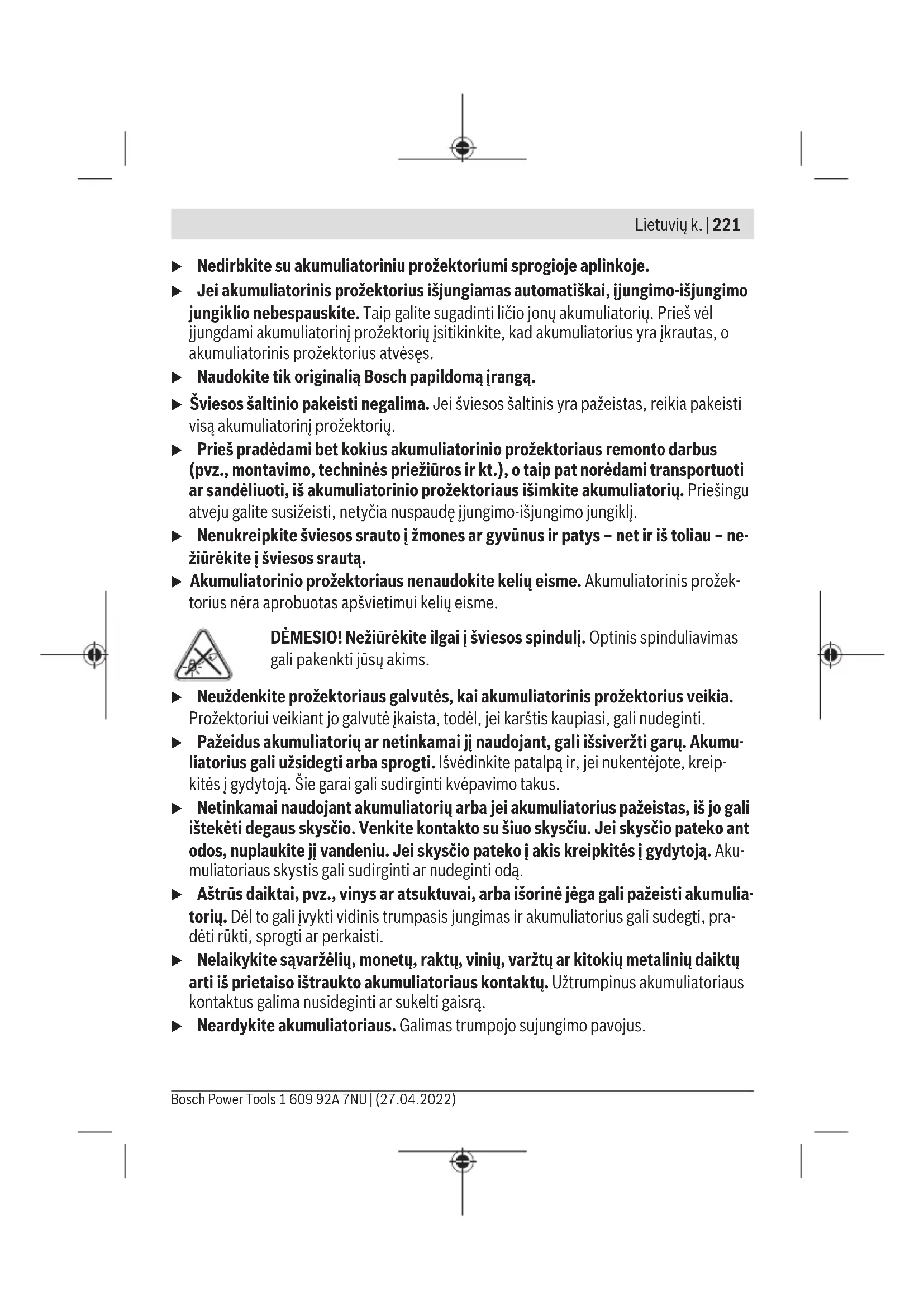 ir sandėliuojant °C –20...+50 Rekomenduojami akumuliatoriai GBA 18V... ProCORE18V... Rekomenduojami krovikliai GAL 18... GAX 18... GAL 36... A) Ribota galia, esant temperatūrai <0 °C Apšviestų objektų spalvos gali pakisti. Montavimas Akumuliatoriaus įkrovimas (papildoma įranga) u Naudokite tik techninių duomenų skyriuje nurodytus kroviklius. Tik šie krovikliai yra priderinti prie Jūsų akumuliatoriniame prožektoriuje naudojamo ličio jonų akumu- liatoriaus. Nuoroda: akumuliatorius pristatomas iš dalies įkrautas. Kad akumuliatorius veiktų visa galia, prieš pirmąjį naudojimą akumuliatorių kroviklyje visiškai įkraukite. Ličio jonų akumuliatorių galima įkrauti bet kada, eksploatavimo trukmė dėl to nesutrum- pėja. Krovimo proceso nutraukimas akumuliatoriui nekenkia. Bosch Power Tools 1 609 92A 7NU | (27.04.2022)224 | Lietuvių k. Celių apsaugos sistema "Electronic Cell Protection (ECP)" saugo ličio jonų akumuliatorių nuo visiškos iškrovos. Kai akumuliatorius išsikrauna, apsauginis išjungiklis išjungia aku- muliatorinį prožektorių. u Jei akumuliatorinis prožektorius išjungiamas automatiškai, įjungimo-išjungimo jungiklio nebespauskite. Taip galite sugadinti ličio jonų akumuliatorių. Prieš vėl įjungdami akumuliatorinį prožektorių įsitikinkite, kad akumuliatorius yra įkrautas, o akumuliatorinis prožektorius atvėsęs. Norėdami išimti akumuliatorių(4), paspauskite atblokavimo klavišą(5)ir išimkite aku- muliatorių iš akumuliatorinio prožektoriaus. Traukdami nenaudokite jėgos. Laikykitės pateiktų šalinimo nurodymų. Naudojimas Paruošimas naudoti Akumuliatoriaus įdėjimas Įkrautą akumuliatorių(4) stumkite į prožektoriaus galvutę(3), kol pajusite, kad jis užsi- fiksavo ir prigludo prie prožektoriaus galvutės . Pastatymas Akumuliatorinį prožektorių pastatykite ant stabilaus, lygaus pagrindo. Užtikrinkite saugų stovėjimą. Įjungimas ir išjungimas Norėdami akumuliatorinį prožektorių įjungti, paspauskite įjungimo-išjungimo jungiklį(2). Norėdami akumuliatorinį prožektorių išjungti, dar kartą paspauskite įjungimo-išjungimo jungiklį(2). Su temperatūros pokyčiu susijusi apsauga nuo perkrovos Jei viršijama leidžiama 60°C radiatoriaus temperatūra, akumuliatorinis prožektorius su- mirksi 3kartus ir išsijungia. Palaukite, kol akumuliatorinis prožektorius atvės, ir akumu- liatorinį prožektorių vėl įjunkite. Akumuliatoriaus įkrovos būklės indikatorius Žali akumuliatoriaus įkrovos būklės indikatoriairodo akumuliatoriausįkrovos būklę. Dėl saugumo, įkrovos būklę galima pažiūrėti tik tada, kai elektrinis įrankis neveikia. Jei norite, kad būtų parodyta įkrovos būklė, paspauskite įkrovos būklės mygtuką arba . Tai galima ir tada, kai akumuliatorius yra išimtas. 1 609 92A 7NU | (27.04.2022) Bosch Power ToolsLietuvių k. | 225 Jei paspaudus mygtuką nešviečia nei vienas šviesadiodis indikatorius, vadinasi akumulia- torius yra pažeistas ir jį reikia pakeisti. Akumuliatoriaus tipas GBA 18V... LEDs Talpa Šviečia nuolat 3× žalias 60−100% Šviečia nuolat 2× žalias 30−60% Šviečia nuolat 1× žalias 5−30% Mirksi 1× žalias 0−5% Akumuliatoriaus tipas ProCORE18V... LEDs Talpa Šviečia nuolat 5× žalias 80−100% Šviečia nuolat 4× žalias 60−80% Šviečia nuolat 3× žalias 40−60 % Šviečia nuolat 2× žalias 20−40 % Šviečia nuolat 1× žalias 5−20 % Mirksi 1× žalias 0−5 % Darbo patarimai Akumuliatorinis prožektorius šviečia silpniau, kai likusi švietimo trukmė yra ≤10 min. Prožektoriaus galvutės pasukimas (žr.Apav.) Prožektoriaus galvutę(3) 27žingsniais galite palenkti maks. 135°. Rankena prietaisui nešti (žr.Bpav.) Rankena(7) skirta akumuliatoriniam prožektoriui nešti ar prie kokio nors objekto pritvir- tinti. Bosch Power Tools 1 609 92A 7NU | (27.04.2022)226 | Lietuvių k. Priežiūra ir servisas Priežiūra ir valymas u Prieš pradėdami bet kokius akumuliatorinio prožektoriaus remonto darbus (pvz., montavimo, techninės priežiūros ir kt.), o taip pat norėdami transportuoti ar sandėliuoti, iš akumuliatorinio prožektoriaus išimkite akumuliatorių. Priešingu atveju galite susižeisti, netyčia nuspaudę įjungimo-išjungimo jungiklį. Akumuliatoriniam prožektoriui techninės priežiūros nereikia, jame nėra dalių, kurias reik- tų keisti ar atlikti techninę priežiūrą. Akumuliatorinio prožektoriaus plastiko stiklą, kad jo nepažeistumėte, valykite sausu, minkštu skudurėliu. Nenaudokite valymo priemonių ir tirpiklių. Klientų aptarnavimo skyrius ir konsultavimo tarnyba Klientų aptarnavimo skyriuje gausite atsakymus į klausimus, susijusius su jūsų gaminio remontu, technine priežiūra bei atsarginėmis dalimis. Detalius brėžinius ir informacijos apie atsargines dalis rasite interneto puslapyje: www.bosch-pt.com Bosch konsultavimo tarnybos specialistai mielai pakonsultuos Jus apie gaminius ir jų pa- pildomą įrangą. Ieškant informacijos ir užsakant atsargines dalis prašome būtinai nurodyti dešimtženklį gaminio numerį, esantį firminėje lentelėje. Lietuva Bosch įrankių servisas Informacijos tarnyba: (037) 713350 ļrankių remontas: (037) 713352 Faksas: (037) 713354 El. paštas: service-pt@lv.bosch.com Kitus techninės priežiūros skyriaus adresus rasite čia: www.bosch-pt.com/serviceaddresses Transportavimas Rekomenduojamų ličio jonų akumuliatorių gabenimui taikomos pavojingų krovinių gabe- nimą reglamentuojančių įstatymų nuostatos. Naudotojui akumuliatorius gabenti keliais leidžiama be jokių apribojimų. Jei siunčiant pasitelkiami tretieji asmenys (pvz., oro transportas, ekspedijavimo įmonė), būtina atsižvelgti į pakuotei ir ženklinimui taikomus ypatingus reikalavimus. Būtina, kad rengiant siuntą dalyvautų pavojingų krovinių gabenimo specialistas. 1 609 92A 7NU | (27.04.2022) Bosch Power Tools한국어 | 227 Siųskite tik tokius akumuliatorius, kurių nep