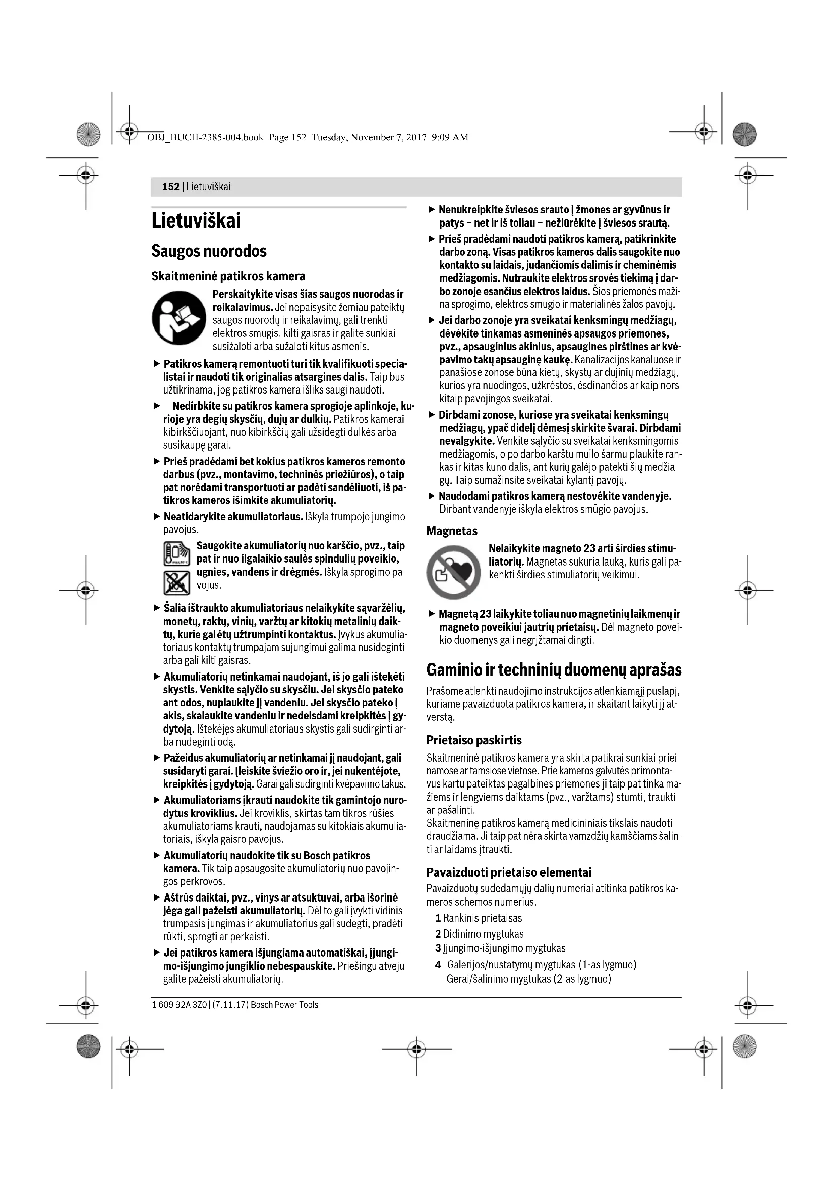OBJ_BUCH-2385-004.book Page 154 Tuesday, November 7, 2017 9:09 AMLietuviškai | 155 Bosch Power Tools 1 609 92A 3Z0 | (7.11.17) Naudojimas Rankinį prietaisą 1 ir akumuliatorių 17 saugokite nuo drėgmės ir tiesioginių saulės spindulių. Tinkamai sujun- gus, kameros kabelis ir kameros galvutė yra nepralaidūs vandeniui. Tačiau rankinis prietaisas ir akumuliatorius nuo vandens nėra apsaugoti, ir, esant kontaktui su vandeniu, iškyla elektros smūgio ir pažeidimų pavojus. Patikros kamerą saugokite nuo ypač aukštos ir žemos temperatūros bei temperatūros svyravimų. Pvz., nepa- likite jos ilgesnį laiką automobilyje. Esant didesniems tem- peratūros svyravimams, prieš pradėdami patikros kamerą naudoti, palaukite, kol stabilizuosis jos temperatūra. Nenaudokite patikros kameros, jei aprasojęs ant kame- ros galvutės 14 esantis lęšis. Patikros kamerą įjunkite tik išgaravus drėgmei. Priešingu atveju patikros kamerą galite pažeisti. Įjungta lemputė 15 veikimo metu gali įkaisti. Kad iš- vengtumėte nudegimo, lemputės nelieskite. Parengimas naudoti „Micro-SD“ kortelės įdėjimas Atidenkite viršutinį dangtelį 10 ir stumkite „Micro-SD“ kortelę 20 iki atramos į lizdą 11. Vėl uždenkite viršutinį dangtelį. Įjungimas ir išjungimas Norėdami patikros kamerą įjungti, paspauskite įjungimo- išjungimo mygtuką 3. Ekrane 9 trumai parodomas pradžios langas. Norėdami patikros kamerą išjungti, dar kartą paspauskite įjungimo-išjungimo mygtuką 3. Jei nepaspaudžiamas joks patikros kameros mygtukas, praė- jus nustatytam laiko intervalui (k), ji automatiškai išsijungia. Lemputės kameros galvutėje reguliavimas Norėdami kameros ekraną pašviesinti, galite įjungti kameros galvutėje esančią lemputę 15 ir reguliuoti šviesos intensy- vumą. Šviesos intensyvumą galima nustatyti 4 pakopomis (0 %, 25 %, 50 %, 100 %). Norėdami įjungti kameros lemputę 15 ir padidinti šviesos in- tensyvumą, pakartotinai spauskite mygtuką 7, kol pasieksite pageidaujamą šviesos intensyvumą. Nežiūrėkite tiesiai į lemputę 15 ir nenukreipkite lempu- tės į kitus asmenis. Lemputės šviesa gali apakinti. Norėdami sumažinti šviesos intensyvumą ir išjungti kameros lemputę 15, pakartotinai spauskite mygtuką 7, kol pasieksite pageidaujamą šviesos intensyvumą arba išjungsite lemputę. Vaizdo ekrane didinimas (mastelio keitimas) Trumpai paspaudę mygtuką 2, galite 1,5 karto arba 2 kartus padidinti ekrano vaizdą. Vaizdo ekrane pasukimas (Up is Up™) (žr. pav. G) Mygtuku 5 pasukite vaizdą taip, kad „viršus“ taip pat ir ekrane būtų rodomas viršuje. Nuoroda: funkcija apribota, esant primontuotam veidrodėliui 25 ir/arba kameros kabelį 13 nukreipus vertikaliai. Fotografavimas/vaizdo įrašymas Mygtuku 8 galite perjungti iš fotografavimo režimo į vaizdo įra- šymo režimą ir atvirkščiai. Nustatytas įrašymo režimas a rodo- mas būsenos eilutėje b. Mygtuku 6, priklausomai nuo nustatyto režimo, fotografuoki- te arba įjunkite ir išjunkite vaizdo įrašymą. Galerijos režimas/nustatymų režimas Spaudžiant mygtuką 4, mygtukams 8, 7, 5 ir 4 priskiriama kita funkcija (priklausomai nuo ekrane virš mygtuko rodomo vaiz- do) (2-as lygmuo). Šiuos mygtukus naudokite pagal ekrane rodomą vaizdą. Trumpai paspaudus mygtuką 4, atidaromas galerijos reži- mas. Paspaudę mygtuką 4, galite matyti vaizdą per visą ekra- ną, o paspaudę mygtuką 6, galite paleisti vaizdo įrašą. Ilgai paspaudus mygtuką 4, atidaromas nustatymų režimas. Galimi šie nustatymai: – Spalvotas vaizdas (raudonas taškas)/juodai baltas vaizdas (žalias taškas) (h) –Ekrano apšvietimas (i) – Data/paros laikas (j) – „Auto-Off“ funkcija: patikros kameros neveikimo interva- las, po kurio ji išsijungia (k) –Ekrano apšvietimo trukmė (l) –„Micro-SD“ kortelės atminties užpildymas/formatavimas (m). Būsenos juosta Būsenos juosta b apie 2 sekundes rodoma ekrane po kie- kvieno mygtuko paspaudimo. Ji rodo: – nustatytą įrašymo režimą (a), – datą ir paros laiką, – nustatytą didinimą (c) – nustatytą šviesos intensyvumą (d) – akumuliatoriaus/baterijų įkrovos būklę (e). Nuotraukų ir vaizdo įrašų perkėlimas Nuotraukas ir vaizdo įrašus galima perkelti tik įdėjus „Micro- SD“ kortelę 20. Norint perkelti nuotraukas ir vaizdo įrašus, patikros kamerą „Micro-USB“ kabeliu 19 galima sujungti su kompiuteriu. Ekrane esantis simbolis rodo, kad patikros kamera sujungta su kompiuteriu. Kompiuteryje patikros kamera rodoma kaip išorinis atminties įtaisas. Patikros kameros akumuliatoriaus per jungtį 12 įkrauti nega- lima. „Micro-USB“ kabelio prijungimas duomenų perdavimui Atidenkite viršutinį dangtelį 10 ir „Micro-USB“ kabelį 19 tin- kama padėtimi įstatykite į jungtį 12. Perkėlę duomenis, atjunkite „Micro-USB“ kabelį ir uždenkite viršutinį dangtelį. OBJ_BUCH-2385-004.book Page 155 Tuesday, November 7, 2017 9:09 AM156 | Lietuviškai 1 609 92A 3Z0 | (7.11.17) Bosch Power Tools Darbo patarimai Apžiūrėkite aplinką, kurią norite tikrinti, ir ypač didelį dėmesį atkreipkite į kliūtis arba pavojaus vietas. Palenkite kameros kabelį 13 taip, kad kameros galvutę būtų galima gerai įvesti į tikrinamą aplinką. Atsargiai įveskite kame- ros kabelį. Tinkamai priderinkite kameros lemputės 15 šviesumą, kad būtų gerai matomas vaizdas. Pvz., jei daiktai labai atspindin- tys, geresnis vaizdas gaunamas su silpnesne šviesa. Jei tiriami daiktai rodomi neryškiai, sumažinkite arba padidin- kite atstumą tarp kameros galvutės 14 ir daikto. Nuorodos, kaip optimaliai elgtis su akumuliatoriumi Saugokite akumuliatorių nuo drėgmės ir vandens. Akumuliatorių sandėliuokite tik nuo –20 °C iki 50 °C tempera- tūroje. Pvz., nepalikite akumuliatoriaus vasarą automobilyje. Jei veikimo laikas po įkrovimo pastebimai sutrumpėja, vadi- nasi akumuliatorius susidėvėjo ir jį reikia pakeisti. V