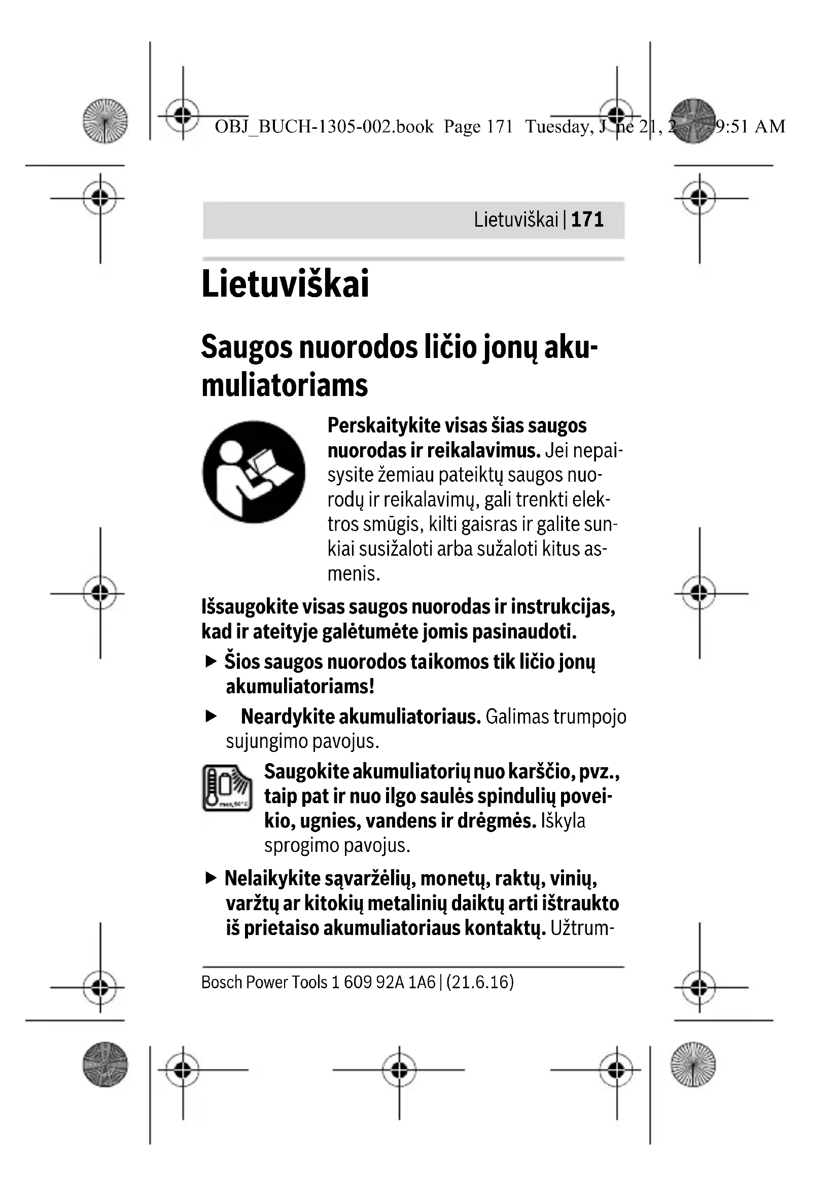 Atbrīvošanās no nolietotajiem izstrādāju- miem Nolietotie elektroinstrumenti, akumulatori, piederumi un iesaiņojuma materiāli jāpakļauj otrreizējai pārstrādei apkārtējai videi nekaitī- gā veidā. Neizmetiet nolietotos elektroinstrumentus, akumula- torus un baterijas sadzīves atkritumu tvertnē! OBJ_BUCH-1305-002.book Page 169 Tuesday, June 21, 2016 9:51 AM170 | Latviešu 1 609 92A 1A6 | (21.6.16) Bosch Power Tools Tikai ES valstīm Atbilstoši Eiropas Savienības direk- tīvai 2012/19/ES par nolietotajām elektriskajām un elektroniskajām ierīcēm, lietošanai nederīgie elek- troinstrumenti, kā arī, atbilstoši di- rektīvai 2006/66/EK, bojātie vai nolietotie akumulatori un baterijas jāsavāc atsevišķi un jānogādā otrreizējai pārstrādei apkārtējai videi ne- kaitīgā veidā. Akumulatori un baterijas Litija-jonu akumulatori Lūdzam ievērot sadaļā „Trans- portēšana“ (lappuse 169) sniegtos norādījumus. Tiesības uz izmaiņām tiek saglabātas. OBJ_BUCH-1305-002.book Page 170 Tuesday, June 21, 2016 9:51 AMLietuviškai | 171 Bosch Power Tools 1 609 92A 1A6 | (21.6.16) Lietuviškai Saugos nuorodos ličio jonų aku- muliatoriams Perskaitykite visas šias saugos nuorodas ir reikalavimus. Jei nepai- sysite žemiau pateiktų saugos nuo- rodų ir reikalavimų, gali trenkti elek- tros smūgis, kilti gaisras ir galite sun- kiai susižaloti arba sužaloti kitus as- menis. Išsaugokite visas saugos nuorodas ir instrukcijas, kad ir ateityje galėtumėte jomis pasinaudoti. Šios saugos nuorodos taikomos tik ličio jonų akumuliatoriams! Neardykite akumuliatoriaus. Galimas trumpojo sujungimo pavojus. Saugokite akumuliatorių nuo karščio, pvz., taip pat ir nuo ilgo saulės spindulių povei- kio, ugnies, vandens ir drėgmės. Iškyla sprogimo pavojus. Nelaikykite sąvaržėlių, monetų, raktų, vinių, varžtų ar kitokių metalinių daiktų arti ištraukto iš prietaiso akumuliatoriaus kontaktų. Užtrum- OBJ_BUCH-1305-002.book Page 171 Tuesday, June 21, 2016 9:51 AM172 | Lietuviškai 1 609 92A 1A6 | (21.6.16) Bosch Power Tools pinus akumuliatoriaus kontaktus galima nusidegin- ti ir sukelti gaisrą. Netinkamai naudojant akumuliatorių, iš jo gali ištekėti skystis. Venkite kontakto su šiuo skys- čiu. Jei skysčio pateko ant odos, nuplaukite jį vandeniu, jei pateko į akis – nedelsdami kreip- kitės į gydytoją. Akumuliatoriaus skystis gali su- dirginti ir nudeginti odą. Pažeidus akumuliatorių ar netinkamai jį naudo- jant, gali išsiveržti garai. Išvėdinkite patalpą, o jei atsirado negalavimų, kreipkitės į gydytoją. Šie garai gali sudirginti kvėpavimo takus. Akumuliatoriui įkrauti naudokite tik tuos įkrovi- klius, kuriuos rekomenduoja gamintojas. Nau- dojant kitokio tipo akumuliatoriams skirtą įkroviklį, iškyla gaisro pavojus. Jei akumuliatorius pažeistas, gali ištekėti skys- tis ir patekti ant šalia esančių daiktų. Patikrinki- te daiktus ir dalis, ant kurių pateko skysčio. Jas nuvalykite arba, jei reikia, pakeiskite. Akumuliatorių naudokite tik su jūsų Bosch ga- miniu. Tik taip apsaugosite akumuliatorių nuo pa- vojingos perkrovos. Aštrūs daiktai, pvz., vinys ar atsuktuvai, arba iš- orinė jėga gali pažeisti akumuliatorių. Dėl to gali įvykti vidinis trumpasis jungimas ir akumuliatorius gali sudegti, pradėti r ūkti, sprogti ar perkaisti. OBJ_BUCH-1305-002.book Page 172 Tuesday, June 21, 2016 9:51 AMLietuviškai | 173 Bosch Power Tools 1 609 92A 1A6 | (21.6.16) Naudojimas Nuorodos, kaip optimaliai elgtis su akumu- liatoriumi Nuoroda: Akumuliatorius pateikiamas iš dalies įkrau- tas. Kad akumuliatorius veiktų visa galia, prieš pirmąjį naudojimą akumuliatorių kroviklyje visiškai įkraukite. Ličio jonų akumuliatorių galima įkrauti bet kada, eks- ploatavimo trukmė dėl to nesutrumpėja. Krovimo pro- ceso nutraukimas akumuliatoriui nekenkia. Celių apsaugos sistema „Electronic Cell Protection (ECP)“ saugo ličio jonų akumuliatorių nuo visiškos iš- krovos. Kai akumuliatorius išsikrauna, apsauginis iš- jungiklis išjungia elektrinį įrankį, ir darbo įrankis nebe- sisuka. Jeigu elektrinis įrankis išsijungė automatiškai, nebandykite vėl spausti įjungimo-išjungimo jungiklio. Taip galite sugadinti ličio jonų akumulia- torių. Akumuliatorius turi NTC temperatūros kontrolės davi- klį, kuris leidžia įkrauti akumuliatorių tik tuomet, kai jo temperatūra yra tarp 0 °C ir 45 °C. Tai gerokai pailgi- na akumuliatoriaus naudojimo laiką. Akumuliatorių sandėliuokite tik nuo –20 °C iki 50 °C temperatūroje. Pvz., nepalikite akumuliatoriaus vasa- rą automobilyje. OBJ_BUCH-1305-002.book Page 173 Tuesday, June 21, 2016 9:51 AM174 | Lietuviškai 1 609 92A 1A6 | (21.6.16) Bosch Power Tools Pastebimas įkrauto akumuliatoriaus veikimo laiko su- trumpėjimas rodo, kad akumuliatorius susidėvėjo ir jį reikia pakeisti. Vadovaukitės pateiktomis nuorodomis dėl prietaiso ir akumuliatoriaus šalinimo. Priežiūra ir servisas Priežiūra ir valymas Akumuliatoriaus ventiliacines angas valykite minkštu, švariu ir sausu teptuku. Jei akumuliatorius nebeveikia, prašome kreiptis į Bosch įgaliotą klientų aptarnavimo tarnybą. Transportavimas Kartu pateikiamų ličio jonų akumuliatorių gabenimui taikomos pavojingų krovinių gabenimą reglamentuo- jančių įstatymų nuostatos. Naudotojui akumuliatorius gabenti keliais leidžiama be jokių apribojimų. Jei siunčiant pasitelkiami tretieji asmenys (pvz., oro transportas, ekspedijavimo įmonė), būtina atsižvelgti į pakuotei ir ženklinimui taikomus ypatingus reikalavi- mus. Būtina, kad rengiant siuntą dalyvautų pavojingų krovinių gabenimo specialistas. Siųskite tik tokius akumuliatorius, kurių nepažeistas korpusas. Apklijuokite kontaktus ir supakuokite aku- muliatorių taip, kad jis pakuotėje nejudėtų. OBJ_BUCH-1305-002.book Page 174 Tuesday, June 21, 2016 9:51 AMLietuviškai | 175 Bosch Power Tools 1 609 92A 1A6 | (21.6.16) Taip p