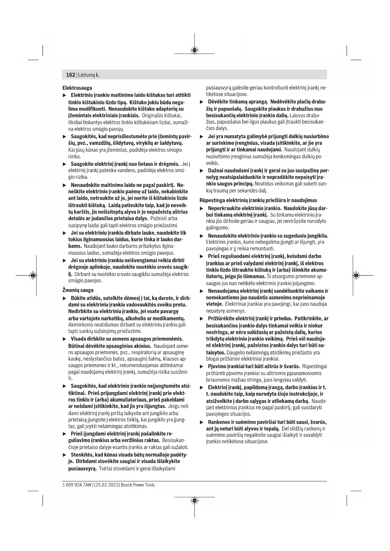 0,7 Aliuminis 200 2,0 Štampo tepimas ir aušinimas Kad štampo(8) eksploatavimo trukmė būtų ilgesnė, reikia naudoti tinkamą aušinimo ir tepimo priemonę (pvz., kirpimo alyvą). Skardą iš viršaus palei numatytą kirpimo liniją patepkite kir- pimo alyva. Kirpimas pagal piešinį arba šabloną Kirpti tiesiai bus lengviau, jei elektrinį įrankį vesite pagal li- niuotę. Kontūrą galima išpjauti stumiant įrankį pagal šabloną. Norint iškirpti vidinį kontūrą, pirmiausiai reikia išgręžti22mm skersmens skylę. Su temperatūros pokyčiu susijusi apsauga nuo perkrovos Jei elektrinis įrankis naudojamas pagal paskirtį, jis nebus vei- kiamas perkrovos. Jei įrankis veikiamas perkrovos arba tem- peratūra yra už leidžiamosios akumuliatoriaus temperatūros ribų, bus sumažinamas judesių skaičius arba elektrinis įra- nkis išsijungs. Sumažėjus judesių skaičiui, elektrinis įrankis didesniu judesių skaičiumi pradės veikti tik tada, kai bus pa- siekta leidžiamoji akumuliatoriaus temperatūra. Elektriniam įrankiui išsijungus automatiškai, išjunkite jį jungikliu, palau- kite, kol atvės akumuliatorius ir elektrinį įrankį vėl įjunkite. Priežiūra ir servisas Priežiūra ir valymas u Prieš atliekant bet kokius elektrinio įrankio priežiūros darbus (atliekant techninę priežiūrą ar keičiant įrankį ir t. t.), o taip pat elektrinį įrankį transportuojant ir sandėliuojant, būtina iš jo išimti akumuliatorių. Prie- Bosch Power Tools 1 609 92A 7AW | (25.02.2022)166 | 한국어 šingu atveju galite susižeisti, netyčia nuspaudę įjungimo- išjungimo jungiklį. u Kad galėtumėte gerai ir saugiai dirbti, pasirūpinkite, kad elektrinis įrankis ir ventiliacinės angos būtų šva- rūs. Kas 3 darbo valandas išvalykite ir patepkite alyva štampą(8) ir matricą(9). Laiku pakeiskite susidėvėjusį štampą ir matricą, nes tik aštrūs įrankiai užtikrina gerą kirpimo našumą ir tausoja elekt- rinį įrankį. Štampą(8) ir matricą(9) galąsti draudžiama. Matricos keitimas Varžtą briaunuota galvute(11) išsukite iš matricos laikiklio(7). Išimkite matricą(9). Jei reikia, išvalykite matricos laikiklį(7). Į matricos laikiklį įstatykite naują, gerai alyva pateptą matricą(9). Atkreipkite dėmesį, kad tinkamai būtų nukreipta plokščioji pusė. Vėl įsukite varžtą briaunota galvute(11) su uždėtu guminiu žiedu(10). Šešiabriaunu raktu užveržkite varžtą, spausdami jį prie guminio žiedelio (3−4Nm). Štampo keitimas Atlaisvinkite varžtą(4), o matricos laikiklį(7) visiškai ištrau- kite iš korpuso. Stumkite štampą(8) šonu iš įtvaro ir išimkite jį, traukdami žemyn. Į įtvaro griovelį įdėkite naują, gerai alyva pateptą štampą(8) ir nustatykite į vidurį. Matricos laikiklį(7) atsargiai stumkite per štampą atgal į kor- pusą. Priklausomai nuo pageidaujamos pjovimo krypties, matricos laikiklį pasukite į vieną iš trijų galimų padėčių. Tada tvirtai priveržkite varžtą(4). Klientų aptarnavimo skyrius ir konsultavimo tarnyba Klientų aptarnavimo skyriuje gausite atsakymus į klausimus, susijusius su jūsų gaminio remontu, technine priežiūra bei at- sarginėmis dalimis. Detalius brėžinius ir informacijos apie at- sargines dalis rasite interneto puslapyje: www.bosch-pt.com Bosch konsultavimo tarnybos specialistai mielai pakonsul- tuos Jus apie gaminius ir jų papildomą įrangą. Ieškant informacijos ir užsakant atsargines dalis prašome bū- tinai nurodyti dešimtženklį gaminio numerį, esantį firminėje lentelėje. Lietuva Bosch įrankių servisas Informacijos tarnyba: (037) 713350 ļrankių remontas: (037) 713352 Faksas: (037) 713354 El. paštas: service-pt@lv.bosch.com Kitus techninės priežiūros skyriaus adresus rasite čia: www.bosch-pt.com/serviceaddresses Transportavimas Rekomenduojamų ličio jonų akumuliatorių gabenimui taiko- mos pavojingų krovinių gabenimą reglamentuojančių įstaty- mų nuostatos. Naudotojui akumuliatorius gabenti keliais lei- džiama be jokių apribojimų. Jei siunčiant pasitelkiami tretieji asmenys (pvz., oro transpo- rtas, ekspedijavimo įmonė), būtina atsižvelgti į pakuotei ir ženklinimui taikomus ypatingus reikalavimus. Būtina, kad rengiant siuntą dalyvautų pavojingų krovinių gabenimo spe- cialistas. Siųskite tik tokius akumuliatorius, kurių nepažeistas kor- pusas. Apklijuokite kontaktus ir supakuokite akumuliatorių taip, kad jis pakuotėje nejudėtų. Taip pat laikykitės ir esamų papildomų nacionalinių taisyklių. Šalinimas Elektriniai įrankiai, akumuliatoriai, papildoma įranga ir pakuotės turi būti ekologiškai utilizuo- jami. Elektrinių įrankių, akumuliatorių bei baterijų ne- meskite į buitinių atliekų konteinerius! Tik ES šalims: Pagal Europos direktyvą 2012/19/ES dėl elektros ir elekt- roninės įrangos atliekų ir šios direktyvos perkėlimo į naciona- linę teisę aktus nebetinkami naudoti elektriniai įrankiai ir pa- gal 2006/66/EB pažeisti ir susidėvėję akumuliatoriai/bate- rijos turi būti surenkami atskirai ir perdirbami aplinkai neke- nksmingu būdu. Netinkamai pašalintos elektros ir elektroninės įrangos atlie- kos dėl galimų pavojingų medžiagų gali turėti žalingą poveikį aplinkai ir žmonių sveikatai. Akumuliatoriai ir baterijos: Ličio jonų: prašome laikytis transportavimo skyriuje pateiktų nuorodų (žr. „Transportavimas“, Puslapis166).