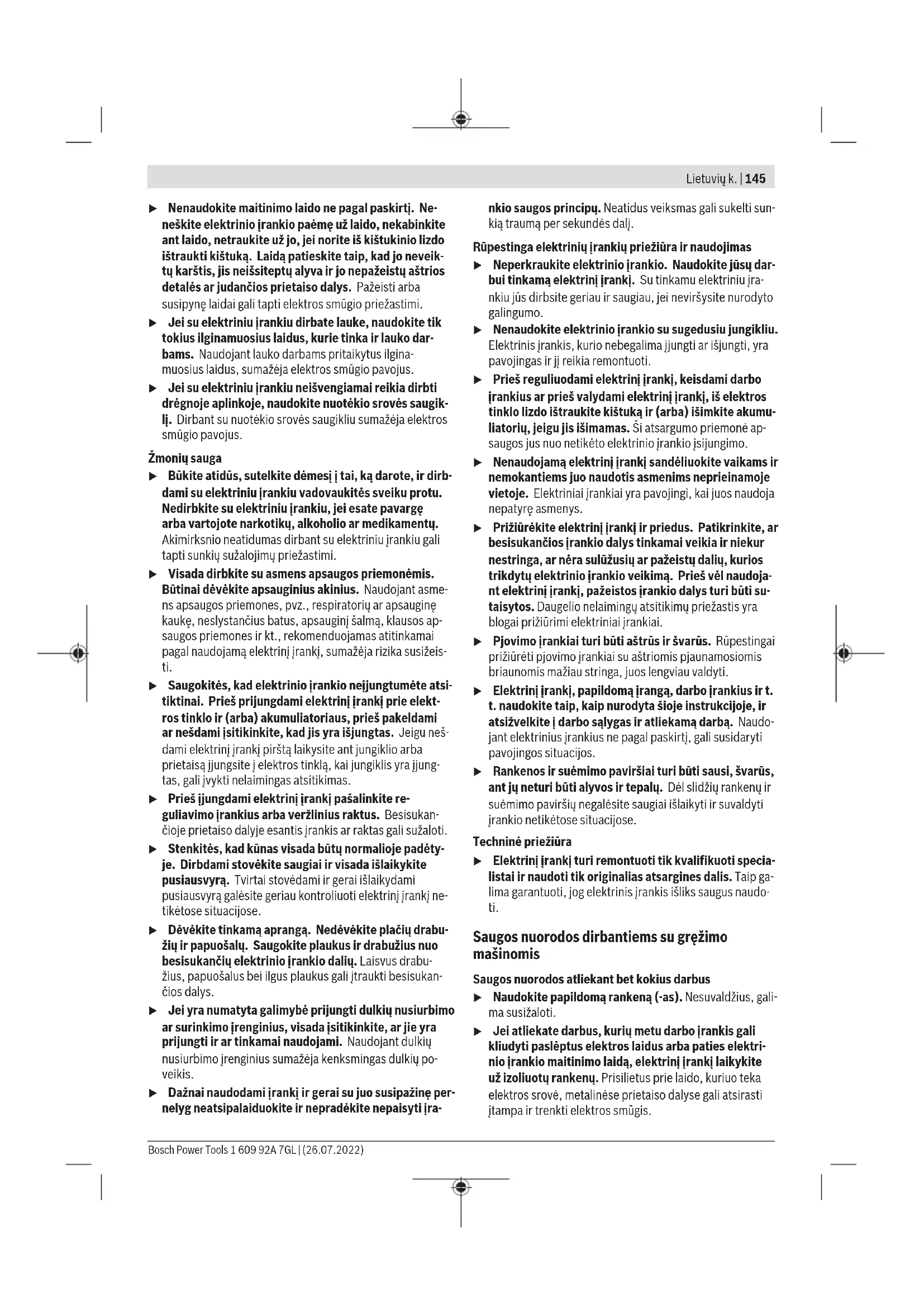 Šioje instrukcijoje pateiktas vibracijos lygis ir triukšmo emisi- ja buvo išmatuoti pagal standartizuotą matavimo metodą, ir juos galima naudoti elektriniams įrankiams palyginti. Jie taip pat skirti vibracijos ir triukšmo emisijai iš anksto įvertinti. Nurodytas vibracijos lygis ir triukšmo emisijos vertė atspindi pagrindinius elektrinio įrankio naudojimo atvejus. Tačiau jei- gu elektrinis įrankis naudojamas kitokiai paskirčiai, su kito- kiais darbo įrankiais arba jeigu jis nepakankamai techniškai prižiūrimas, vibracijos lygis ir triukšmo emisijos vertė gali ki- sti. Tokiu atveju vibracijos ir triukšmo emisija per visą darbo laikotarpį gali žymiai padidėti. Norint tiksliai įvertinti vibracijos ir triukšmo emisiją per tam tikrą darbo laiką, reikia atsižvelgti ir į laiką, per kurį elektrinis įrankis buvo išjungtas arba, nors ir veikė, bet nebuvo naudo- jamas. Tai įvertinus, vibracijos ir triukšmo emisija per visą darbo laiką žymiai sumažės. Dirbančiajam nuo vibracijos poveikio apsaugoti paskirkite papildomas apsaugos priemones, pvz.: elektrinių ir darbo įrankių techninę priežiūrą, rankų šildymą, darbo eigos orga- nizavimą. Montavimas u Prieš atliekant bet kokius elektrinio įrankio reguliavi- mo ar priežiūros darbus reikia ištraukti kištuką iš elektros tinklo lizdo. Papildoma rankena (žr.Apav.) u Elektrinį įrankį naudokite tik su papildoma rankena (2). Papildomą rankeną(2) įsukite į sriegį(3), esantį ant variklio korpuso. Rankena prietaisui nešti (žr.Apav.) Rankeną prietaisui nešti(4) tolygiai galima sukti 360°kam- pu. Įrankių keitimas u Įrankį keiskite mūvėdami apsauginėmis pirštinėmis. Atliekant ilgesnes darbo operacijas griebtuvas gali smar- kiai įkaisti. Vainikinis griebtuvas su automatiniu fiksatoriumi (žr.Bpav.) Sukdami atverkite vainikinį griebtuvą(1) tiek, kad galėtumė- te įstatyti įrankį. Įstatykite įrankį. Griebtuvo raktą(9) įstatykite į vainikinio griebtuvo(1) atitinkamą angą ir tolygiai veržkite įrankį. Griebtuvo keitimas (žr.Cpav.) u Prieš atliekant bet kokius elektrinio įrankio reguliavi- mo ar priežiūros darbus reikia ištraukti kištuką iš elektros tinklo lizdo. Apsauginio varžto išsukimas Kad vainikinis griebtuvas(1) netikėtai nenukristų nuo grę- žimo suklio, jis yra su apsauginiu varžtu(10). Visiškai atidarykite vainikinį griebtuvą(1) ir išsukite apsaugi- nį varžtą(10), sukdami jį pagal laikrodžio rodyklę. Atkreip- kite dėmesį, kad apsauginis varžtas yra su kairiniu srie- giu. Jei apsauginis varžtas(10) tvirtai įsuktas, į varžto galvutę įstatykite atsuktuvą, o apsauginį varžtą atlaisvinkite stuktelė- ję į atsuktuvo rankeną. Griebtuvo nuėmimas Norėdami išmontuoti vainikinį griebtuvą(1), ant veržlės, esančios ant suklio, uždėkite veržliaraktį (rakto plotis 17). Viena ranka tvirtai laikykite vainikinį griebtuvą, o kita ranka sukite veržliaraktį prieš laikrodžio rodyklę, kol griebtuvas at- silaisvins nuo gręžimo suklio kūgio. Griebtuvo sumontavimas u Saugokite gręžimo suklio kūgį ir griebtuvo kiaurymę nuo tepalų ir nešvarumų. Norėdami įstatyti vainikinį griebtuvą(1), sukite veržlę, esan- čią ant suklio, pagal laikrodžio rodyklę iki atramos. Nenaudodami jėgos stumkite vainikinį griebtuvą ant suklio, kol jis tvirtai įsistatys. Guminiu plaktuku atsargiai pastuksenkite į vainikinio griebtuvo(1) priekinę pusę, kad vainikinis griebtuvas tikrai tvirtai įsistatytų. Stebėkite, kad vainikinio griebtuvo užver- žiamieji kumšteliai nebūtų išlindę ir jų nepažeistumėte. Apsauginio varžto montavimas Apsauginį varžtą(10) prieš laikrodžio rodyklę sukite į atvirą vainikinį griebtuvą. Kiekvieną kartą naudokite naują apsaugi- nį varžtą, nes jo sriegis yra pateptas lipnia apsaugine mase, kuri po kelių naudojimų praranda savo poveikį. Dulkių, pjuvenų ir drožlių nusiurbimas Medžiagų, kurių sudėtyje yra švino, kai kurių rūšių medienos, mineralų ir metalų dulkės gali būti kenksmingos sveikatai. Dirbančiajam arba netoli esantiems asmenims nuo sąlyčio su dulkėmis arba jų įkvėpus gali kilti alerginės reakcijos, taip pat jie gali susirgti kvėpavimo takų ligomis. Kai kurios dulkės, pvz., ąžuolo ir buko, yra vėžį sukeliančios, o ypač, kai mediena yra apdorota specialiomis medienos priežiūros priemonėmis (chromatu, medienos apsaugos priemonėmis). Medžiagas, kuriose yra asbesto, leidžiama apdoroti tik specialistams. – Pasirūpinkite geru darbo vietos vėdinimu. – Rekomenduojama dėvėti kvėpavimo takų apsauginę kaukę su P2 klasės filtru. Laikykitės jūsų šalyje galiojančių apdorojamoms medžia- goms taikomų taisyklių. u Saugokite, kad darbo vietoje nesusikauptų dulkių. Dul- kės lengvai užsidega. Bosch Power Tools 1 609 92A 7GL | (26.07.2022)148 | Lietuvių k. Naudojimas Paruošimas naudoti u Atkreipkite dėmesį į tinklo įtampą! Maitinimo šaltinio įtampa turi sutapti su elektrinio įrankio firminėje le- ntelėje nurodytais duomenimis. 230V pažymėtus elektrinius įrankius galima jungti ir į 220V įtampos elektros tinklą. Sukimosi krypties nustatymas (žr.Dpav.) Sukimosi krypties perjungikliu (7) galite pakeisti elektrinio įrankio sukimosi kryptį. Tačiau tuomet, kai įjungimo-išjungi- mo jungiklis (6) yra nuspaustas, tai padaryti yra neįmanoma. Dešininis sukimasis: norėdami gręžti ar maišyti, sukimosi krypties perjungiklį(7) stumkite kairėn iki atramos. Kairinis sukimasis: norėdami atlaisvinti ar maišyti, sukimosi krypties perjungiklį(7) stumkite dešinėn iki atramos. Įjungimas ir išjungimas Norėdami elektrinį įrankį įjungti, paspauskite įjungimo-išjun- gimo jungiklį (6) ir laikykite jį paspaustą. Norėdami užfiksuoti paspaustą įjungimo-išjungimo jungiklį (6), paspauskite fiksatorių (5). Norėdami elektrinį įrankį išjungti, atleiskite įjungimo-išjungi- mo jungiklį (6), o jei ji