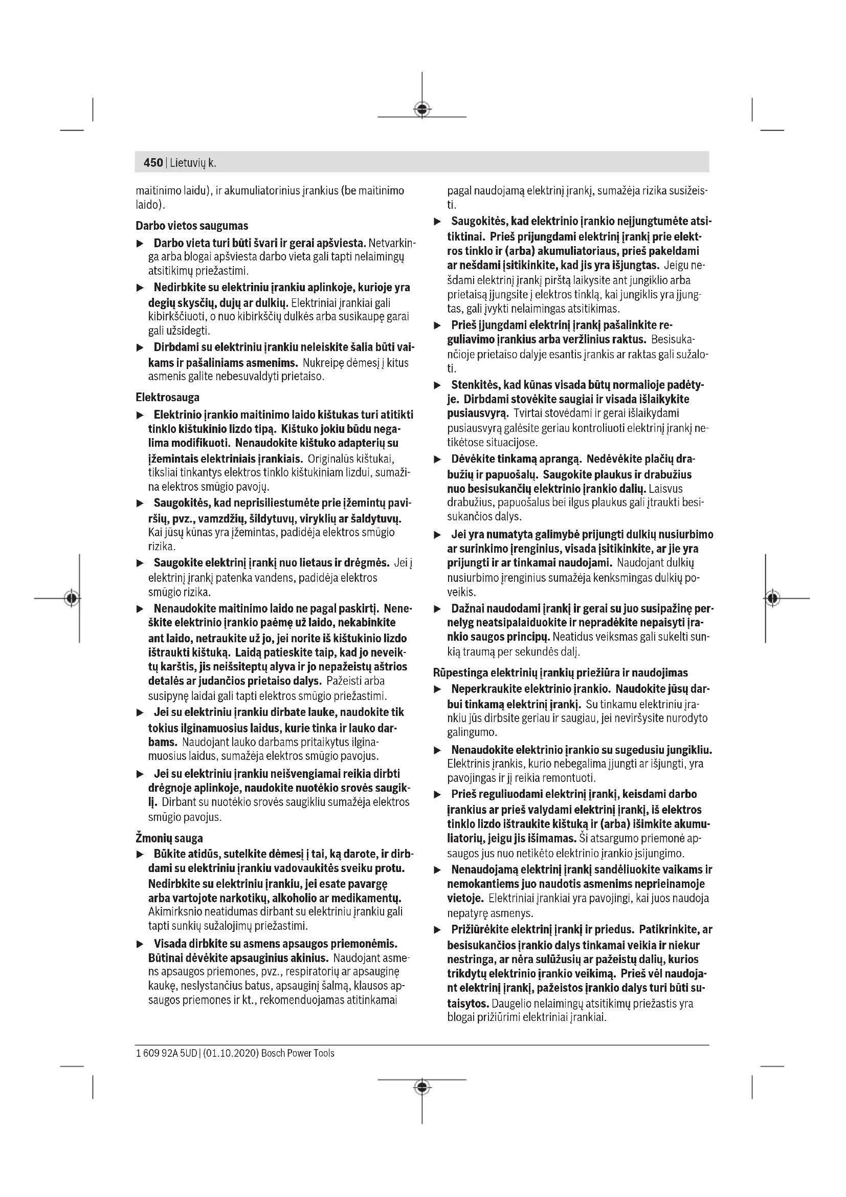 Klientu apkalpošanas dienests un konsultācijas par lietošanu Klientu apkalpošanas dienests atbildēs uz Jūsu jautājumiem par izstrādājumu remontu un apkalpošanu, kā arī par to rezerves daļām. Kopsalikuma attēlus un informāciju par rezerves daļām Jūs varat atrast interneta vietnē: www.bosch-pt.com Bosch konsultantu grupa palīdzēs Jums vislabākajā veidā rast atbildes uz jautājumiem par mūsu izstrādājumiem un to piederumiem. Pieprasot konsultācijas un pasūtot rezerves daļas, noteikti paziņojiet 10 zīmju izstrādājuma numuru, kas norādīts uz izstrādājuma marķējuma plāksnītes. Latvijas Republika Robert Bosch SIA Bosch elektroinstrumentu servisa centrs Mūkusalas ielā 97 LV-1004 Rīga Tālr.: 67146262 Telefakss: 67146263 E-pasts: service-pt@lv.bosch.com Papildu klientu apkalpošanas dienesta adreses skatiet šeit: www.bosch-pt.com/serviceaddresses Atbrīvošanās no nolietotajiem izstrādājumiem Nolietotie elektroinstrumenti, to piederumi un iesaiņojuma materiāli jāpakļauj otrreizējai pārstrādei apkārtējai videi nekaitīgā veidā. Neizmetiet elektroinstrumentu sadzīves atkritumu tvertnē! Tikai EK valstīm. Saskaņā ar Eiropas Savienības direktīvu 2012/19/ES par nolietotajām elektriskajām un elektroniskajām ierīcēm un šīs direktīvas atspoguļojumiem nacionālajā likumdošanā, lietošanai nederīgie elektroinstrumenti jāsavāc atsevišķi un jānogādā otrreizējai pārstrādei apkārtējai videi nekaitīgā veidā. Lietuvių k. Saugos nuorodos Bendrosios darbo su elektriniais įrankiais saugos nuorodos ĮSPĖJIMAS Perskaitykite visus su šiuo elektri- niu įrankiu pateikiamus saugos įspėjimus, instrukcijas, peržiūrėkite iliustracijas ir speci- fikacijas. Jei nepaisysite visų žemiau pateiktų instrukcijų, galite patirti elektros smūgį, sukelti gaisrą ir sunkiai susižaloti arba sužaloti kitus asmenis. Išsaugokite šias saugos nuorodas ir reikalavimus, kad ir ateityje galėtumėte jais pasinaudoti. Toliau pateiktame tekste vartojama sąvoka „Elektrinis įra- nkis“ apibūdina įrankius, maitinamus iš elektros tinklo (su Bosch Power Tools 1 609 92A 5UD | (01.10.2020)450 | Lietuvių k. maitinimo laidu), ir akumuliatorinius įrankius (be maitinimo laido). Darbo vietos saugumas u Darbo vieta turi būti švari ir gerai apšviesta. Netvarkin- ga arba blogai apšviesta darbo vieta gali tapti nelaimingų atsitikimų priežastimi. u Nedirbkite su elektriniu įrankiu aplinkoje, kurioje yra degių skysčių, dujų ar dulkių. Elektriniai įrankiai gali kibirkščiuoti, o nuo kibirkščių dulkės arba susikaupę garai gali užsidegti. u Dirbdami su elektriniu įrankiu neleiskite šalia būti vai- kams ir pašaliniams asmenims. Nukreipę dėmesį į kitus asmenis galite nebesuvaldyti prietaiso. Elektrosauga u Elektrinio įrankio maitinimo laido kištukas turi atitikti tinklo kištukinio lizdo tipą. Kištuko jokiu būdu nega- lima modifikuoti. Nenaudokite kištuko adapterių su įžemintais elektriniais įrankiais. Originalūs kištukai, tiksliai tinkantys elektros tinklo kištukiniam lizdui, sumaži- na elektros smūgio pavojų. u Saugokitės, kad neprisiliestumėte prie įžemintų pavi- ršių, pvz., vamzdžių, šildytuvų, viryklių ar šaldytuvų. Kai jūsų kūnas yra įžemintas, padidėja elektros smūgio rizika. u Saugokite elektrinį įrankį nuo lietaus ir drėgmės. Jei į elektrinį įrankį patenka vandens, padidėja elektros smūgio rizika. u Nenaudokite maitinimo laido ne pagal paskirtį. Nene- škite elektrinio įrankio paėmę už laido, nekabinkite ant laido, netraukite už jo, jei norite iš kištukinio lizdo ištraukti kištuką. Laidą patieskite taip, kadjo neveik- tų karštis, jis neišsiteptų alyva ir jo nepažeistų aštrios detalės ar judančios prietaiso dalys. Pažeisti arba susipynę laidai gali tapti elektros smūgio priežastimi. u Jei su elektriniu įrankiu dirbate lauke, naudokite tik tokius ilginamuosius laidus, kurie tinka ir lauko dar- bams. Naudojant lauko darbams pritaikytus ilgina- muosius laidus, sumažėja elektros smūgio pavojus. u Jei su elektriniu įrankiu neišvengiamai reikia dirbti drėgnoje aplinkoje, naudokite nuotėkio srovės saugik- lį. Dirbant su nuotėkio srovės saugikliu sumažėja elektros smūgio pavojus. Žmonių sauga u Būkite atidūs, sutelkite dėmesį į tai, kądarote, ir dirb- dami su elektriniu įrankiu vadovaukitės sveiku protu. Nedirbkite su elektriniu įrankiu, jei esate pavargę arba vartojote narkotikų, alkoholio ar medikamentų. Akimirksnio neatidumas dirbant su elektriniu įrankiu gali tapti sunkių sužalojimų priežastimi. u Visada dirbkite su asmens apsaugos priemonėmis. Būtinai dėvėkite apsauginius akinius. Naudojant asme- ns apsaugos priemones, pvz., respiratorių ar apsauginę kaukę, neslystančius batus, apsauginį šalmą, klausos ap- saugos priemones ir kt., rekomenduojamas atitinkamai pagal naudojamą elektrinį įrankį, sumažėja rizika susižeis- ti. u Saugokitės, kad elektrinio įrankio neįjungtumėte atsi- tiktinai. Prieš prijungdami elektrinį įrankį prie elekt- ros tinklo ir (arba) akumuliatoriaus, prieš pakeldami ar nešdami įsitikinkite, kad jis yra išjungtas. Jeigu ne- šdami elektrinį įrankį pirštą laikysite ant jungiklio arba prietaisą įjungsite į elektros tinklą, kai jungiklis yra įjung- tas, gali įvykti nelaimingas atsitikimas. u Prieš įjungdami elektrinį įrankį pašalinkite re- guliavimo įrankius arba veržlinius raktus. Besisuka- nčioje prietaiso dalyje esantis įrankis ar raktas gali sužalo- ti. u Stenkitės, kad kūnas visada būtų normalioje padėty- je. Dirbdami stovėkite saugiai ir visada išlaikykite pusiausvyrą. Tvirtai stovėdami ir gerai išlaikydami pusiausvyrą galėsite geriau kontroliuoti elektrinį įrankį ne- tikėtose situacijose. u Dėvėkite tinkamą aprangą. Nedėvėkite plačių dra- bužių ir papuošalų. Saugokite plaukus ir drabužius nuo besisukančių
