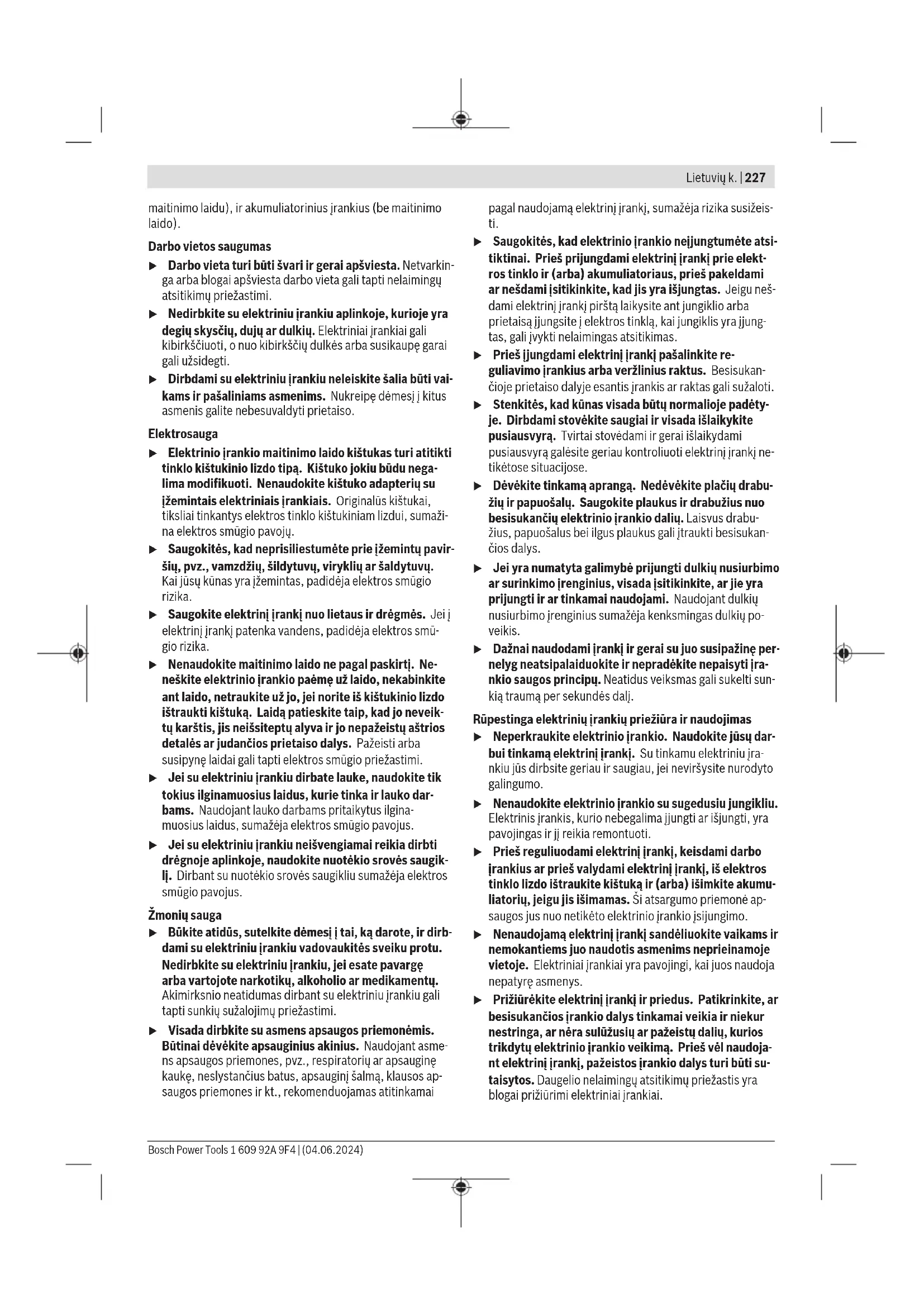 1,5 1,5 1,5 Šioje instrukcijoje pateiktas vibracijos lygis ir triukšmo emisi- ja buvo išmatuoti pagal standartizuotą matavimo metodą, ir juos galima naudoti elektriniams įrankiams palyginti. Jie taip pat skirti vibracijos ir triukšmo emisijai iš anksto įvertinti. Nurodytas vibracijos lygis ir triukšmo emisijos vertė atspindi pagrindinius elektrinio įrankio naudojimo atvejus. Tačiau jei- gu elektrinis įrankis naudojamas kitokiai paskirčiai, su kito- kiais darbo įrankiais arba jeigu jis nepakankamai techniškai prižiūrimas, vibracijos lygis ir triukšmo emisijos vertė gali ki- sti. Tokiu atveju vibracijos ir triukšmo emisija per visą darbo laikotarpį gali žymiai padidėti. Norint tiksliai įvertinti vibracijos ir triukšmo emisiją per tam tikrą darbo laiką, reikia atsižvelgti ir į laiką, per kurį elektrinis įrankis buvo išjungtas arba, nors ir veikė, bet nebuvo naudo- jamas. Tai įvertinus, vibracijos ir triukšmo emisija per visą darbo laiką žymiai sumažės. Dirbančiajam nuo vibracijos poveikio apsaugoti paskirkite papildomas apsaugos priemones, pvz.: elektrinių ir darbo įrankių techninę priežiūrą, rankų šildymą, darbo eigos orga- nizavimą. Montavimas u Naudokite tik tokius diskus, kurių maksimalus leis- tinas greitis yra didesnis už elektrinio prietaiso tuščio- sios eigos sūkių skaičių. Pjūklo disko įdėjimas ir keitimas u Prieš atliekant bet kokius elektrinio įrankio reguliavi- mo ar priežiūros darbus reikia ištraukti kištuką iš elektros tinklo lizdo. u Montuodami pjūklo diską mūvėkite apsaugines pirš- tines. Prisilietus prie pjūklo disko iškyla susižalojimo pa- vojus. u Su šiuo prietaisu kaip darbo įrankių jokiu būdu nenau- dokite šlifavimo diskų. u Naudokite tik tokius pjūklo diskus, kurie atitinka šioje naudojimo instrukcijoje ir ant elektrinio įrankio pa- teiktus duomenis ir yra patikrinti pagal EN847‑1 bei atitinkamai paženklinti. Pjūklo disko pasirinkimas Rekomenduojamų pjūklo diskų apžvalgą rasite šios instrukci- jos gale. Pjūklo disko išmontavimas (žr. A pav.) Pjovimo įrankį patogiausia pakeisti paguldžius elektrinį įrankį ant priekinės variklio korpuso pusės. – Paspauskite suklio fiksuojamąjį klavišą (5) ir laikykite jį paspaustą. u Suklio fiksuojamąjį klavišą (5) spauskite tik tada, kai šlifavimo suklys visiškai sustojęs. Priešingu atveju gali- te pažeisti elektrinį įrankį. – Šešiabriauniu raktu (4) išsukite tvirtinamąjį varžtą (20), sukdami jį kryptimi ➊. – Slankųjį apsauginį gaubtą (12) atgal ir laikykite jį tokioje padėtyje. – Nuo šlifavimo suklio (24) nuimkite prispaudžiamąją jungę (21) ir pjūklo diską (22). Pjūklo disko sumontavimas (žr. A pav.) Pjovimo įrankį patogiausia pakeisti paguldžius elektrinį įrankį ant priekinės variklio korpuso pusės. – Nuvalykite pjūklo diską (22) ir visas tvirtinamąsias dalis, kurias ruošiatės montuoti. – Slankųjį apsauginį gaubtą (12) atgal ir laikykite jį tokioje padėtyje. – Uždėkite pjūklo diską (22) ant tvirtinamosios jungės (23). Pjūklo dantų pjovimo kryptis (rodyklė ant pjūklo dis- ko) ir sukimosi krypties rodyklė ant apsauginio gaubto (12) turi sutapti. – Uždėkite tvirtinamąją jungę (21) ir užveržkite tvirtinamąjį varžtą (20), sukdami jį kryptimi ➋. Atkreipkite dėmesį į tinkamą tvirtinamosios jungės (23) ir prispaudžiamosios jungės (21) montavimo padėtį. – Paspauskite suklio fiksuojamąjį klavišą (5) ir laikykite jį paspaustą. – Šešiabriauniu raktu (4) užveržkite tvirtinamąjį varžtą (20), sukdami ➋ kryptimi. Užveržimo momentas turi būti lygus 6–9 Nm, tai atitinka užveržimą ranka plius ¼ sūkio. Dulkių, pjuvenų ir drožlių nusiurbimas Medžiagų, kurių sudėtyje yra švino, kai kurių rūšių medienos, mineralų ir metalų dulkės gali būti kenksmingos sveikatai. Dirbančiajam arba netoli esantiems asmenims nuo sąlyčio su dulkėmis arba jų įkvėpus gali kilti alerginės reakcijos, taip pat jie gali susirgti kvėpavimo takų ligomis. Kai kurios dulkės, pvz., ąžuolo ir buko, yra vėžį sukeliančios, o ypač, kai mediena yra apdorota specialiomis medienos priežiūros priemonėmis (chromatu, medienos apsaugos priemonėmis). Medžiagas, kuriose yra asbesto, leidžiama apdoroti tik specialistams. – Jei yra galimybė, naudokite apdirbamai medžiagai tinkan- čią dulkių nusiurbimo įrangą. – Pasirūpinkite geru darbo vietos vėdinimu. – Rekomenduojama dėvėti kvėpavimo takų apsauginę kaukę su P2 klasės filtru. Laikykitės jūsų šalyje galiojančių apdorojamoms medžia- goms taikomų taisyklių. u Saugokite, kad darbo vietoje nesusikauptų dulkių. Dul- kės lengvai užsidega. Bosch Power Tools 1 609 92A 9F4 | (04.06.2024)232 | Lietuvių k. Nusiurbimo adapterio montavimas (žr. B pav.) Nusiurbimo adapterį (26) stumkite ant drožlių išmetimo an- gos (16), kol užsifiksuos. Nusiurbimo adapterį (26) papildo- mai užfiksuokite varžtu (25). Prie nusiurbimo adapterio (26) galima prijungti 35 mm skersmens nusiurbimo žarną. u Neprijungus išorinės dulkių nusiurbimo įrangos, nu- siurbimo adapterį naudoti draudžiama. Priešingu atveju gali užsikimšti nusiurbimo kanalas. u Prie nusiurbimo adapterio dulkių surinkimo maišelį prijungti draudžiama. Priešingu atveju gali užsikimšti nu- siurbimo sistema. Siekiant užtikrinti optimalų nusiurbimą, reikia reguliariai iš- valyti nusiurbimo adapterį (26). Išorinis dulkių nusiurbimas Nusiurbimo žarną sujunkite su dulkių siurbliu (papildoma įranga). Apžvalgą, kaip prijungti prie įvairių dulkių siurblių, rasite šios instrukcijos gale. Elektrinį įrankį galima prijungti tiesiai prie Bosch univer- salaus siurblio su nuotolinio įjungimo įrenginiu kištukinio liz- do. Įjungus elektrinį įrankį, siurblys įsijungs automatiškai. Dulkių siurblys turi būti pritaikytas apdirbamo ruošinio pju- venoms, drožl