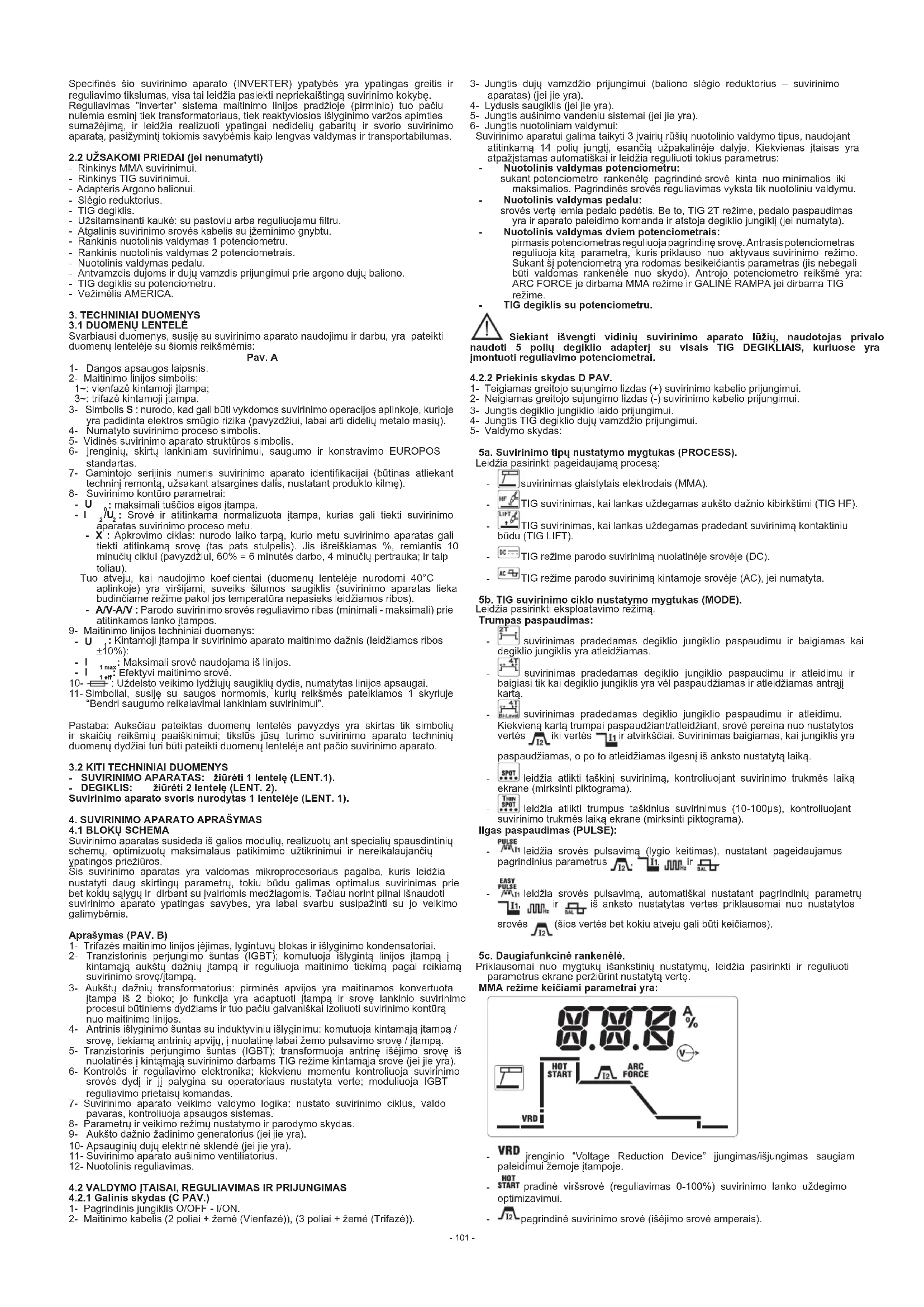 leidžia srovės pulsavimą, automatiškai nustatant pagrindinių parametrų , ir iš anksto nustatytas vertes priklausomai nuo nustatytos srovės (šios vertės bet kokiu atveju gali būti keičiamos). 5c.Daugiafunkcinėrankenėlė. Priklausomai nuo mygtukų išankstinių nustatymų, leidžia pasirinkti ir reguliuoti parametrus ekrane peržiūrint nustatytą vertę. MMArežimekeičiamiparametraiyra: - įrenginio “Voltage Reduction Device” įjungimas/išjungimas saugiam paleidimui žemoje įtampoje.