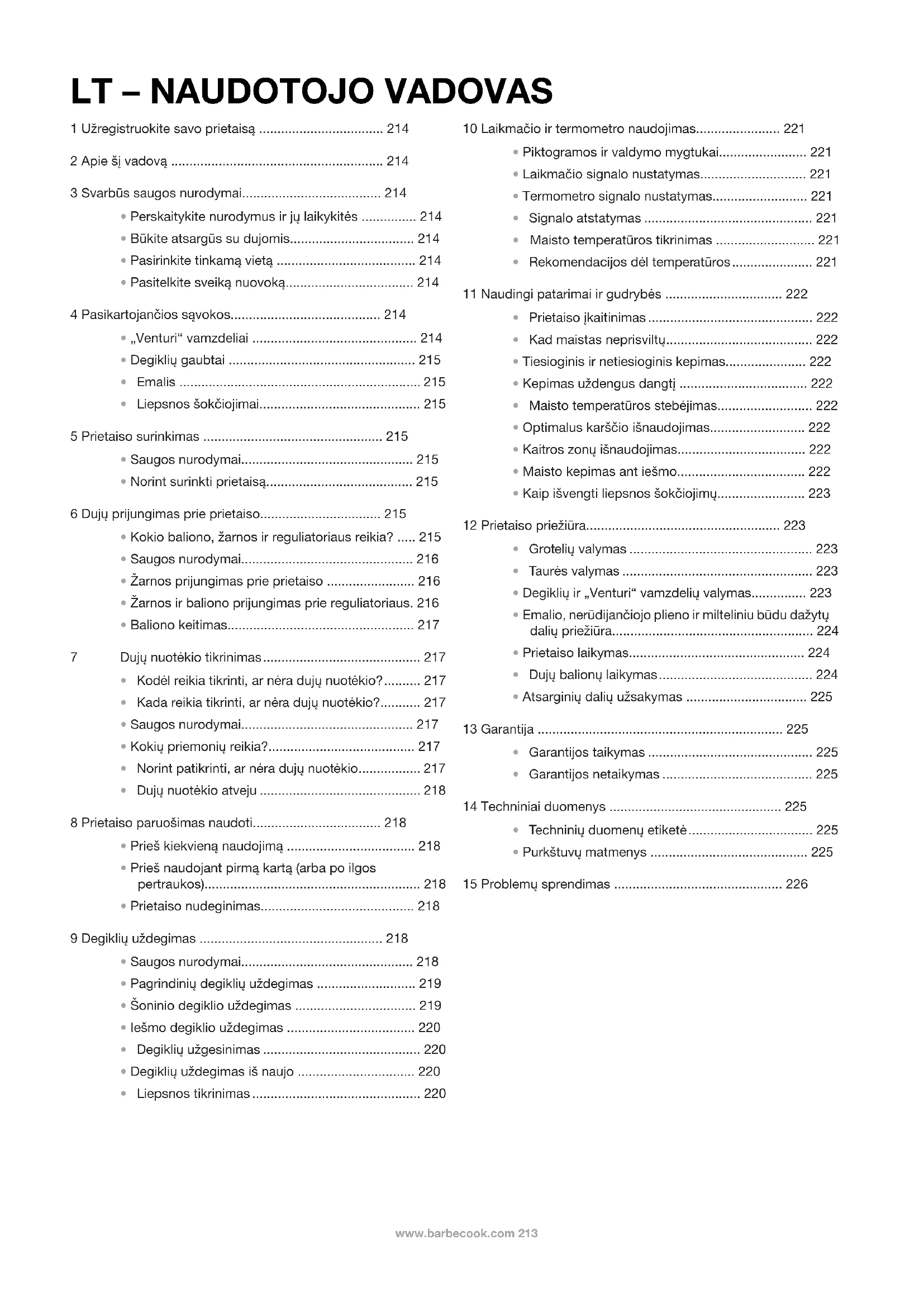 PRIETAISĄ Dėkojame, kad įsigijote „Barbecook“ prietaisą! Neabejojame, kad jis suteiks jums daug malonių akimirkų kepant ant kepsninės. Kad jūsų įspūdžiai naudojant mūsų prietaisą būtų dar geresni, užregistruokite jį adresu www.barbecook.com. Tai užtrunka tik kelias minutes, o jums atneša tokią naudą: