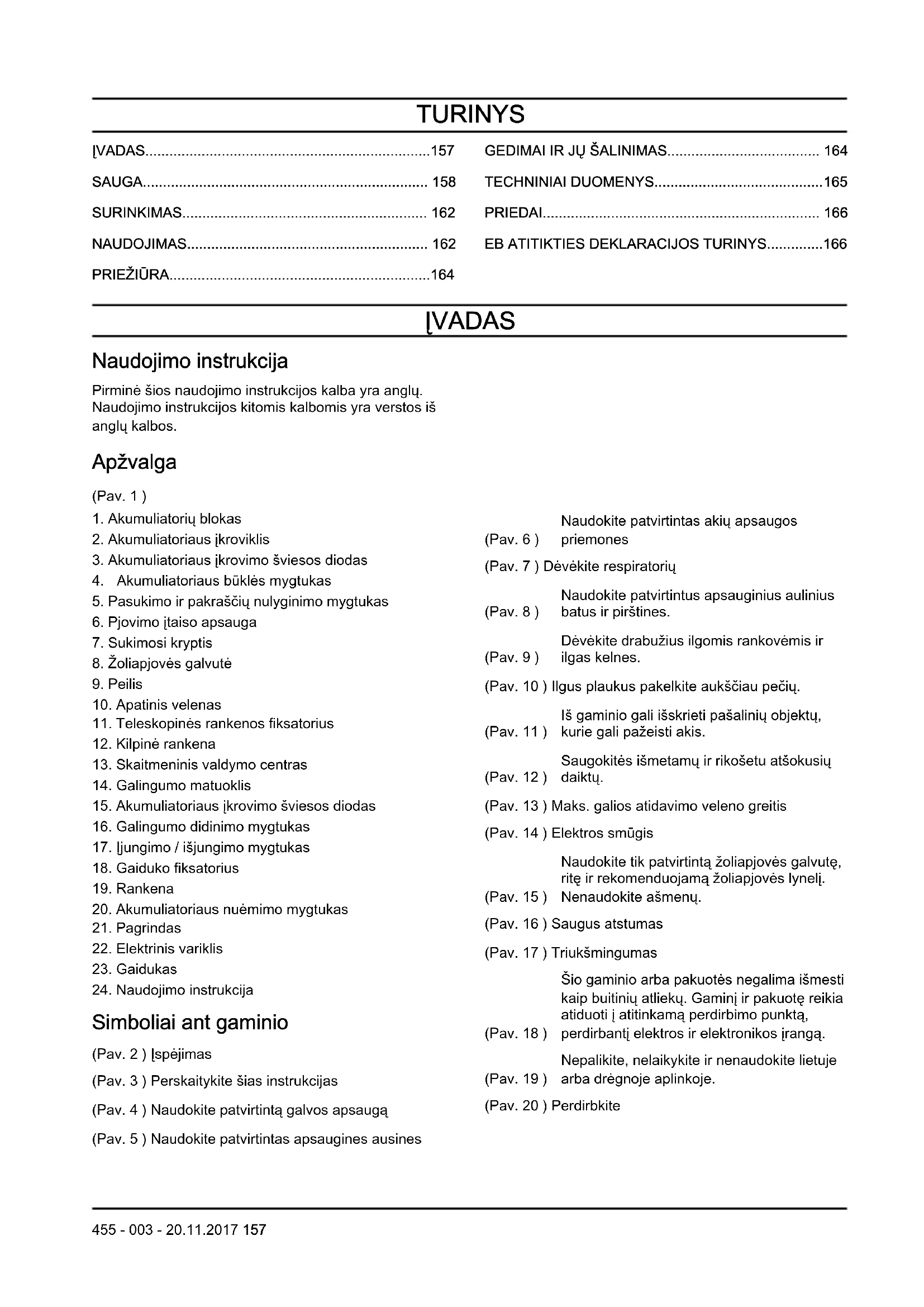 455 - 003 - 20.11.2017 161• Nenaudokite akumuliatorių bloko, neskirto naudoti su
