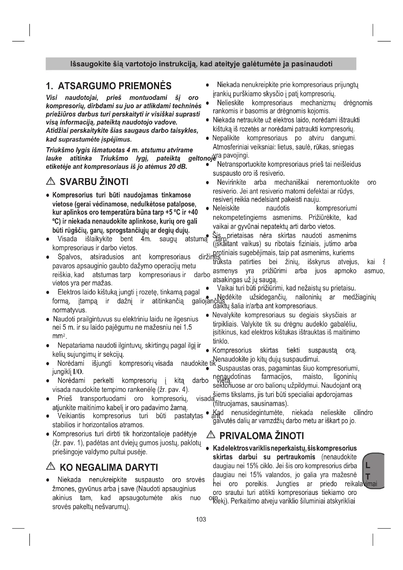 Visi naudotojai, prieš montuodami šį oro kompresorių,dirbdamisujuoaratlikdamitechninės priežiūrosdarbusturiperskaitytiirvisiškaisuprasti visąinformaciją,pateiktąnaudotojovadove. Atidžiaiperskaitykitešiassaugausdarbotaisykles, kadsuprastumėteįspėjimus. Triukšmolygisišmatuotas4m.atstumuatvirame lauke atitinka Triukšmo lygį, pateiktą geltonoje etiketėjeantkompresoriausišjoatėmus20dB. SVARBU ŽINOTI