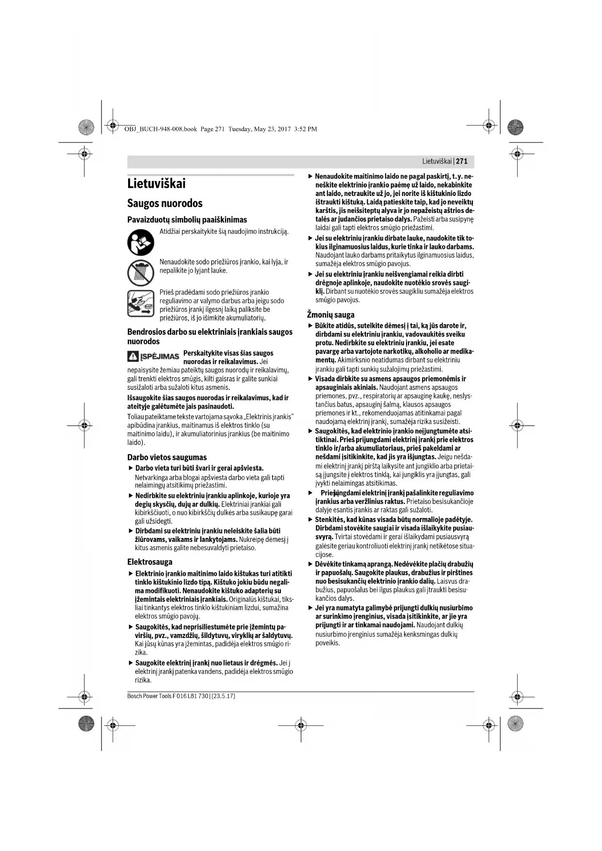 sadaļā „Ieteikumi akumulatora uzlādei“ Akumulators ir ticis uzglabāts pie temperatūras, kas ir ārpus pieļaujamo vērtību diapazona Nogaidiet, līdz akumulators uzsilst līdz istabas temperatūrai (līdz tā temperatūra sasniedz pieļaujamo vērtību diapazonu, kas ir no 0 līdz 45 °C) OBJ_BUCH-948-008.book Page 269 Tuesday, May 23, 2017 3:52 PM270 | Latviešu F 016 L81 730 | (23.5.17) Bosch Power Tools Klientu konsultāciju dienests un konsultācijas par lietošanu www.bosch-garden.com Pieprasot konsultācijas un pasūtot rezerves daļas, lūdzam noteikti paziņot desmitzīmju pasūtījuma numuru, kas norādīts uz dārza instrumenta marķējuma plāksnītes. Latvijas Republika Robert Bosch SIA Bosch elektroinstrumentu servisa centrs Mūkusalas ielā 97 LV-1004 Rīga Tālr.: 67146262 Telefakss: 67146263 E-pasts: service-pt@lv.bosch.com Transportēšana Uz izstrādājumam pievienotajiem litija-jonu akumulatoriem attiecas noteikumi par bīstamo kravu pārvadāšanu. Lietotājs var transportēt akumulatorus ielu transporta plūsmā bez papildu nosacījumiem. Pārsūtot tos ar trešo personu starpniecību (piemēram, ar gaisa transporta vai citu transporta aģentūru starpniecību), jāievēro īpaši sūtījuma iesaiņošanas un marķēšanas noteikumi. Tāpēc sūtījumu sagatavošanas laikā jāpieaicina kravu pārvadāšanas speciālists. Pārsūtiet akumulatoru tikai tad, ja tā korpuss nav bojāts. Aizlīmējiet vaļējos akumulatora kontaktus un iesaiņojiet akumulatoru tā, lai tas iesaiņojumā nepā rvietotos. Lūdzam ievērot arī ar akumulatoru pārsūtīšanu saistītos nacionālos noteikumus, ja tādi pastāv. Atbrīvošanās no nolietotajiem izstrādājumiem Nolietotie elektroinstrumenti, to piederumi un iesaiņojuma materiāli jānogādā otrreizējai pārstrādei apkārtējai videi nekaitīgā veidā. Neizmetiet dārza instrumentus, uzlādes ierīces un akumulatorus vai baterijas sadzīves atkritumu tvertnē! Tikai ES valstīm Atbilstoši Eiropas Savienības direktīvai 2012/19/ES, lietošanai nederīgās elektriskās un elektroniskās ierīces, kā arī, atbilstoši direktīvai 2006/66/EK, bojātie vai nolietotie akumulatori un baterijas jāsavāc atsevišķi un jānogādā otrreizējai pārstrādei apkārtējai videi nekaitīgā veidā. Akumulatori un baterijas Litija-jonu akumulatori Lūdzam ievērot norādījumus, kas sniegti sadaļā „Transportēšana“. Tiesības uz izmaiņām tiek saglabātas. Mirdzdiodes indikatori uz uzlādes ierīces deg pastāvīgi. Akumulatora uzlāde nenotiek Akumulators nav pievienots vai ir nepareizi pievienots uzlādes ierīcei Pareizi pievienojiet akumulatoru uzlādes ierīcei Akumulatora kontakti ir netīri Notīriet akumulatora kontaktus, piemē- ram, vairākkārt pievienojot akumulatoru uzlādes ierīcei un atvienojot no tās, vai arī nomainiet akumulatoru Akumulators ir bojāts Nomainiet akumulatoru Mirdzdiodes indikatori uz uzlādes ierīces nedeg. Uzlādes ierīces kontaktdakša nav pievie- nota vai ir slikti pievienota elektrotīkla kontaktligzdai Pievienojiet elektrobarošanas bloku elektrotīklam vai stingrāk iebīdiet tā kontaktdakšu elektrotīkla kontaktligzdā Ir bojāta elektrotīkla kontaktligzda, sa- vienojošais kabelis vai uzlādes ierīce Pārbaudiet spriegumu elektrotīkla kontaktligzdā vai nogādājiet uzl ādes ierīci pārbaudei Bosch pilnvarotā elek- troinstrumentu remonta darbnīcā Pazīme Iespējamais cēlonis Novēršana OBJ_BUCH-948-008.book Page 270 Tuesday, May 23, 2017 3:52 PMLietuviškai | 271 Bosch Power Tools F 016 L81 730 | (23.5.17) Lietuviškai Saugos nuorodos Pavaizduotų simbolių paaiškinimas Atidžiai perskaitykite šią naudojimo instrukciją. Nenaudokite sodo priežiūros įrankio, kai lyja, ir nepalikite jo lyjant lauke. Prieš pradėdami sodo priežiūros įrankio reguliavimo ar valymo darbus arba jeigu sodo priežiūros įrankį ilgesnį laiką paliksite be priežiūros, iš jo išimkite akumuliatorių. Bendrosios darbo su elektriniais įrankiais saugos nuorodos Perskaitykite visas šias saugos nuorodas ir reikalavimus. Jei nepaisysite žemiau pateiktų saugos nuorodų ir reikalavimų, gali trenkti elektros smūgis, kilti gaisras ir galite sunkiai susižaloti arba sužaloti kitus asmenis. Išsaugokite šias saugos nuorodas ir reikalavimus, kad ir ateityje galėtumėte jais pasinaudoti. Toliau pateiktame tekste vartojama sąvoka „Elektrinis įrankis“ apibūdina įrankius, maitinamus iš elektros tinklo (su maitinimo laidu), ir akumuliatorinius įrankius (be maitinimo laido). Darbo vietos saugumas Darbo vieta turi būti švari ir gerai apšviesta. Netvarkinga arba blogai apšviesta darbo vieta gali tapti nelaimingų atsitikimų priežastimi. Nedirbkite su elektriniu įrankiu aplinkoje, kurioje yra degių skysčių, dujų ar dulkių. Elektriniai įrankiai gali kibirkščiuoti, o nuo kibirkščių dulkės arba susikaupę garai gali užsidegti. Dirbdami su elektriniu įrankiu neleiskite šalia būti žiūrovams, vaikams ir lankytojams. Nukreipę dėmesį į kitus asmenis galite nebesuvaldyti prietaiso. Elektrosauga Elektrinio įrankio maitinimo laido kištukas turi atitikti tinklo kištukinio lizdo tipą. Kištuko jokiu būdu negali- ma modifikuoti. Nenaudokite kištuko adapterių su įžemintais elektriniais įrankiais. Originalūs kištukai, tiks- liai tinkantys elektros tinklo kištukiniam lizdui, sumažina elektros smūgio pavojų. Saugokitės, kad neprisiliestumėte prie įžemintų pa- viršių, pvz., vamzdžių, šildytuvų, viryklių ar šaldytuvų. Kai jūsų kūnas yra įžemintas, padidėja elektros smūgio ri- zika. Saugokite elektrinį įrankį nuo lietaus ir drėgmės. Jei į elektrinį įrankį patenka vandens, padidėja elektros smūgio rizika. Nenaudokite maitinimo laido ne pagal paskirtį, t.y. ne- neškite elektrinio įrankio paėmę už laido, nekabinkite ant laido, netraukite už jo, jei norite iš kištukinio lizdo ištraukti kištuką. Laidą patieski