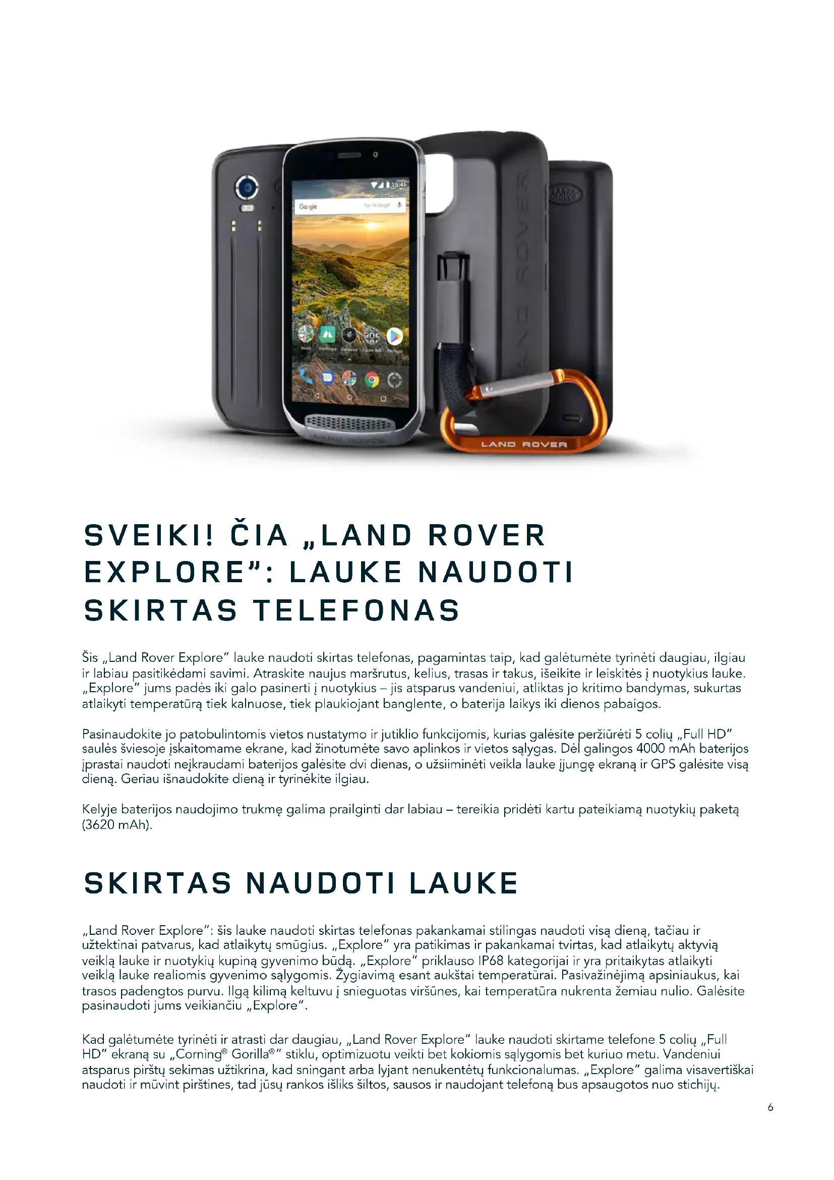 „LandRoverExplore”:šislaukenaudotiskirtastelefonaspakankamaistilingasnaudotivisądieną,tačiauir užtektinaipatvarus,kadatlaikytųsmūgius.„Explore”yrapatikimasirpakankamaitvirtas,kadatlaikytųaktyvią veikląlaukeirnuotykiųkupinągyvenimobūdą.„Explore”priklausoIP68kategorijaiiryrapritaikytasatlaikyti veikląlaukerealiomisgyvenimosąlygomis.Žygiavimąesantaukštaitemperatūrai.Pasivažinėjimąapsiniaukus,kai trasospadengtospurvu.Ilgąkilimąkeltuvuįsnieguotasviršūnes,kaitemperatūranukrentažemiaunulio.Galėsite pasinaudotijumsveikiančiu„Explore”. Kadgalėtumėtetyrinėtiiratrastidardaugiau,„LandRoverExplore”laukenaudotiskirtametelefone5colių„Full HD”ekranąsu„Corning