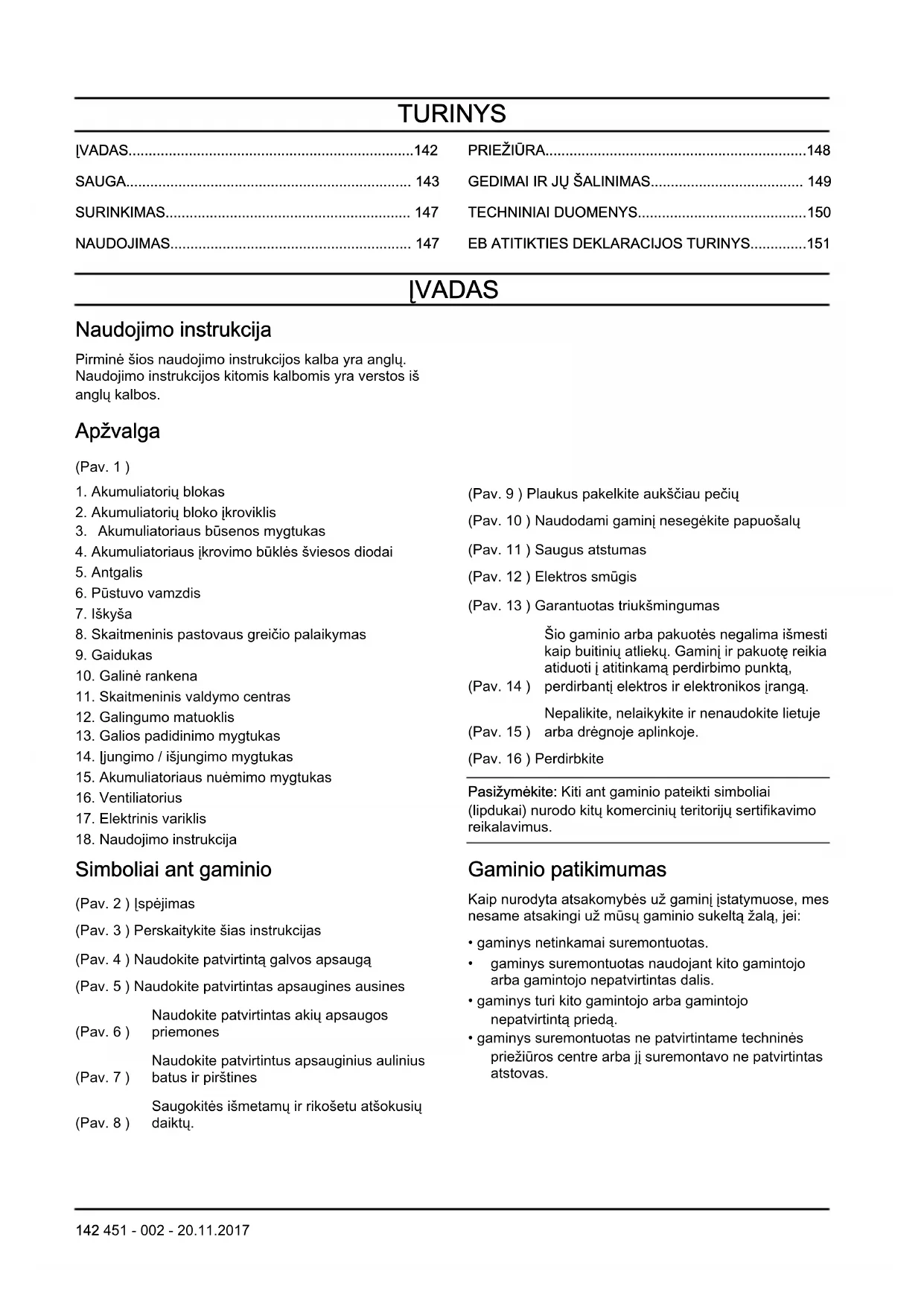 | Prie7ei fra ir remontas | Reguliariai tikrinkite akumuliatoriaus b6bsen05, valykite oro filtr2f, laikykit17s naudojimo instrukcij73 rekomendacij73 |