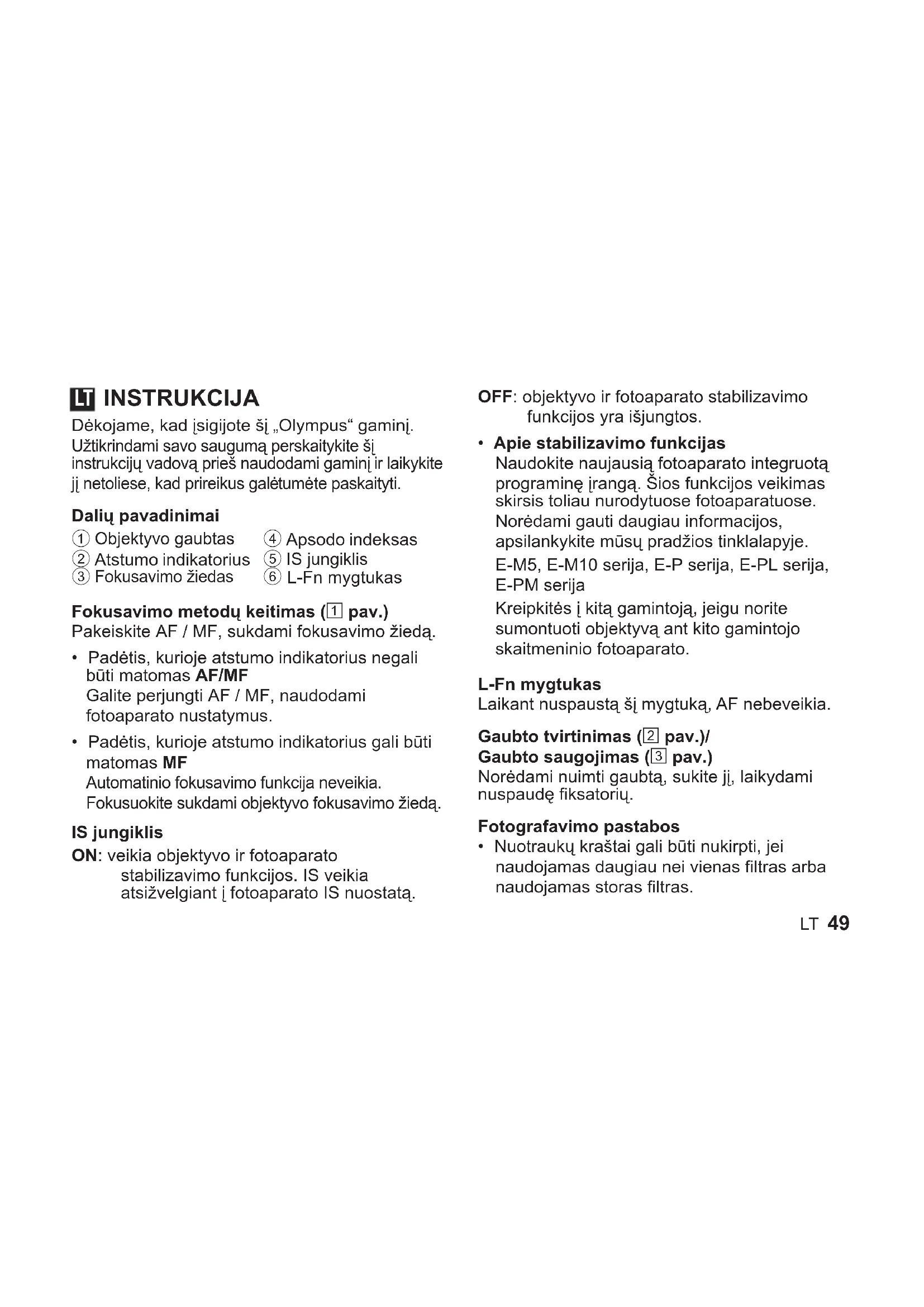 - Apie stabilizavimo funkcijas Naudokite naujausią fotoaparato integruotą programinę įrangą. Šios funkcijos veikimas skirsis toliau nurodytuose fotoaparatuose. Norėdami gauti daugiau informacijos, apsilankykite mūsų pradžios tinklalapyje. E-M5, E-M10 serija, E-P serija, E-PL serija, E-PM serija Kreipkitės į kitą gamintoją, jeigu norite sumontuoti objektyvą ant kito gamintojo skaitmeninio fotoaparato. L-Fn mygtukas Laikant nuspaustą šį mygtuką, AF nebeveikia. Gaubto tvirtinimas (2 pav.)/ Gaubto saugojimas (3 pav.) Norėdami nuimti gaubtą, sukite jį, laikydami nuspaudę fiksatorių. Fotografavimo pastabos