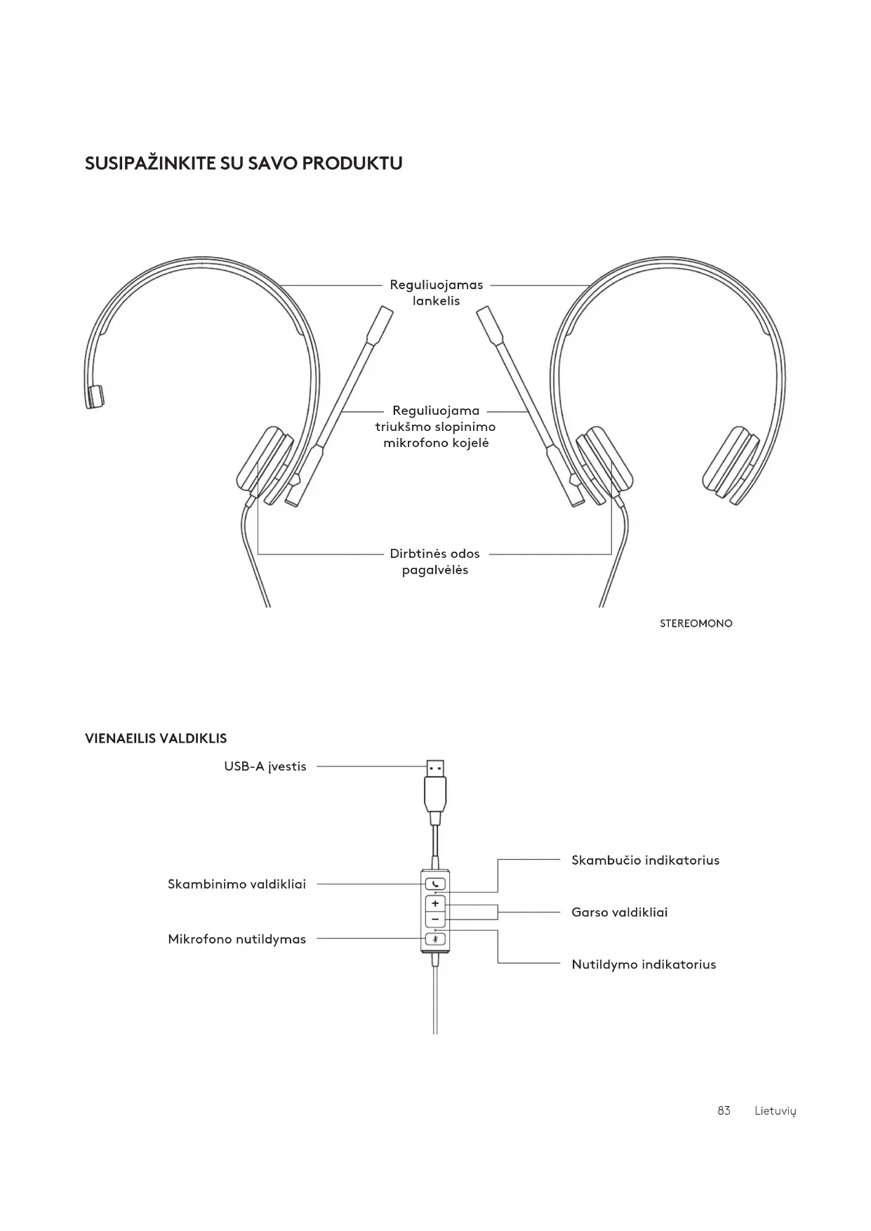 TEHNISKĀ SPECIFIKĀCIJASUSIPAŽINKITE SU SAVO PRODUKTU VIENAEILIS VALDIKLIS Reguliuojamas lankelis USB-A įvestis Skambinimo valdikliai Mikrofono nutildymas Reguliuojama triukšmo slopinimo mikrofono kojelė Dirbtinės odos pagalvėlės STEREOMONO Garso valdikliai Skambučio indikatorius Nutildymo indikatorius 83 LietuviųAUSINIŲ SUREGULIAVIMAS Sureguliuokite ausines atidarydami arba uždarydami galvos juostą iš abiejų pusių.