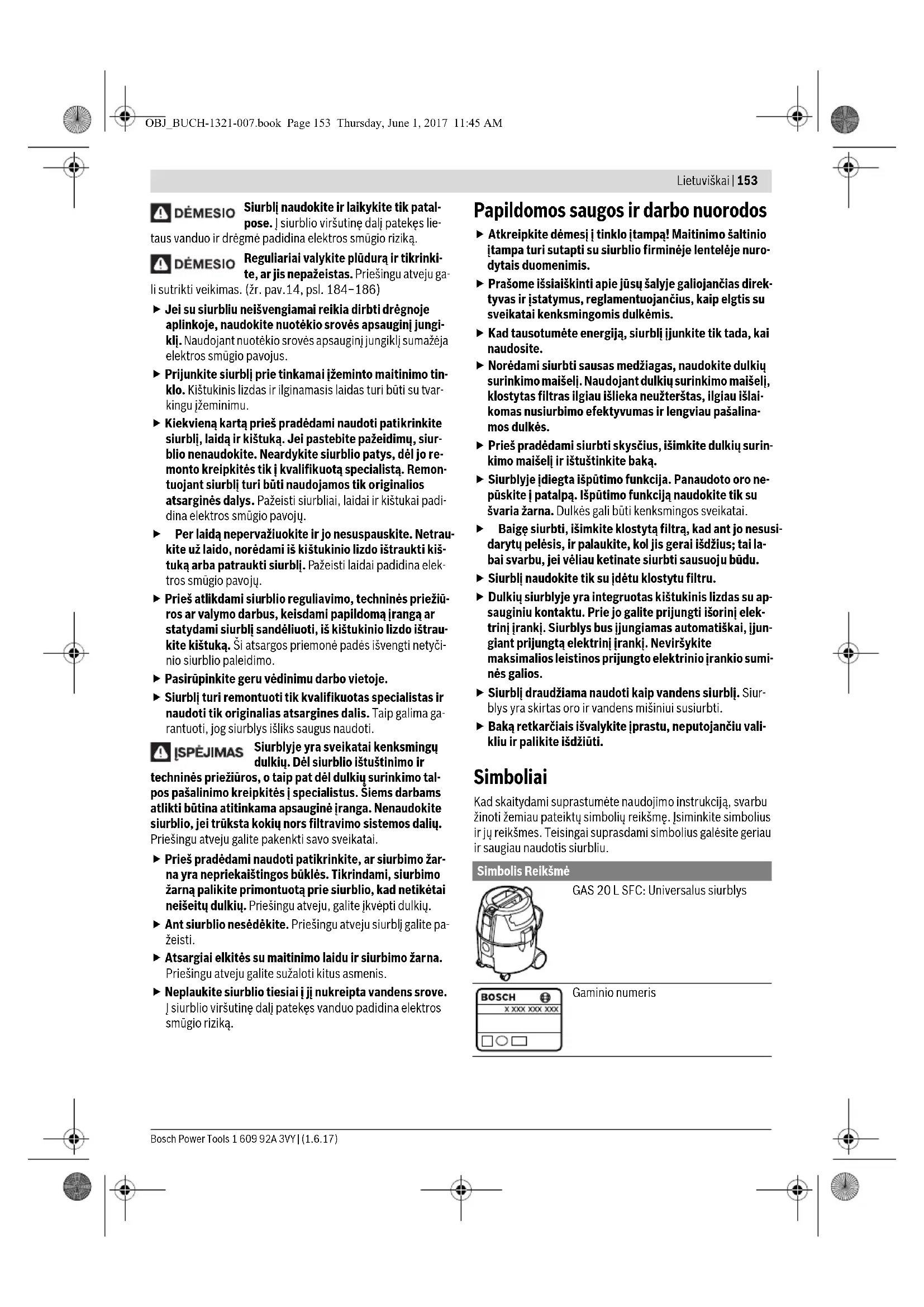 Ieloču filtra nomaiņa 13 182 – 183 Pludiņa tīrīšana 14 184 – 186 Piederumu izvēle – 187 Darbība un tās mērķis Attēls Ievērojiet šo Lappuse BRIDINAJUMS OBJ_BUCH-1321-007.book Page 151 Thursday, June 1, 2017 11:45 AM152 | Lietuviškai 1 609 92A 3VY | (1.6.17) Bosch Power Tools nu vai remontu, nepieciešams utilizēt visas tā stipri piesārņo- tās daļas, kuras nav iespējams apmierinoši notīrīt. Šīs daļas pirms utilizēšanas jāievieto hermētiskos maisos, atbilstoši spēkā esošajiem noteikumiem par atbrīvošanos no šādiem at- kritumiem. Veicot vakuumsūcēja apkalpošanu, lietotājam tas jāizjauc, jā- iztīra un jāveic tā apkalpošana tā, lai netiktu apdraudēta ap- kalpojošā personāla un citu personu veselība. Lai samazinātu apkalpošanas darbu bīstamību, vakuumsūcējs pirms izjauk- šanas jāiztīra. Telpai, kurā vakuumsūcēju paredzēts izjaukt, jābūt labi ventilējamai. Apkalpošanas laikā izmantojiet indivi- duālos darba aizsardzības līdzekļus. Pēc vakuumsūcēja apkal- pošanas rūpīgi jāiztīra darba vieta un jānotīra tās tuvumā eso- šie objekti. Ja nepieciešams nomainīt elektrotīkla kabeli, tas jāveic firmas Bosch elektroinstrumentu servisa centrā vai Bosch pilnvarotā elektroinstrumentu remonta darbnīcā, jo tā tiks saglabāts va- jadzīgais darba drošības līmenis. Klientu konsultāciju dienests un kon- sultācijas par lietošanu Klientu konsultāciju dienesta darbinieki atbildēs uz Jūsu jau- tājumiem par izstrādājuma remontu un apkalpošanu, kā arī par rezerves daļu iegādi. Izklājuma zīmējumus un informāciju par rezerves daļām var atrast arī interneta vietnē: www.bosch-pt.com Bosch klientu konsultāciju grupa centīsies Jums palīdzēt vis- labākajā veidā, sniedzot atbildes uz jautājumiem par mūsu iz- strādājumiem un to piederumiem. Pieprasot konsultācijas un pasūtot rezerves daļas, noteikti paziņojiet 10 zīmju izstrādājuma numuru, kas norādīts uz iz- strādājuma marķējuma plāksnītes. Latvijas Republika Robert Bosch SIA Bosch elektroinstrumentu servisa centrs Mūkusalas ielā 97 LV-1004 Rīga Tālr.: 67146262 Telefakss: 67146263 E-pasts: service-pt@lv.bosch.com Atbrīvošanās no nolietotajiem izstrā- dājumiem Nolietotais vakuumsūcējs, tā piederumi un iesaiņojuma mate- riāli jāpakļauj otrreizējai pārstrādei apkārtējai videi nekaitīgā veidā. Neizmetiet vakuumsūcēju sadzīves atkritumu tvert- nē! Tikai ES valstīm Atbilstoši Eiropas Savienības direktīvai 2012/19/EU par no- lietotajām elektroiekārtām un elektroniskajām iekārtām un šīs direktīvas atspoguļojumiem nacionālajā likumdošanā, visi lie- tošanai nederīgie vakuumsūcēji jāsavāc atsevišķi un jāpakļauj otrreizējai pārstrādei apkārtējai videi nekaitīgā veidā. Tiesības uz izmaiņām tiek saglabātas. Lietuviškai Saugos nuorodos Perskaitykite visas šias saugos nuorodas ir reikalavimus. Jei nepaisysite žemiau pateik- tų saugos nuorodų ir reikalavimų, gali trenkti elektros smūgis, kilti gaisras ir galite sunkiai susižaloti arba sužaloti kitus asmenis. Išsaugokite šią instrukciją. Šis siurblys nėra skirtas, kad juo naudotųsi vaikai ar asmenys su fizi- nėmis, jutiminėmis ir dvasinėmis negaliomis arba asmenys, kuriems trūksta patirties arba žinių. Priešin- gu atveju įrankis gali būti valdomas netinkamai ir kyla sužeidimų pavojus. Prižiūrėkite vaikus. Taip bus užti- krinta, kad vaikai su siurbliu nežaistų. Nesiurbkite buko, ąžuolo, uolienų dulkių ir asbesto. Šios medžiagos laikomos vėžį sukeliančiomis. Siurblį naudokite tik tada, jei gavote pakankamai informacijos apie jo nau- dojimą, apie medžiagas, kurias galima siurbti, ir kaip šias medžiagas saugiai pašalinti. Rūpestingai instruktavus su- mažėja netinkamo naudojimo ir sužalojimų tikimybė. Siurblys skirtas sausoms medžia- goms siurbti, o naudojant tinkamas priemones – taip pat ir skysčiams siurbti. Į vidų patekęs skystis padidina elektros smūgio riziką. Nesiurbkite siurbliu degių ir sprogių skysčių, pavyz- džiui, benzino, alyvos, alkoholio, tirpiklių. Nesiurbkite karštų ir degančių dulkių. Nenaudokite siurblio spro- giose patalpose. Dulkės, garai ir skysčiai gali užsidegti ir sprogti. Kištukinį lizdą naudokite tik naudoji- mo instrukcijoje nurodytu tikslu. Jei iš siurblio pradeda tekėti putos ir vanduo, siurblį nedelsdami išjunkite ir ištuštinkite baką. Priešingu atveju galite pažeisti siurblį. OBJ_BUCH-1321-007.book Page 152 Thursday, June 1, 2017 11:45 AMLietuviškai | 153 Bosch Power Tools 1 609 92A 3VY | (1.6.17) Siurblį naudokite ir laikykite tik patal- pose. Į siurblio viršutinę dalį patekęs lie- taus vanduo ir drėgmė padidina elektros smūgio riziką. Reguliariai valykite plūdurą ir tikrinki- te, ar jis nepažeistas. Priešingu atveju ga- li sutrikti veikimas. (žr. pav.14, psl. 184–186) Jei su siurbliu neišvengiamai reikia dirbti drėgnoje aplinkoje, naudokite nuotėkio srovės apsauginį jungi- klį. Naudojant nuotėkio srovės apsauginį jungiklį sumažėja elektros smūgio pavojus. Prijunkite siurblį prie tinkamai įžeminto maitinimo tin- klo. Kištukinis lizdas ir ilginamasis laidas turi būti su tvar- kingu įžeminimu. Kiekvieną kartą prieš pradėdami naudoti patikrinkite siurblį, laidą ir kištuką. Jei pastebite pažeidimų, siur- blio nenaudokite. Neardykite siurblio patys, dėl jo re- monto kreipkitės tik į kvalifikuotą specialistą. Remon- tuojant siurblį turi būti naudojamos tik originalios atsarginės dalys. Pažeisti siurbliai, laidai ir kištukai padi- dina elektros smūgio pavojų. Per laidą nepervažiuokite ir jo nesuspauskite. Netrau- kite už laido, norėdami iš kištukinio lizdo ištraukti kiš- tuką arba patraukti siurblį. P ažeisti laidai padidina elek- tros smūgio pavojų. Prieš atlikdami siurblio reguliavimo, techninės priežiū- ros ar valymo darbus, keisdami pa