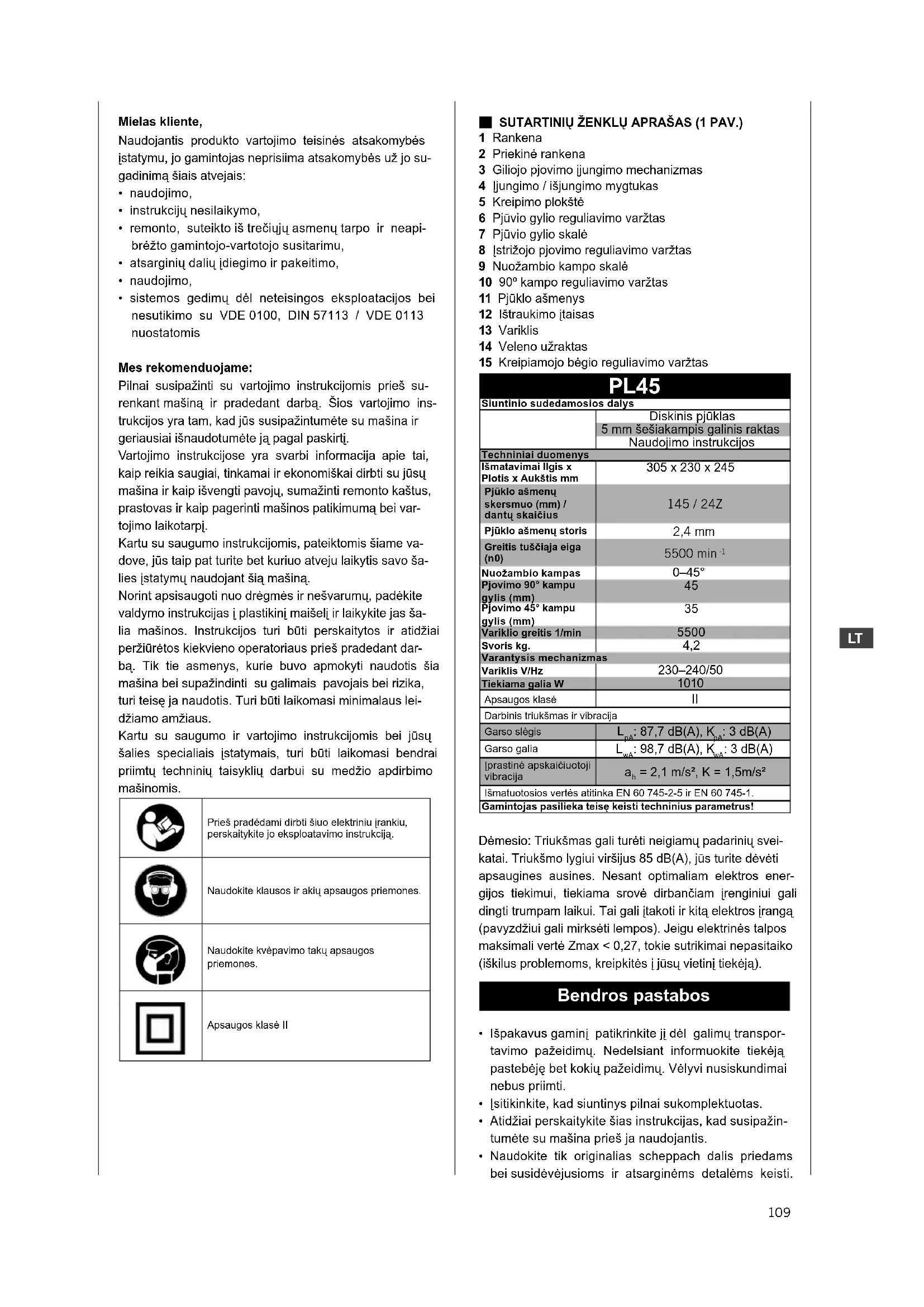 - sistemos gedimų dėl neteisingos eksploatacijos bei nesutikimo su VDE 0100, DIN 57113 / VDE 0113 nuostatomis Mes rekomenduojame: Pilnai susipažinti su vartojimo instrukcijomis prieš su- renkant mašiną ir pradedant darbą. Šios vartojimo ins- trukcijos yra tam, kad jūs susipažintumėte su mašina ir geriausiai išnaudotumėte ją pagal paskirtį. Vartojimo instrukcijose yra svarbi informacija apie tai, kaip reikia saugiai, tinkamai ir ekonomiškai dirbti su jūsų mašina ir kaip išvengti pavojų, sumažinti remonto kaštus, prastovas ir kaip pagerinti mašinos patikimumą bei var- tojimo laikotarpį. Kartu su saugumo instrukcijomis, pateiktomis šiame va- dove, jūs taip pat turite bet kuriuo atveju laikytis savo ša- lies įstatymų naudojant šią mašiną. Norint apsisaugoti nuo drėgmės ir nešvarumų, padėkite valdymo instrukcijas į plastikinį maišelį ir laikykite jas ša- lia mašinos. Instrukcijos turi būti perskaitytos ir atidžiai peržiūrėtos kiekvieno operatoriaus prieš pradedant dar- bą. Tik tie asmenys, kurie buvo apmokyti naudotis šia mašina bei supažindinti su galimais pavojais bei rizika, turi teisę ja naudotis. Turi būti laikomasi minimalaus lei- džiamo amžiaus. Kartu su saugumo ir vartojimo instrukcijomis bei jūsų šalies specialiais įstatymais, turi būti laikomasi bendrai priimtų techninių taisyklių darbui su medžio apdirbimo mašinomis. Prieš pradėdami dirbti šiuo elektriniu įrankiu, perskaitykite jo eksploatavimo instrukciją.Naudokite klausos ir akių apsaugos priemones.Naudokite kvėpavimo takų apsaugos priemones.Apsaugos klasė II SUTARTINIŲ ŽENKLŲ APRAŠAS (1 PAV.) 1 Rankena 2 Priekinė rankena 3 Giliojo pjovimo įjungimo mechanizmas 4 Įjungimo / išjungimo mygtukas 5 Kreipimo plokštė 6 Pjūvio gylio reguliavimo varžtas 7 Pjūvio gylio skalė 8 Įstrižojo pjovimo reguliavimo varžtas 9 Nuožambio kampo skalė 10 90º kampo reguliavimo varžtas 11 Pjūklo ašmenys 12 Ištraukimo įtaisas 13 Variklis 14 Veleno užraktas 15 Kreipiamojo bėgio reguliavimo varžtas PL45 Siuntinio sudedamosios dalys Diskinis pjūklas 5 mm šešiakampis galinis raktas Naudojimo instrukcijos Techniniai duomenysIšmatavimai Ilgis x Plotis x Aukštis mm 305 x 230 x 245 Pjūklo ašmenų skersmuo (mm) / dantų skaičius 145 / 24Z Pjūklo ašmenų storis 2,4 mm Greitis tuščiąja eiga (n0) 5500 min