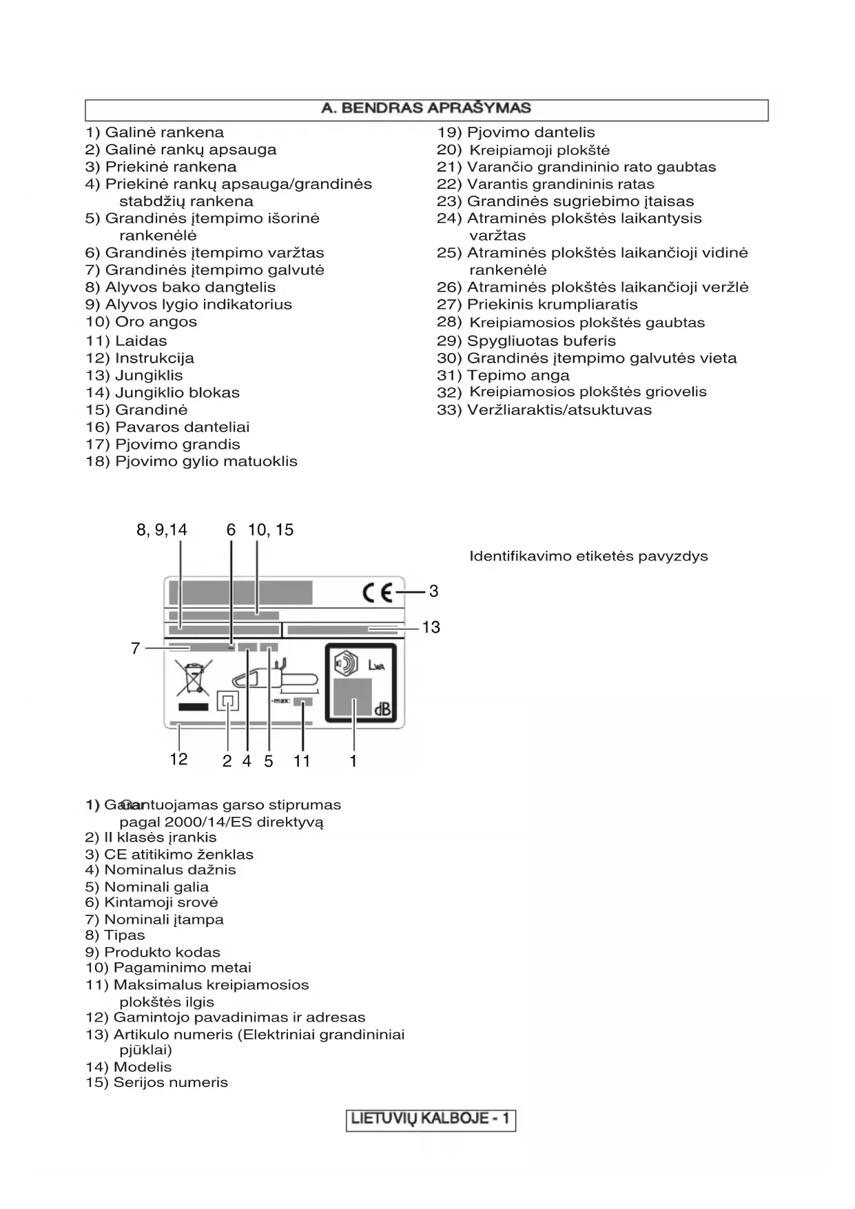 a) Jūsų turimą elektrinį įrankį leidžiama remontuoti tik kvalifikuotam specialistui, kuris detales keistų tik tokiomis pat detalėmis. Taip bus užtikrintas elektrinio prietaiso saugumas. Grandinio pjūklo saugos perspėjimai: