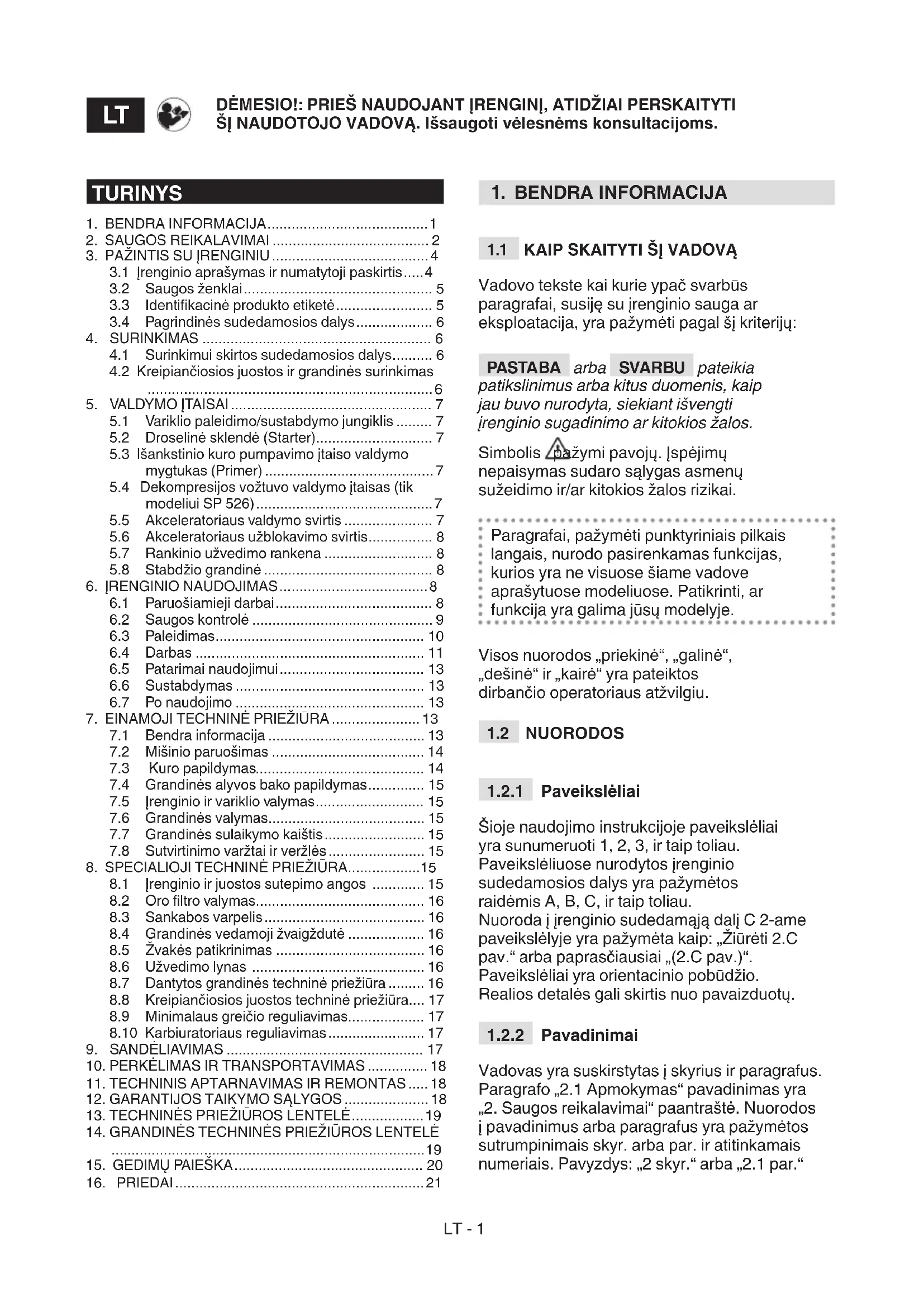 Vadovas yra suskirstytas į skyrius ir paragrafus. Paragrafo „2.1 Apmokymas“ pavadinimas yra „2. Saugos reikalavimai“ paantraštė. Nuorodos į pavadinimus arba paragrafus yra pažymėtos sutrumpinimais skyr. arba par. ir atitinkamais numeriais. Pavyzdys: „2 skyr.“ arba „2.1 par.“ DĖMESIO!: PRIEŠ NAUDOJANT ĮRENGINĮ, ATIDŽIAI PERSKAITYTI ŠĮ NAUDOTOJO VADOVĄ. Išsaugoti vėlesnėms konsultacijoms.