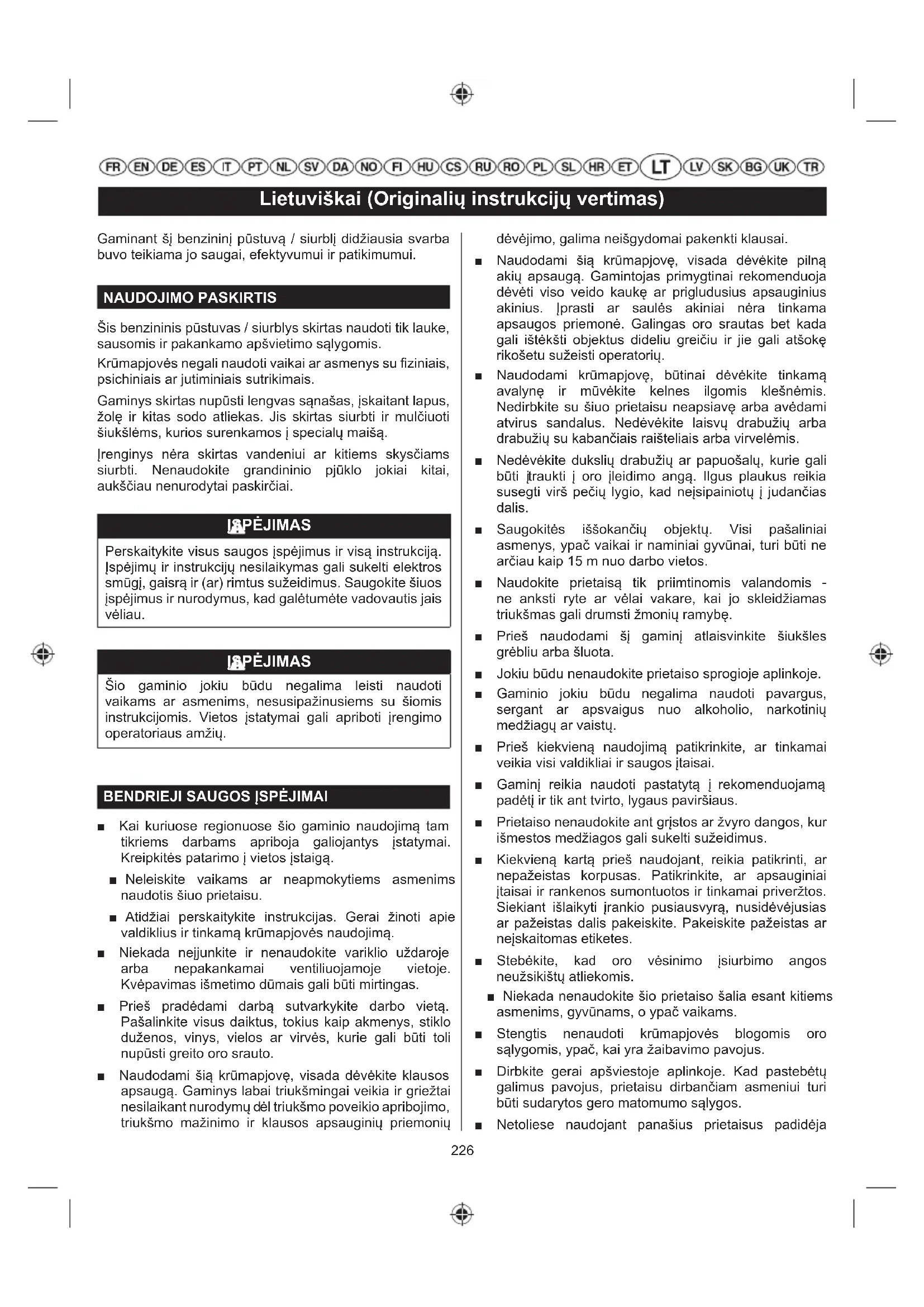 MÄRKUSED: ■ Kui toodet kasutatakse tolmuses keskkonnas, peab hooldust teostama tihedamini. ■ Kui toode on ületanud tabelis toodud maksimaalsed näitajad, peab hooldus toimuma ikkagi vastavalt siin näidatud intervallidele (kas perioodide või tundide järgi).226 Lietuviškai (Originalių instrukcijų vertimas) Gaminant šį benzininį pūstuvą / siurblį didžiausia svarba buvo teikiama jo saugai, efektyvumui ir patikimumui. NAUDOJIMO PASKIRTIS Šis benzininis pūstuvas / siurblys skirtas naudoti tik lauke, sausomis ir pakankamo apšvietimo sąlygomis. Krūmapjovės negali naudoti vaikai ar asmenys su fi ziniais, psichiniais ar jutiminiais sutrikimais. Gaminys skirtas nupūsti lengvas sąnašas, įskaitant lapus, žolę ir kitas sodo atliekas. Jis skirtas siurbti ir mulčiuoti šiukšlėms, kurios surenkamos į specialų maišą. Įrenginys nėra skirtas vandeniui ar kitiems skysčiams siurbti. Nenaudokite grandininio pjūklo jokiai kitai, aukščiau nenurodytai paskirčiai. ĮSPĖJIMAS Perskaitykite visus saugos įspėjimus ir visą instrukciją. Įspėjimų ir instrukcijų nesilaikymas gali sukelti elektros smūgį, gaisrą ir (ar) rimtus sužeidimus. Saugokite šiuos įspėjimus ir nurodymus, kad galėtumėte vadovautis jais vėliau. ĮSPĖJIMAS Šio gaminio jokiu būdu negalima leisti naudoti vaikams ar asmenims, nesusipažinusiems su šiomis instrukcijomis. Vietos įstatymai gali apriboti įrengimo operatoriaus amžių.