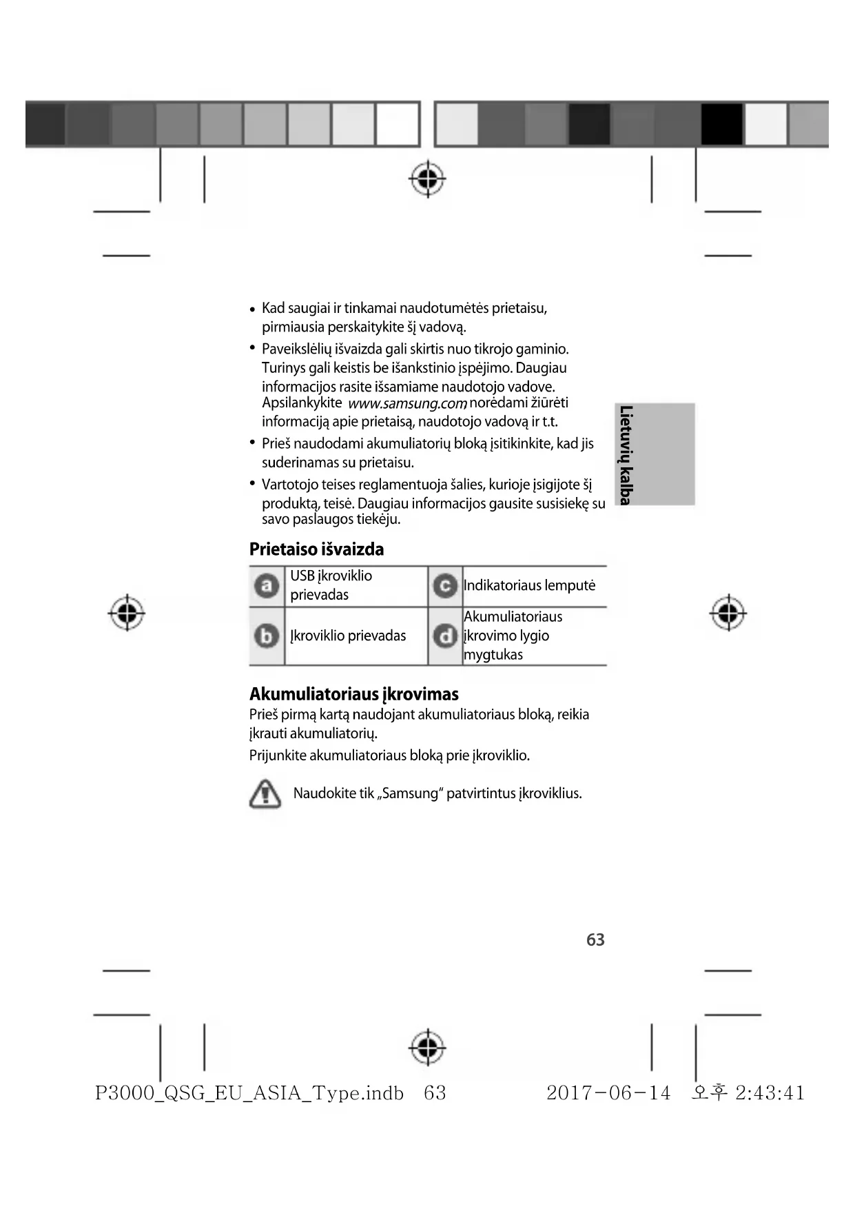 Vartotojo teises reglamentuoja šalies, kurioje įsigijote šį produktą, teisė. Daugiau informacijos gausite susisiekę su savo paslaugos tiekėju. Prietaiso išvaizda USB įkroviklio prievadas Indikatoriaus lemputė Įkroviklio prievadas Akumuliatoriaus įkrovimo lygio mygtukas Akumuliatoriaus įkrovimas Prieš pirmą kartą naudojant akumuliatoriaus bloką, reikia įkrauti akumuliatorių. Prijunkite akumuliatoriaus bloką prie įkroviklio. Naudokite tik „Samsung“ patvirtintus įkroviklius. Lietuvių kalba P3000_QSG_EU_ASIA_Type.indb 63P3000_QSG_EU_ASIA_Type.indb 63 2017-06-14 오후 2:43:412017-06-14 오후 2:43:4164