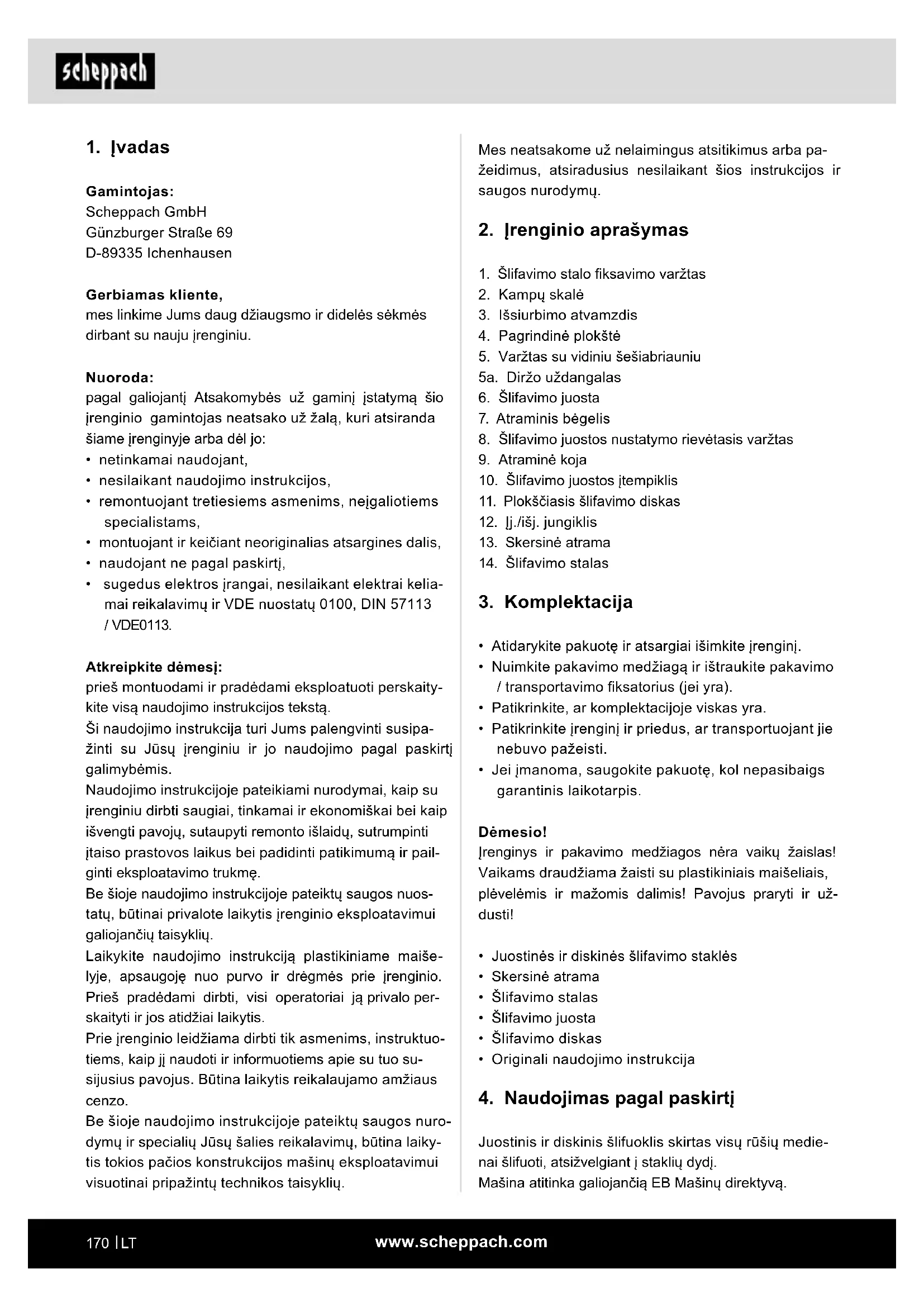 Gamintojas: Scheppach GmbH Günzburger Straße 69 D-89335 Ichenhausen Gerbiamas kliente, mes linkime Jums daug džiaugsmo ir didelės sėkmės dirbant su nauju įrenginiu. Nuoroda: pagal galiojantį Atsakomybės už gaminį įstatymą šio įrenginio gamintojas neatsako už žalą, kuri atsiranda šiame įrenginyje arba dėl jo: