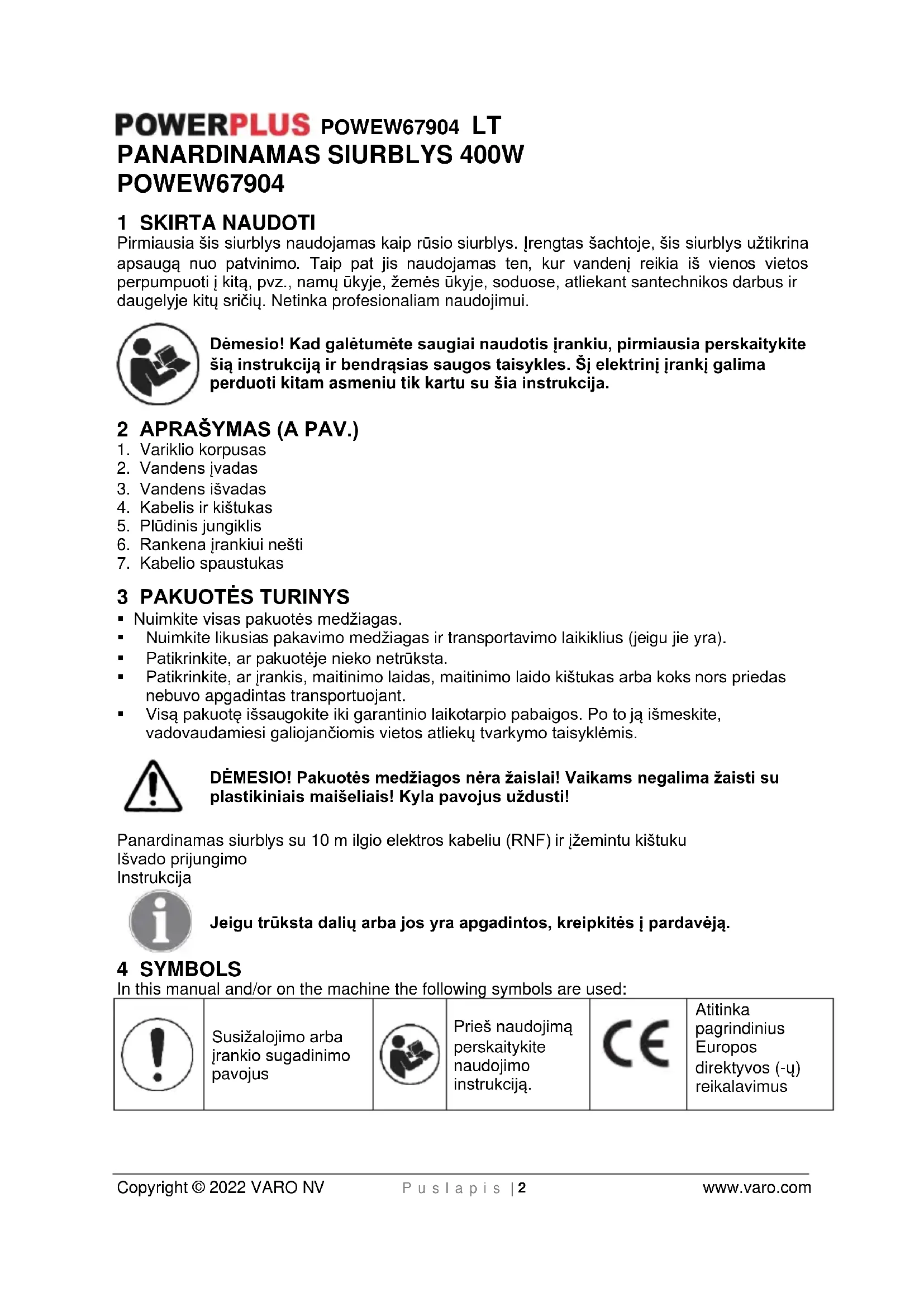 - Neišardytas prietaisas privalo būti grąžintas atstovui priimtinai švarus (originaliame išlietame dėkle, jeigu įrenginys buvo jame pristatytas), pateikiant pirkimo įrodymą. 15 APLINKOSAUGA Jeigu po ilgo naudojimo seną prietaisą reikėtų pakeisti nauju, neišmeskite jo kartu su buitinėmis atliekomis; atiduokite jį į atitinkamą atliekų surinkimo ir perdirbimo punktą. Senų elektrinių įrenginių atliekų negalima išmesti ir tvarkyti kaip įprastas buitines atliekas. Atiduokite juos pakartotiniam panaudojimui, jei yra tokia galimybė. Dėl pakartotiniam panaudojimui surenkamų atliekų taisyklių jūsų šalyje, pasikonsultuokite su vietos valdžia ar prekybos atstovu.POWEW67904 LT Copyright © 2022 VARO NV P u s l a p i s | 8 www.varo.com 16 ATITIKTIES DEKLARACIJA VARO – Vic. Van Rompuy N.V. - Joseph Van Instraat 9 - BE2500 Lier - BELGIUM, pareiškia, kad, gaminys: PANARDINAMAS SIURBLYS 400W prekės ženklas: POWERplus modelis: POWEW67904 remiantis Europos suderintų standartų taikymu, atitinka galiojančių Europos Sąjungos direktyvų pagrindinius reikalavimus ir kitas atitinkamas jų sąlygas. Bet koks neįgaliotas šio aparato pakeitimas panaikina šią deklaraciją. Europos direktyvos (įskaitant, jeigu taikytina, jų dalinius pakeitimus, priimtus iki pasirašymo datos): 2011/65/EU 2014/35/EU 2014/30/EU Suderinti Europos standartai (įskaitant, jeigu taikytina, jų dalinius pakeitimus, priimtus iki pasirašymo datos): EN60335-1 : 2012 EN60335-2-41: 2003 EN55014-1 : 2017 EN55014-2 : 2015