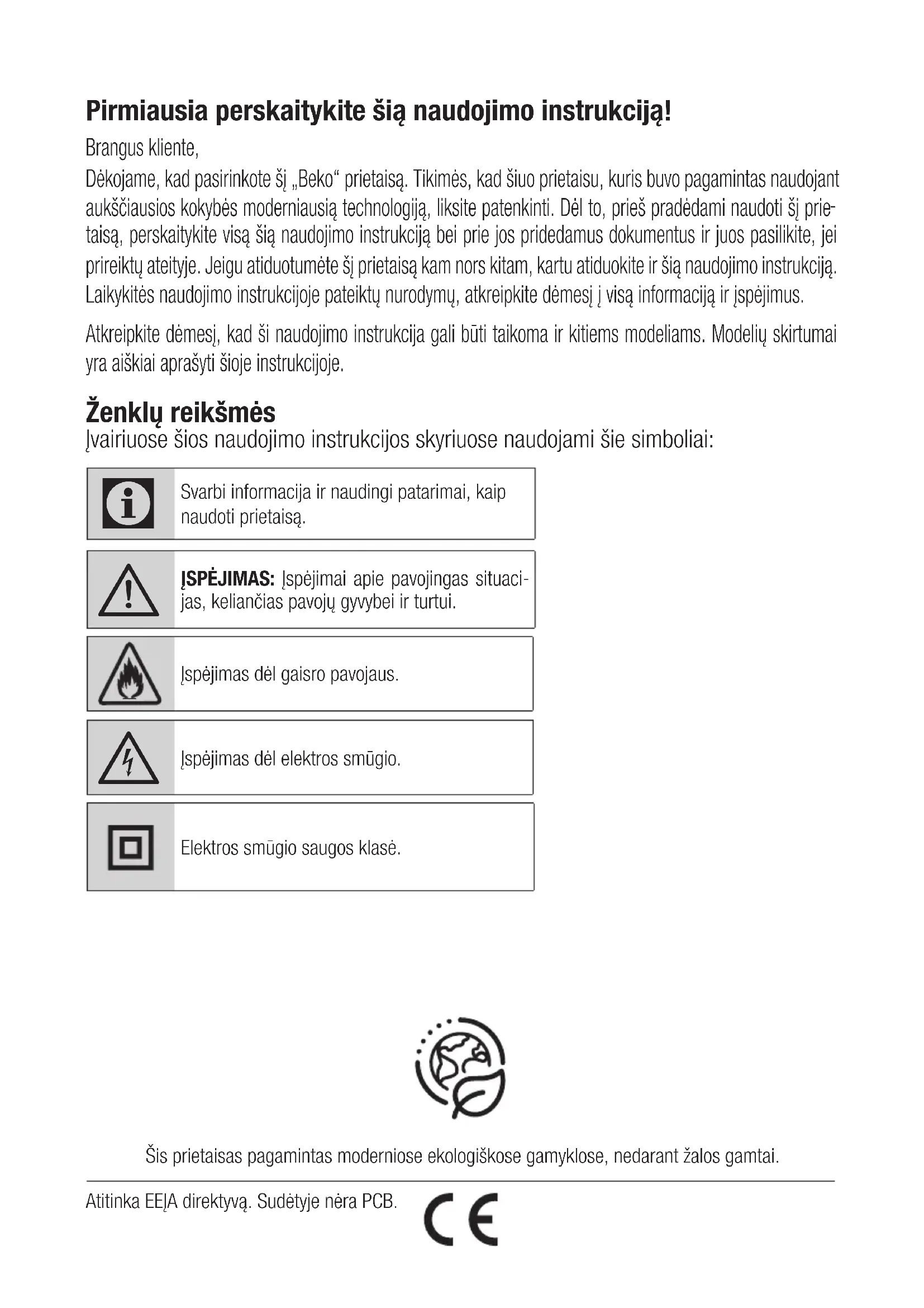 - „Beko“ gaminiai atitinka galiojančius saugos standartus, todėl, jeigu prietaisas arba jo maitinimo laidas būtų pažeistas, jį privalo paleisti platintojas, aptarnavimo centras ar specialistas arba bet kuris kitas įgaliotasis atstovas, kad būtų išvengta bet kokių pavojų. Klaidingi arba netinkami re