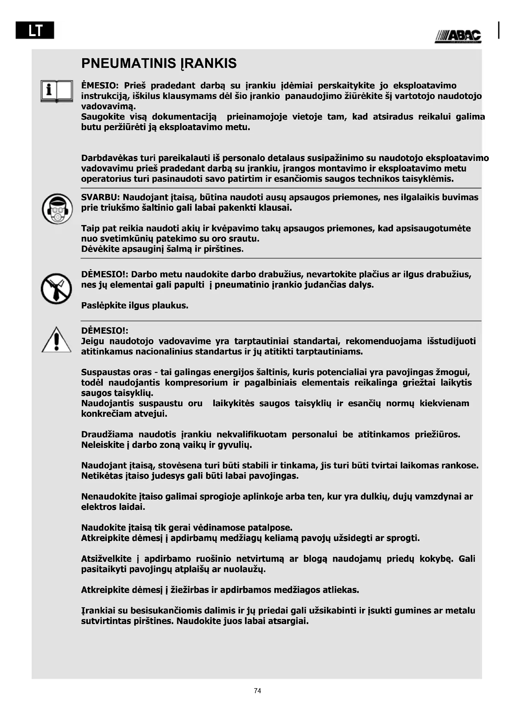 PNEUMATINIS ĮRANKIS ĖMESIO: Prieš pradedant darbą su įrankiu įdėmiai perskaitykite jo eksploatavimo instrukciją, iškilus klausymams dėl šio įrankio panaudojimo žiūrėkite šį vartotojo naudotojo vadovavimą. Saugokite visą dokumentaciją prieinamojoje vietoje tam, kad atsiradus reikalui galima butu peržiūrėti ją eksploatavimo metu. Darbdavėkas turi pareikalauti iš personalo detalaus susipažinimo su naudotojo eksploatavimo vadovavimu prieš pradedant darbą su įrankiu, įrangos montavimo ir eksploatavimo metu operatorius turi pasinaudoti savo patirtim ir esančiomis saugos technikos taisyklėmis. SVARBU: Naudojant įtaisą, būtina naudoti ausų apsaugos priemones, nes ilgalaikis buvimas prie triukšmo šaltinio gali labai pakenkti klausai. Taip pat reikia naudoti akių ir kvėpavimo takų apsaugos priemones, kad apsisaugotumėte nuo svetimkūnių patekimo su oro srautu. Dėvėkite apsauginį šalmą ir pirštines. DĖMESIO!: Darbo metu naudokite darbo drabužius, nevartokite plačius ar ilgus drabužius, nes jų elementai gali papulti į pneumatinio įrankio judančias dalys. Paslėpkite ilgus plaukus. DĖMESIO!: Jeigu naudotojo vadovavime yra tarptautiniai standartai, rekomenduojama išstudijuoti atitinkamus nacionalinius standartus ir jų atitikti tarptautiniams. Suspaustas oras - tai galingas energijos šaltinis, kuris potencialiai yra pavojingas žmogui, todėl naudojantis kompresorium ir pagalbiniais elementais reikalinga griežtai laikytis saugos taisyklių. Naudojantis suspaustu oru laikykitės saugos taisyklių ir esančių normų kiekvienam konkrečiam atvejui. Draudžiama naudotis įrankiu nekvalikuotam personalui be atitinkamos priežiūros. Neleiskite į darbo zoną vaikų ir gyvulių. Naudojant įtaisą, stovėsena turi būti stabili ir tinkama, jis turi būti tvirtai laikomas rankose. Netikėtas įtaiso judesys gali būti labai pavojingas. Nenaudokite įtaiso galimai sprogioje aplinkoje arba ten, kur yra dulkių, dujų vamzdynai ar elektros laidai. Naudokite įtaisą tik gerai vėdinamose patalpose. Atkreipkite dėmesį į apdirbamų medžiagų keliamą pavojų užsidegti ar sprogti. Atsižvelkite į apdirbamo ruošinio netvirtumą ar blogą naudojamų priedų kokybę. Gali pasitaikyti pavojingų atplaišų ar nuolaužų. Atkreipkite dėmesį į žiežirbas ir apdirbamos medžiagos atliekas. Įrankiai su besisukančiomis dalimis ir jų priedai gali užsikabinti ir įsukti gumines ar metalu sutvirtintas pirštines. Naudokite juos labai atsargiai.75