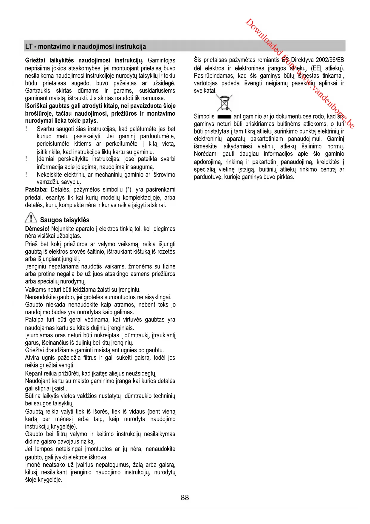 Downloaded from www.vandenborre.be88 LT - montavimo ir naudojimosi instrukcija Griežtai laikykitės naudojimosi instrukcijų. Gamintojas neprisiima jokios atsakomybės, jei montuojant prietaisą buvo nesilaikoma naudojimosi instrukcijoje nurodytų taisyklių ir tokiu būdu prietaisas sugedo, buvo pažeistas ar užsidegė. Gartraukis skirtas dūmams ir garams, susidariusiems gaminant maistą, ištraukti. Jis skirtas naudoti tik namuose. Išoriškai gaubtas gali atrodyti kitaip, nei pavaizduota šioje brošiūroje, tačiau naudojimosi, priežiūros ir montavimo nurodymai lieka tokie patys. ! Svarbu saugoti šias instrukcijas, kad galėtumėte jas bet kuriuo metu pasiskaityti. Jei gaminį parduotumėte, perleistumėte kitiems ar perkeltumėte į kitą vietą, įsitikinkite, kad instrukcijos liktų kartu su gaminiu. ! Įdėmiai perskaitykite instrukcijas: jose pateikta svarbi informacija apie įdiegimą, naudojimą ir saugumą. ! Nekeiskite elektrinių ar mechaninių gaminio ar iškrovimo vamzdžių savybių. Pastaba: Detalės, pažymėtos simboliu (*), yra pasirenkami priedai, esantys tik kai kurių modelių komplektacijoje, arba detalės, kurių komplekte n ėra ir kurias reikia įsigyti atskirai. Saugos taisyklės Dėmesio! Nejunkite aparato į elektros tinklą tol, kol įdiegimas nėra visiškai užbaigtas. Prieš bet kokį priežiūros ar valymo veiksmą, reikia išjungti gaubtą iš elektros srovės šaltinio, ištraukiant kištuką iš rozetės arba išjungiant jungiklį. Įrenginiu nepatariama naudotis vaikams, žmonėms su fizine arba protine negalia be už juos atsakingo asmens priežiūros arba specialių nurodymų. Vaikams neturi būti leidžiama žaisti su įrenginiu. Nenaudokite gaubto, jei grotelės sumontuotos netaisyklingai. Gaubto niekada nenaudokite kaip atramos, nebent toks jo naudojimo būdas yra nurodytas kaip galimas. Patalpa turi būti gerai vėdinama, kai virtuvės gaubtas yra naudojamas kartu su kitais dujinių įrenginiais. Įsiurbiamas oras neturi būti nukreiptas į dūmtraukį, įtraukiantį garus, išeinančius iš dujinių bei kitų įrenginių. Griežtai draudžiama gaminti maistą ant ugnies po gaubtu. Atvira ugnis pažeidžia filtrus ir gali sukelti gaisrą, todėl jos reikia griežtai vengti. Kepant reikia prižiūrėti, kad įkaitęs aliejus neužsidegtų. Naudojant kartu su maisto gaminimo įranga kai kurios detalės gali stipriai įkaisti. Būtina laikytis vietos valdžios nustatytų dūmtraukio techninių bei saugos taisyklių. Gaubtą reikia valyti tiek iš išorės, tiek iš vidaus (bent vieną kartą per mėnesį arba taip, kaip nurodyta naudojimo instrukcijų knygelėje). Gaubto bei filtrų valymo ir keitimo instrukcijų nesilaikymas didina gaisro pavojaus riziką. Jei lempos neteisingai įmontuotos ar jų nėra, nenaudokite gaubto, gali įvykti elektros iškrova. Įmonė neatsako už įvairius nepatogumus, žalą arba gaisrą, kilusį nesilaikant įrenginio naudojimo instrukcijų, nurodytų šioje knygelėje. Šis prietaisas pažymėtas remiantis ES Direktyva 2002/96/EB dėl elektros ir elektroninės į rangos atliekų, (EEĮ atliekų). Pasirūpindamas, kad šis gaminys būtų išmestas tinkamai, vartotojas padeda išvengti neigiamų pasekmių aplinkai ir sveikatai. Simbolis ant gaminio ar jo dokumentuose rodo, kad šis gaminys neturi būti priskiriamas buitinėms atliekoms, o turi būti pristatytas į tam tikrą atliekų surinkimo punktą elektrinių ir elektroninių aparatų pakartotiniam panaudojimui. Gaminį išmeskite laikydamiesi vietinių atliekų šalinimo normų. Norėdami gauti daugiau informacijos apie šio gaminio apdorojimą, rinkimą ir pakartotinį panaudojimą, kreipkitės į specialią vietinę įstaigą, buitinių atliekų rinkimo centrą ar parduotuvę, kurioje gaminys buvo pirktas. Downloaded from www.vandenborre.be89 Naudojimas Gaubtas gali būti naudojamas oro ištraukimo į išorę režimu arba vidinės recirkuliacijos filtravimo režimu. Oro ištraukimo režimas Garai išstumiami į išorę per iškrovos vamzdį, pritvirtintą prie jungės. Vamzdžio skersmuo privalo atitikti sujungimo žiedo skersmenį. Dėmesio! Iškrovimo vamzdis nepridedamas, jį reikia pirkti atskirai. Horizontalioje dalyje vamzdis turi būti nukreiptas į viršų (apie 10° kampu), kad lengviau išstumtų orą į išorę. Jei gaubte yra anglies filtrų, juos reikia išimti. Prijungti gaubtą prie išvedamųjų vamzdžių ir išvedamųjų angų sienoje, kurių skersmuo atitiktų sandarinimo flanšą. Jei nutekėjimo žarnos ir angos sienoje yra mažesnio skersmens, sumažėja traukiamoji geba ir stipriai padidėja triukšmingumas. Gamintojas neprisiima su tuo susijusios atsakomybės. ! Naudokite pakankamo ilgio vamzdį. ! Naudokite kuo tiesesnį vamzdį (didžiausias vamzdžio nuokrypio kampas – 90°). ! Stenkitės iš esmės nekeisti vamzdžių sekcijų. ! Naudokite tuos vamzžius, kurių vidinės sienelės lygios. ! Vamzdžių medžiagos privalo atitikti nustatytas normas. Filtravimo režimas Prieš patekdamas į kambarį, įtraukiamas oras nuriebalinamas ir dezodoruojamas. Norėdami naudotis šios versijos filtru, privalote įdiegti papildomą filtravimo aktyviąja anglimi sistemą.