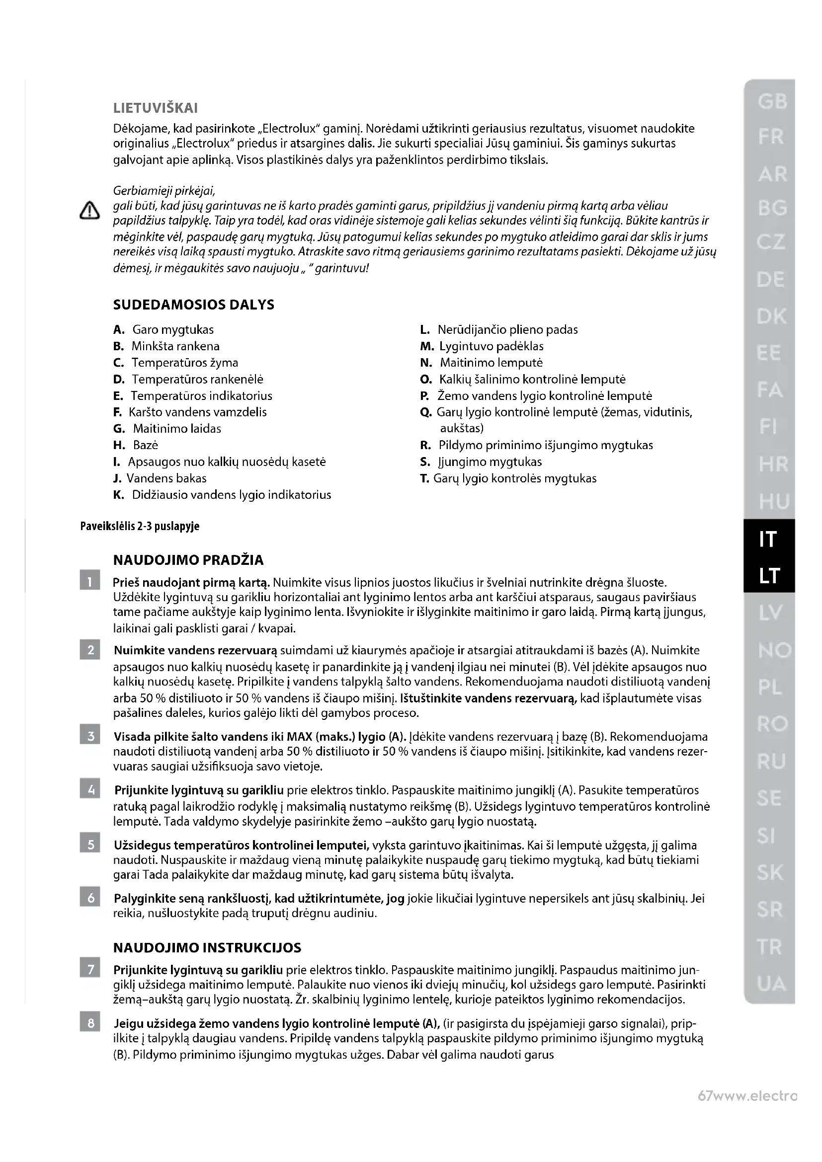 Dékojame, kad pasirinkote „Electrolux“ gaminj. Norédami uztkrinti geriausius rezultatus, visuomet naudokite originalius „Electrolux“ priedus ir atsargines dalis. Jie sukurti specialiai Jusu gaminuii. Sis gaminys sukurtas galvojant apie aplinka. Visos plastikines dalys yra pażenklintos perdirbimo tikslais.