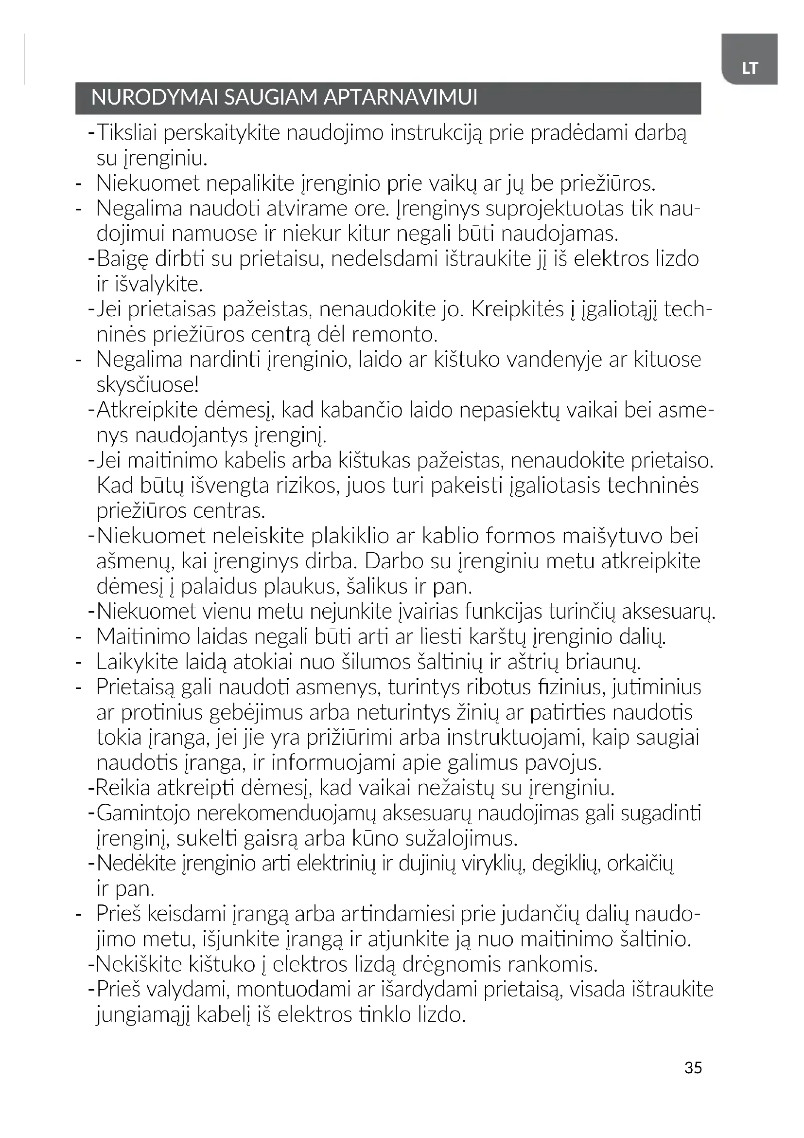 Jei prietaisas pažeistas, nenaudokite jo. Kreipkitės į įgaliotąjį tech- ninės priežiūros centrą dėl remonto. - Negalima nardin įrenginio, laido ar kištuko vandenyje ar kituose skysčiuose!
