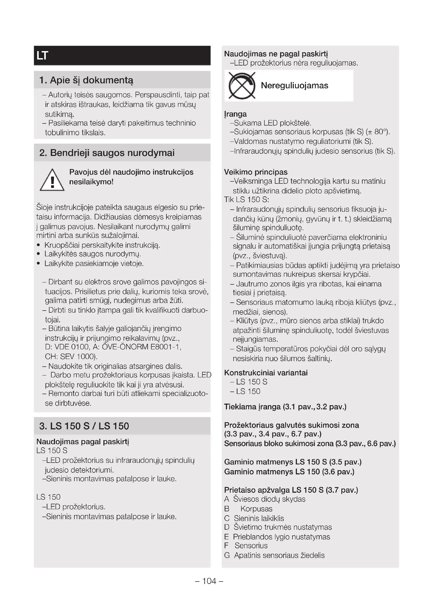 Naudojimas pagal paskirtį LS150S – LED prožektorius su infraraudonųjų spindulių judesio detektoriumi. – Sieninis montavimas patalpose ir lauke. LS150 – LED prožektorius. – Sieninis montavimas patalpose ir lauke. Naudojimas ne pagal paskirtį – LED prožektorius nėra reguliuojamas. Nereguliuojamas Įranga – Sukama LED plokštelė. – Sukiojamas sensoriaus korpusas (tik S) (±80°). – Valdomas nustatymo reguliatoriumi (tik S). – Infraraudonųjų spindulių judesio sensorius (tik S). Veikimo principas – Veiksminga LED technologija kartu su matiniu stiklu užtikrina didelio ploto apšvietimą. Tik LS 150 S: – Infraraudonųjų spindulių sensorius fiksuoja ju- dančių kūnų (žmonių, gyvūnų ir t. t.) skleidžiamą šiluminę spinduliuotę. – Šiluminė spinduliuotė paverčiama elektroniniu signalu ir automatiškai įjungia prijungtą prietaisą (pvz., šviestuvą). – Patikimiausias būdas aptikti judėjimą yra prietaiso sumontavimas nukreipus skersai krypčiai. – Jautrumo zonos ilgis yra ribotas, kai einama tiesiai į prietaisą. – Sensoriaus matomumo lauką riboja kliūtys (pvz., medžiai, sienos). – Kliūtys (pvz., mūro sienos arba stiklai) trukdo atpažinti šiluminę spinduliuotę, todėl šviestuvas neįjungiamas. – Staigūs temperatūros pokyčiai dėl oro sąlygų nesiskiria nuo šilumos šaltinių. Konstrukciniai variantai – LS150S – LS150 Tiekiama įranga (3.1pav., 3.2pav.) Prožektoriaus galvutės sukimosi zona (3.3pav., 3.4pav., 6.7 pav.) Sensoriaus bloko sukimosi zona (3.3pav., 6.6 pav.) Gaminio matmenys LS150S (3.5 pav.) Gaminio matmenys LS150 (3.6 pav.) Prietaiso apžvalga LS 150 S (3.7 pav.) A Šviesos diodų skydas B Korpusas C Sieninis laikiklis D Švietimo trukmės nustatymas E Prieblandos lygio nustatymas F Sensorius G Apatinis sensoriaus žiedelis– 105 – Prietaiso apžvalga LS 150 S (3.8 pav.) A Šviesos diodų skydas B Korpusas C Sieninis laikiklis Techniniai duomenys – Matmenys (A x P x G): LS 150 S: 210×155×176mm LS 150: 178×157×178mm – Galios suvartojimas („P